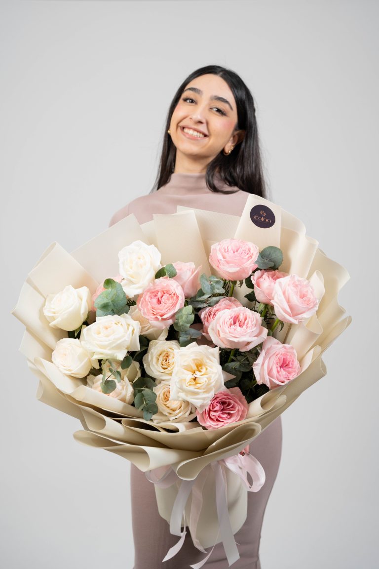 AED 198.00 – AED 600.00Price range: AED 198.00 through AED 600.00Soft Embrace is a gentle and elegant bouquet featuring blush pink and ivory roses accented with fresh eucalyptus, beautifully wrapped in soft neutral paper for a timeless and romantic floral gift.