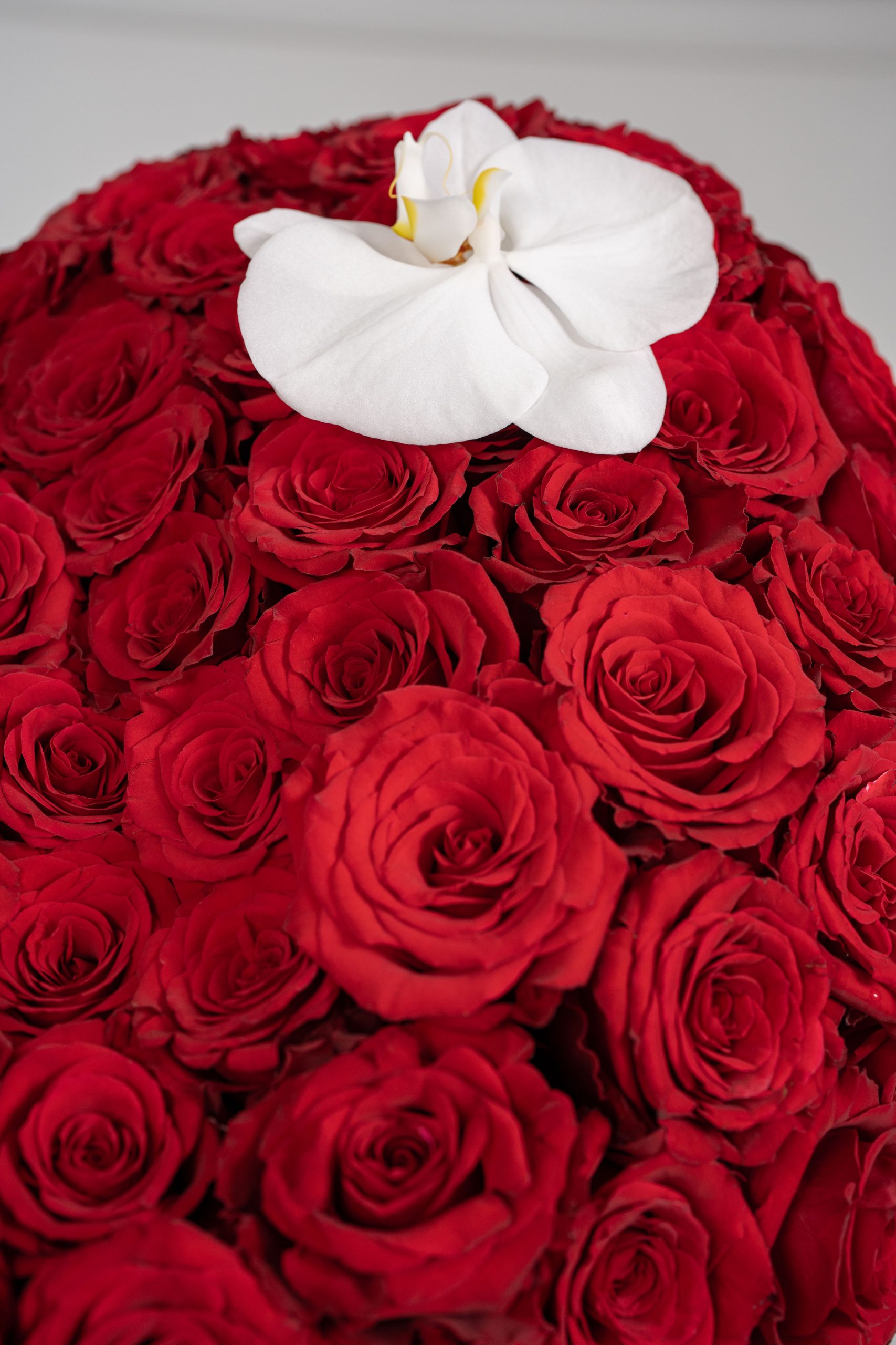 Each rose is carefully selected for its rich color and flawless form, creating a seamless, luxurious surface that radiates intensity and emotion. Accented with fresh green foliage at the base and elegantly finished with a refined ribbon detail, the arrangement balances grandeur with timeless elegance.