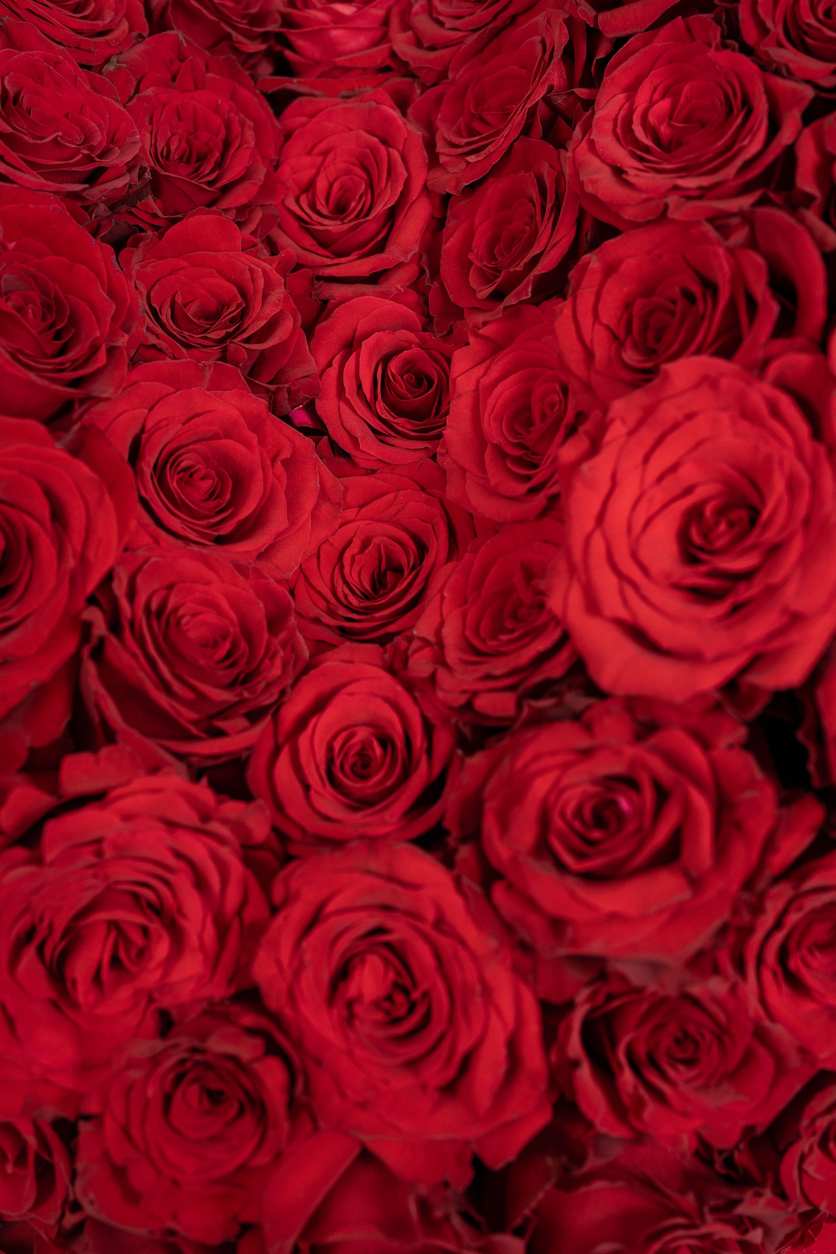 Each rose is carefully selected for its rich color and flawless form, creating a seamless, luxurious surface that radiates intensity and emotion. Accented with fresh green foliage at the base and elegantly finished with a refined ribbon detail, the arrangement balances grandeur with timeless elegance.