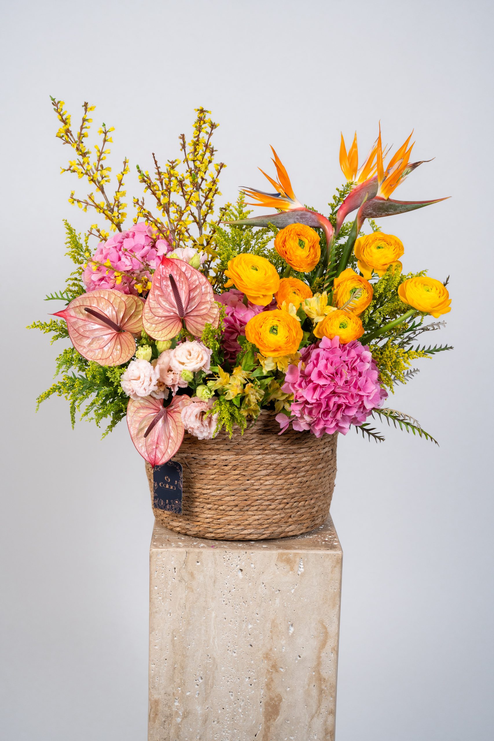 Amber Bloom Basket is a bold and artistic floral arrangement featuring vibrant orange ranunculus, exotic bird of paradise, soft pink hydrangeas, elegant anthuriums, and seasonal yellow accents, designed to make a striking and joyful statement.