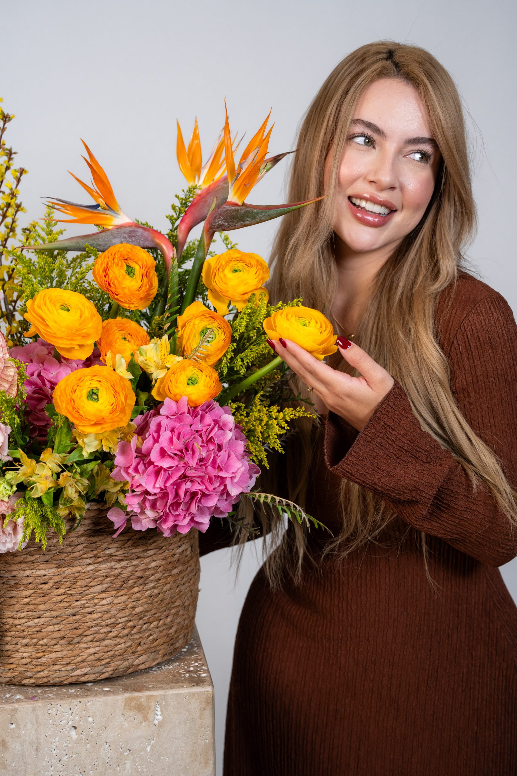 The warm amber and golden tones evoke energy, creativity, and confidence, while the soft pink elements add balance and a touch of romance. The bird of paradise introduces height and movement, giving the arrangement a sculptural, contemporary feel, while layered foliage enhances depth and natural flow. Designed in a woven basket, the overall composition feels both luxurious and organic.