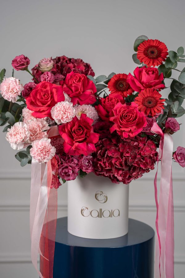 A passionate blend of red and pink blooms, beautifully arranged in a white luxury box and adorned with satin ribbons, celebrates love in its most elegant form.