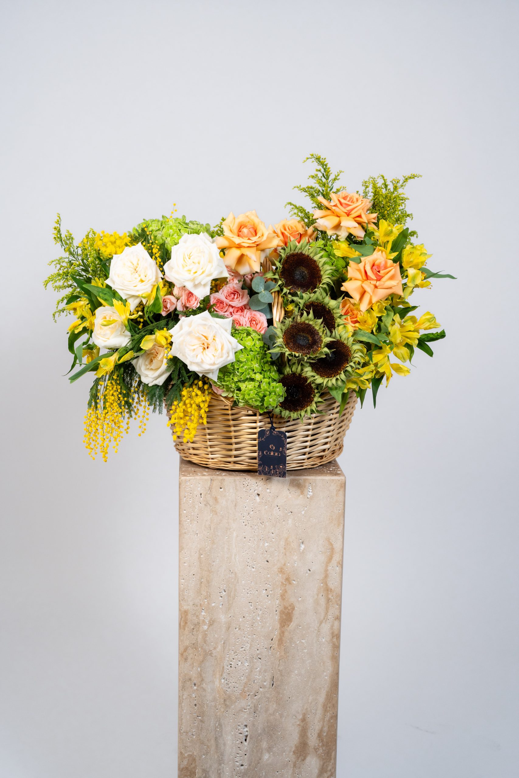 Autumn Sunshine is a glowing celebration of seasonal warmth and natural beauty. This abundant basket arrangement brings together rich sunflowers with deep centers, elegant peach and creamy white roses, fresh green hydrangeas, and bright yellow blooms, all thoughtfully layered with textured greenery for a full, harvest-inspired look.