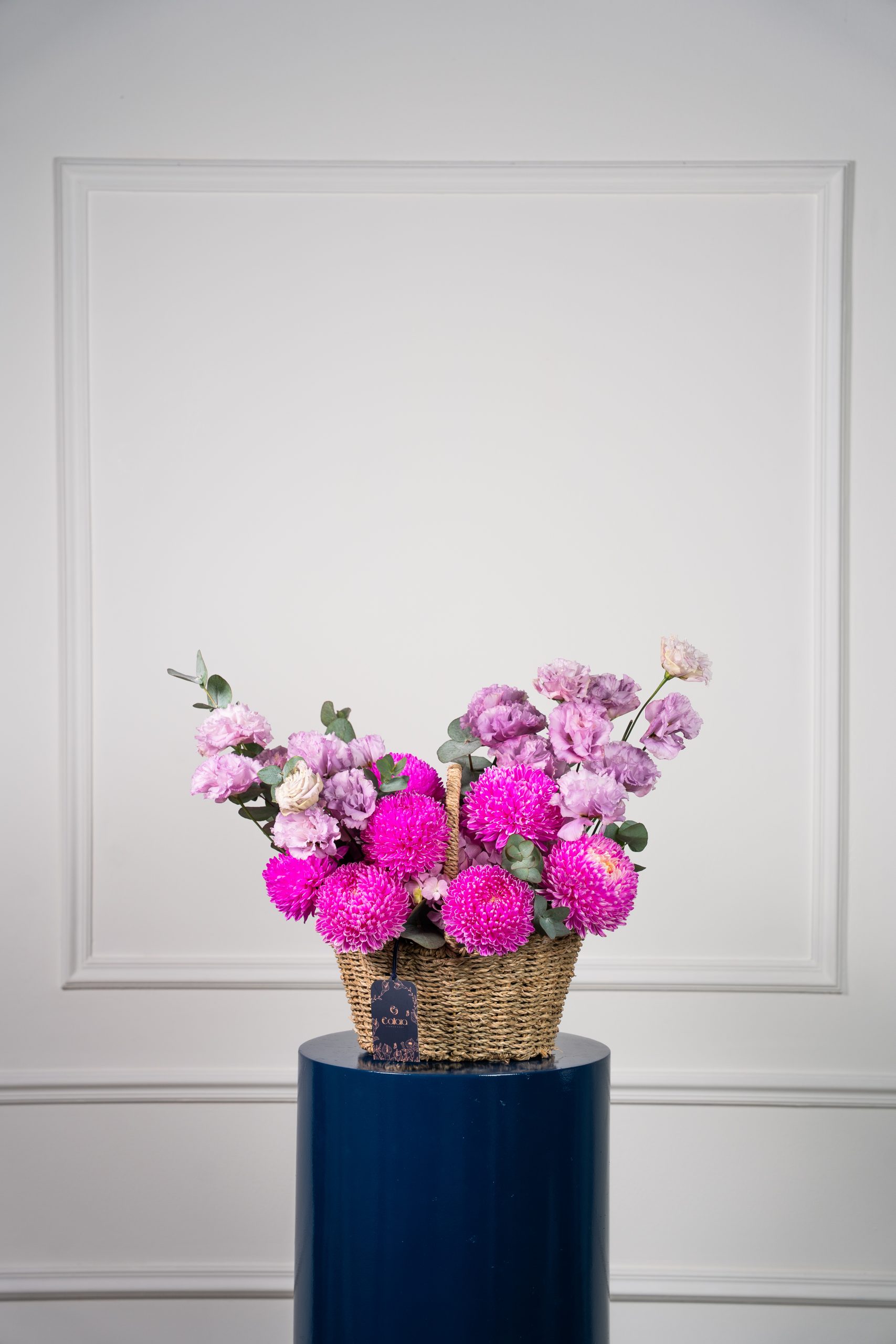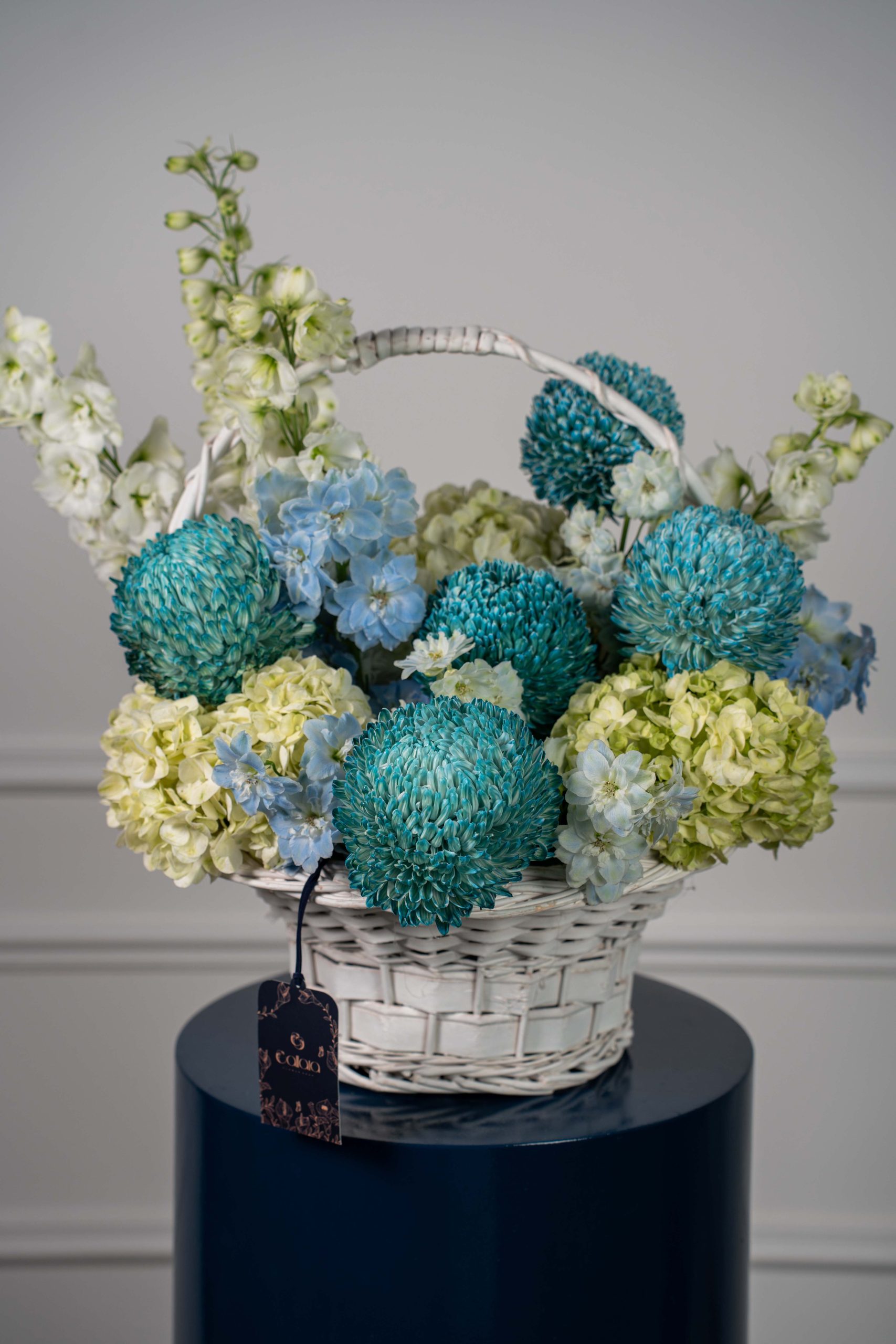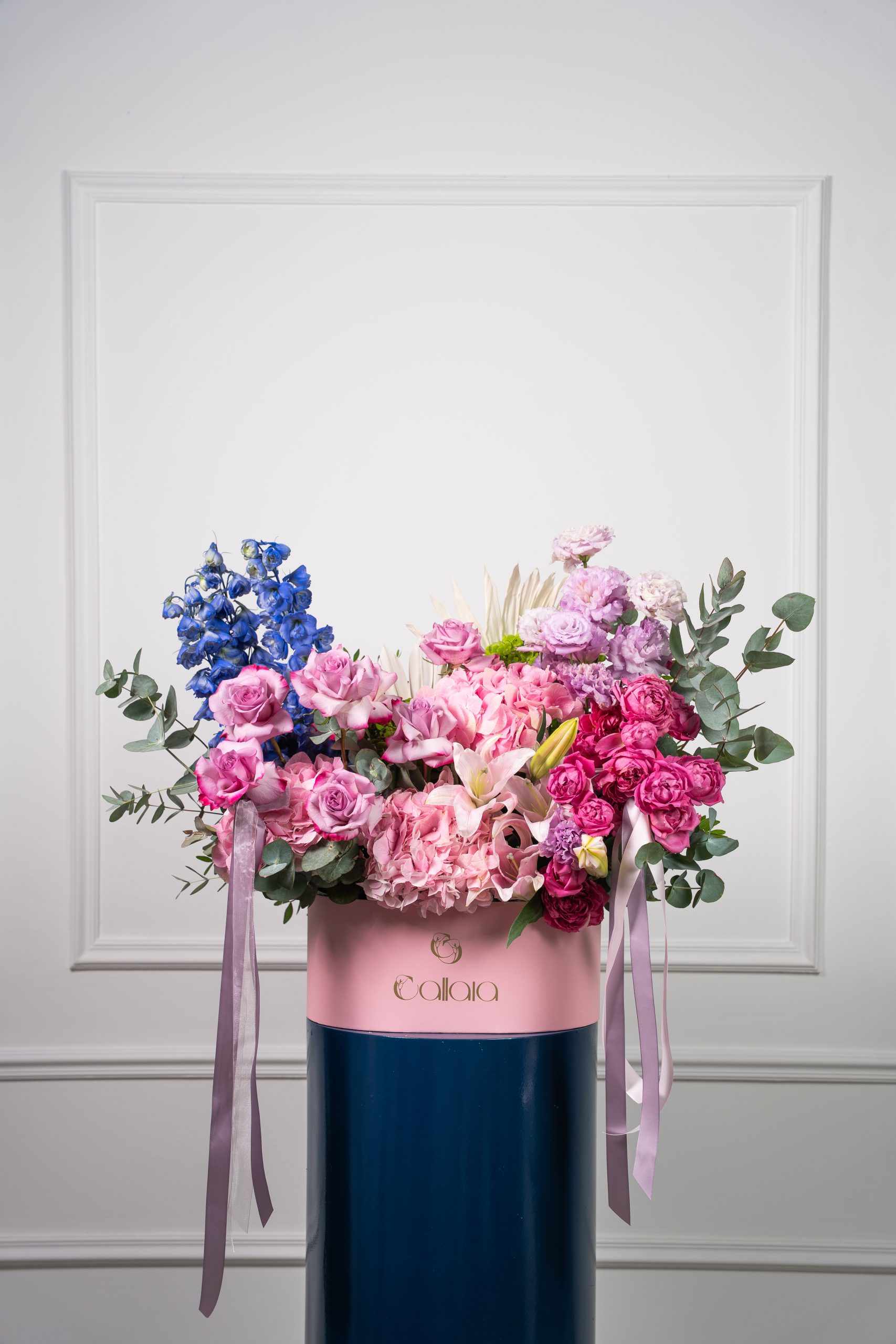 Azaiya is a graceful harmony of soft pastels and fresh elegance. Designed with Ohara pink roses, sky-blue delphinium, tanacetum daisies, spray matthiola, hydrangea, and eucalyptus, this bouquet balances romance and serenity in every bloom. Wrapped in Callaia’s signature style, it is a refined gift for life’s most special moments.