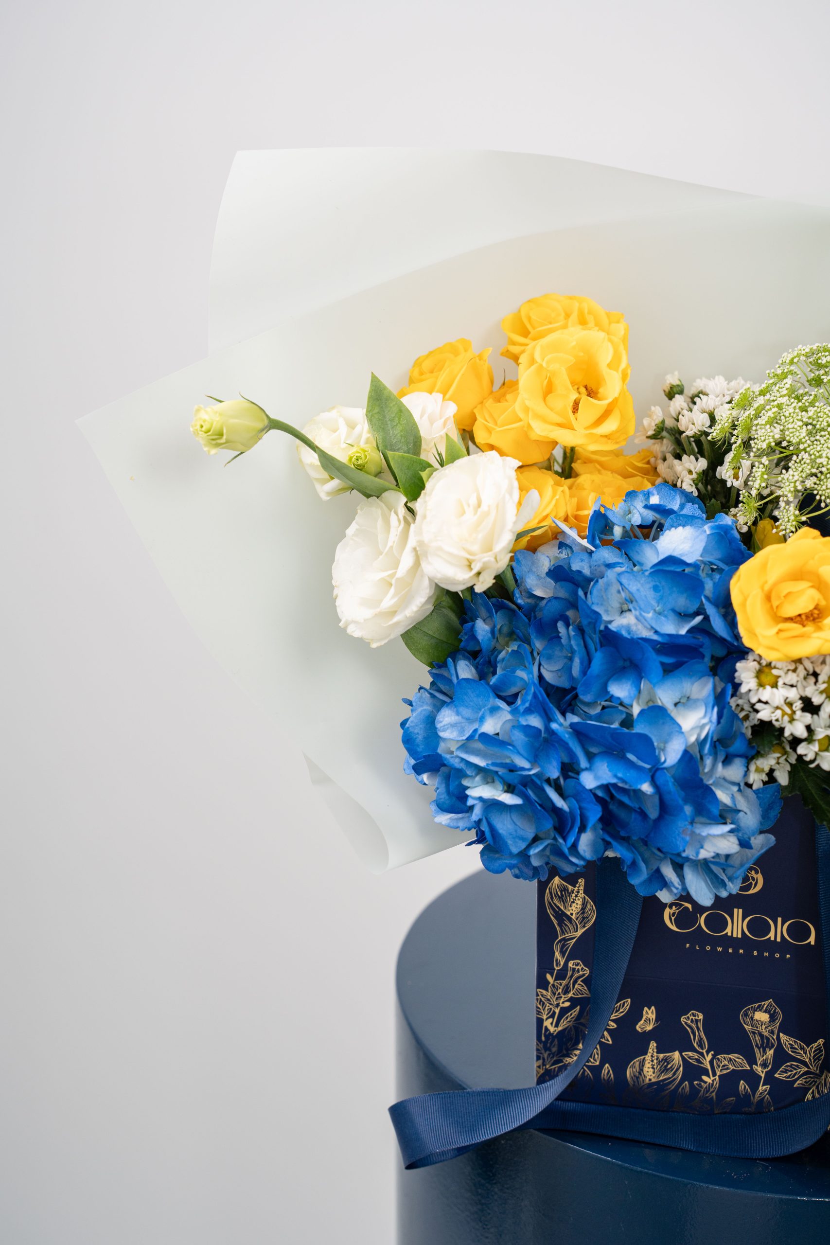 Azure Sunshine is a radiant floral arrangement that blends vibrant blue hydrangea with cheerful yellow roses and soft white blooms, creating a fresh and uplifting composition full of warmth and brightness.