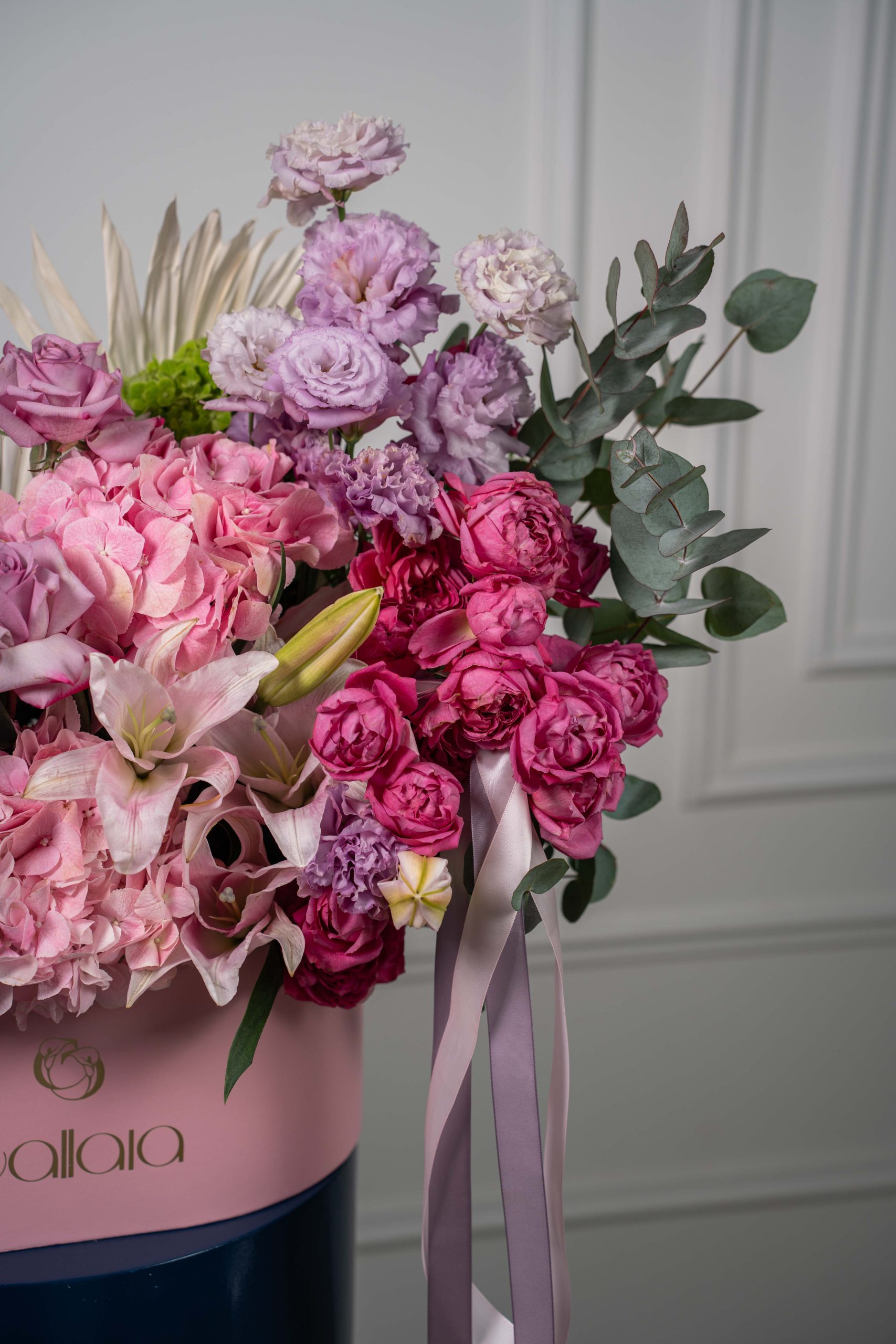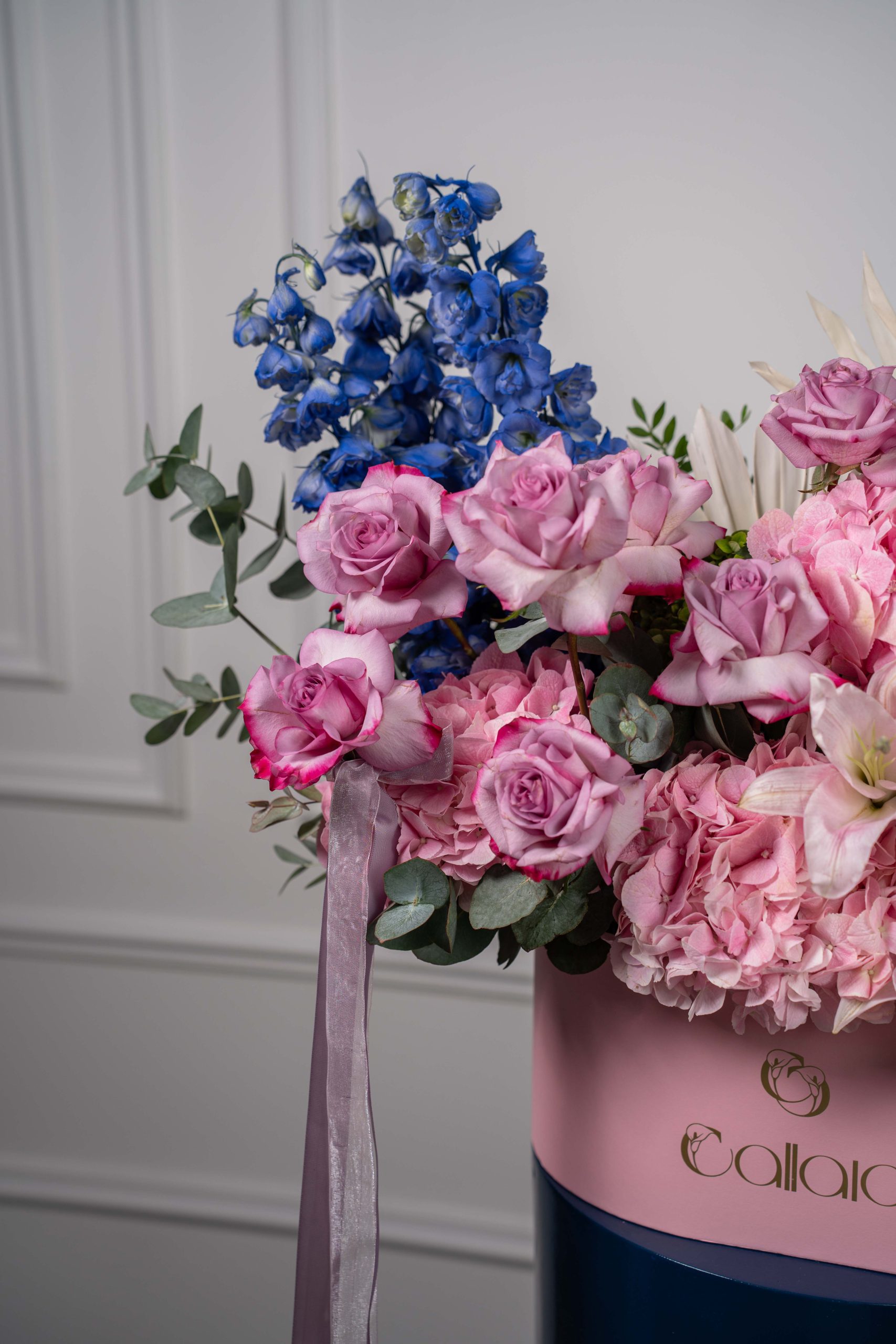 Blossy is a vibrant symphony of pink blooms paired with touches of blue delphinium and soft eucalyptus, featuring roses, Jullieta Cerise, hydrangeas, lilies, and eustoma. A bold and romantic statement arranged in our signature pink box.