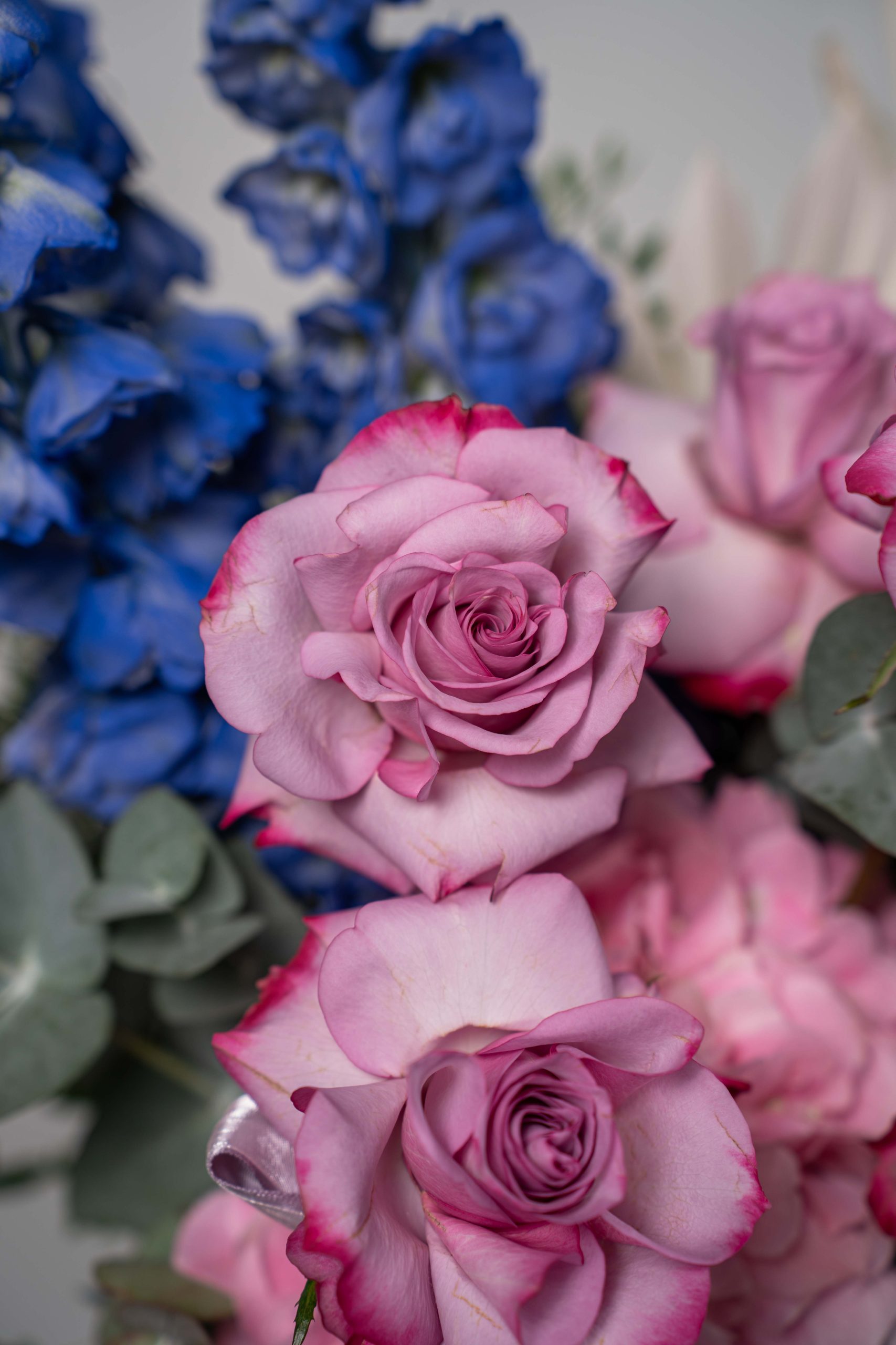 Blossy brings together a rich palette of pink and blue florals, thoughtfully designed to create a luxurious and eye-catching display. This arrangement features Deep purple roses, Jullieta cerise, voluminous hydrangeas, soft eustoma, and elegant oriental lilies. Blue delphinium adds height and contrast, while eucalyptus brings a fresh, modern touch.