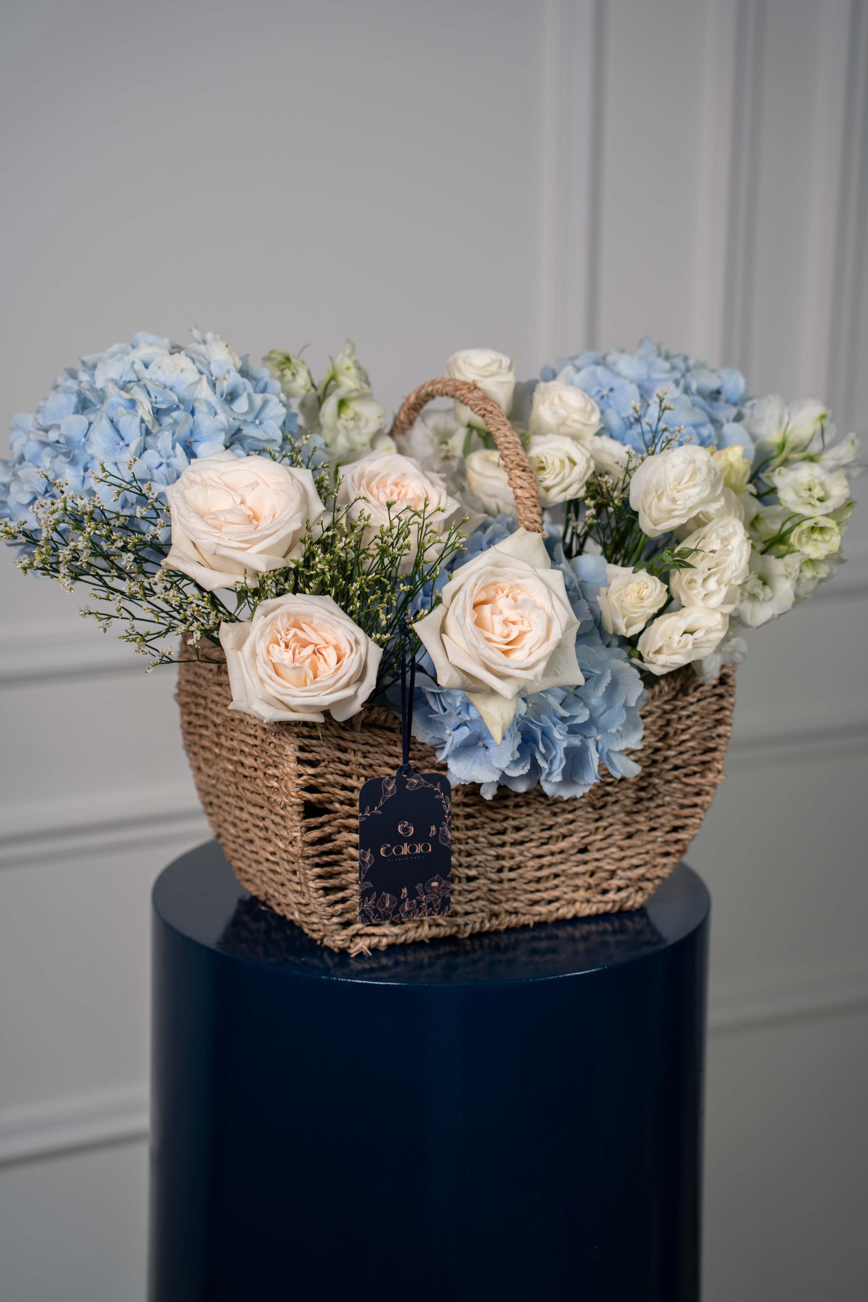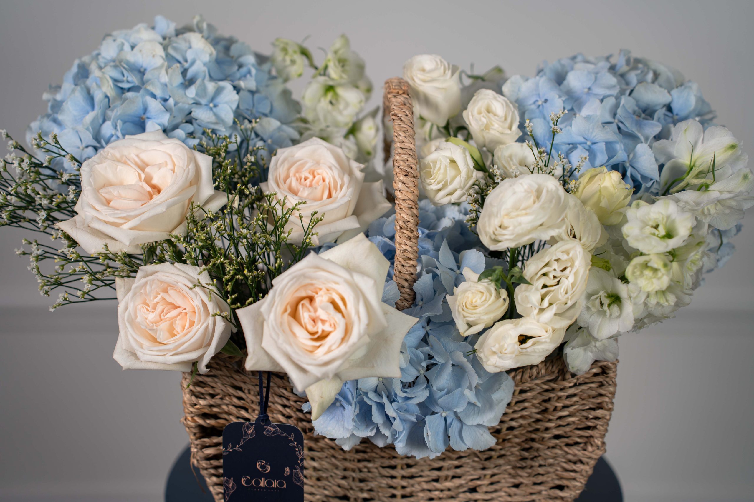 Graceful and serene, Blue Whisper combines soft sky-blue hydrangeas with creamy white roses, lisianthus, and delphinium — accented with limonium and eucalyptus for a touch of texture. A luxurious arrangement that evokes peace, purity, and timeless elegance.