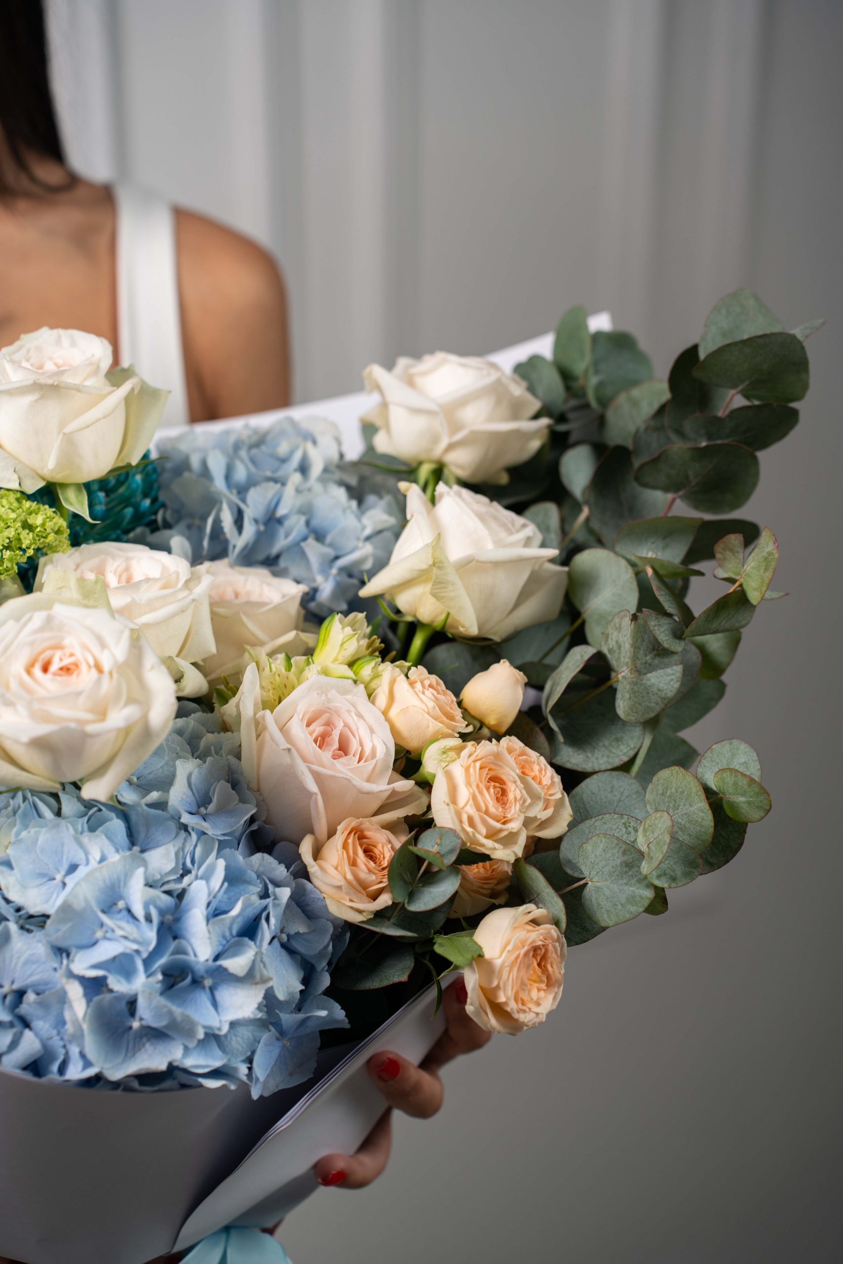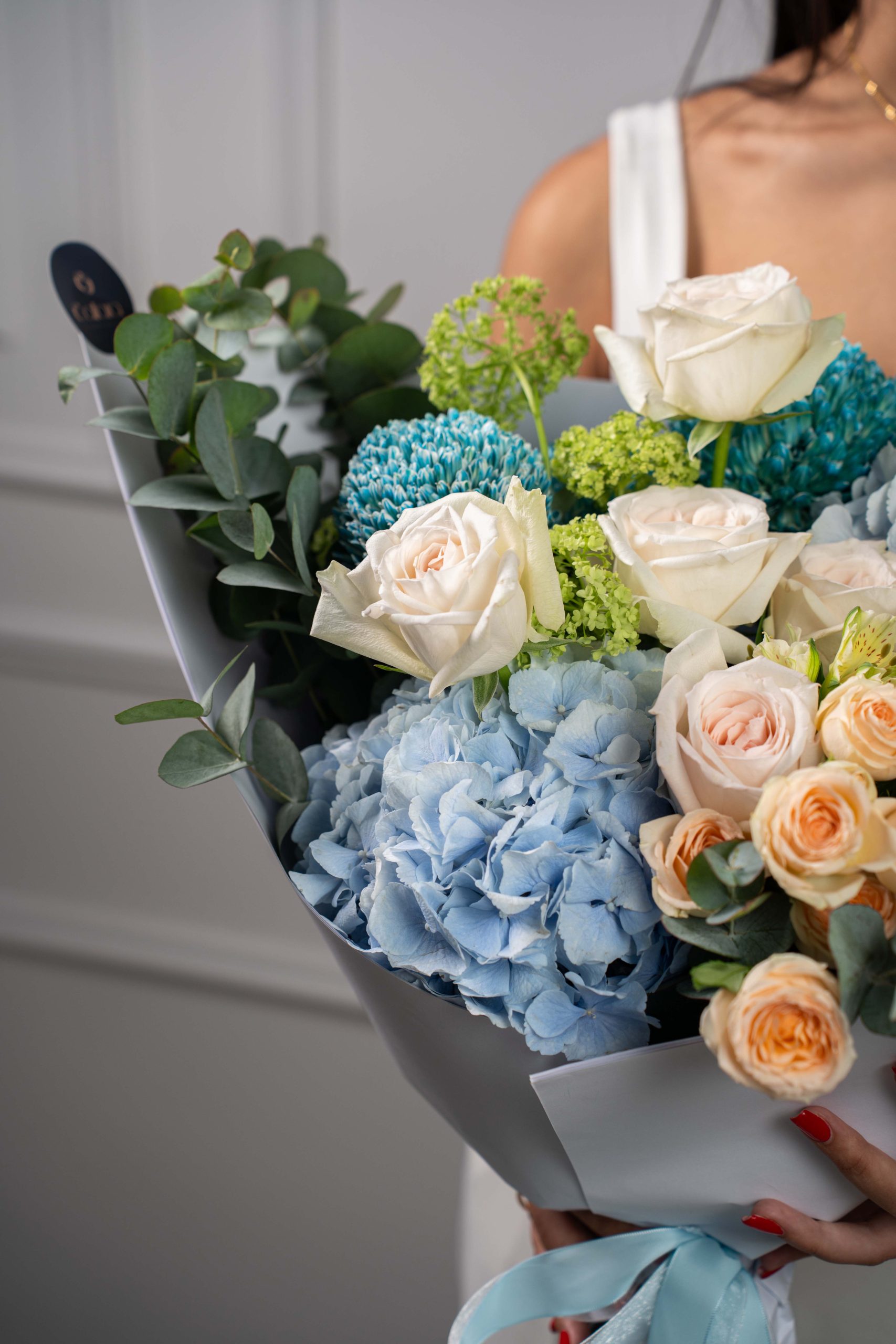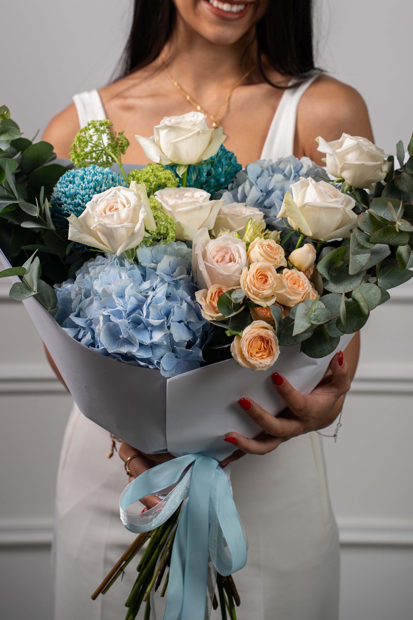 A refined blend of blue hydrangeas, ohara white roses, peach spray roses, and eucalyptus, radiating calm elegance and timeless beauty. Perfect for birthdays, anniversaries, and heartfelt gestures.