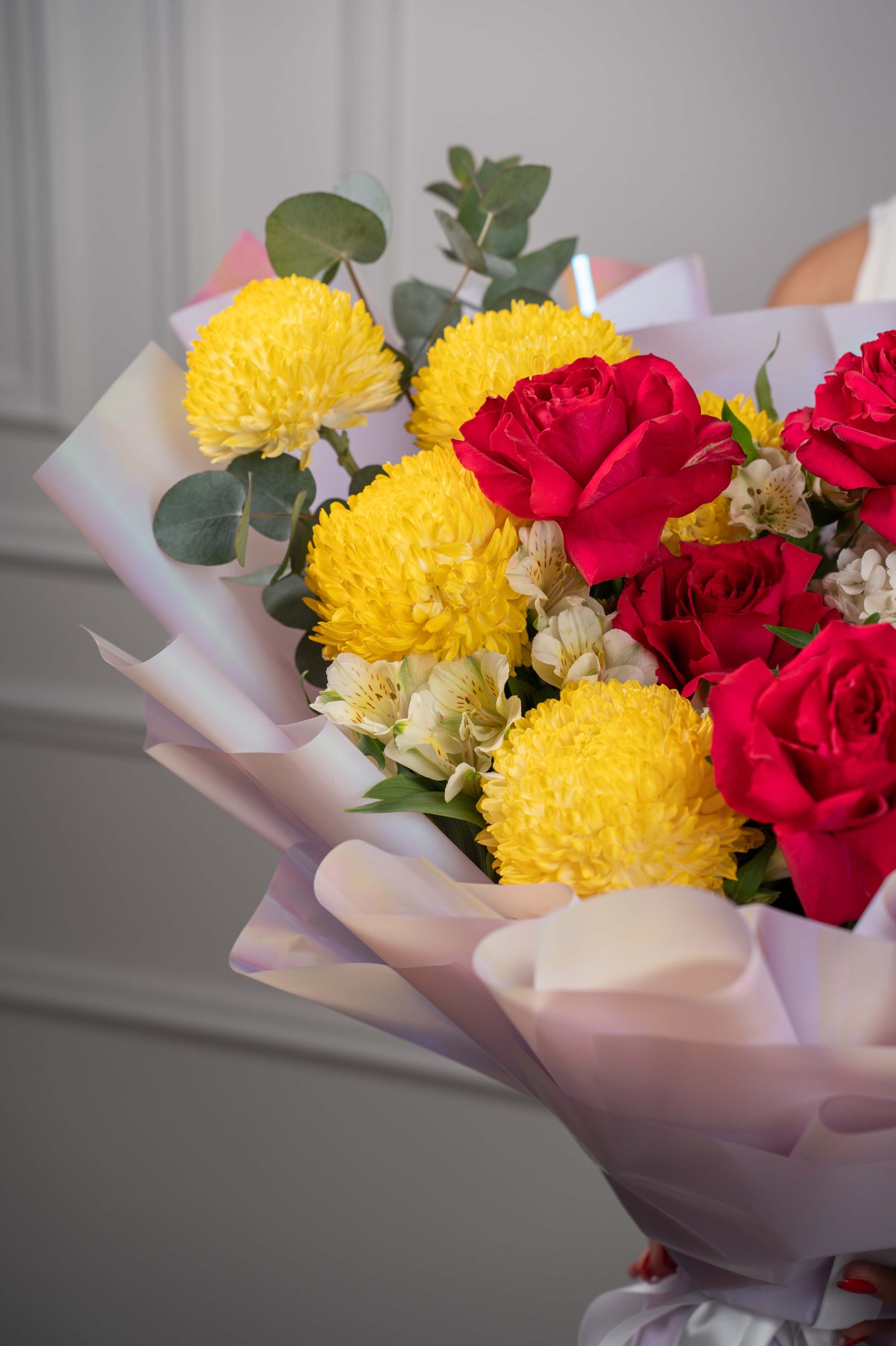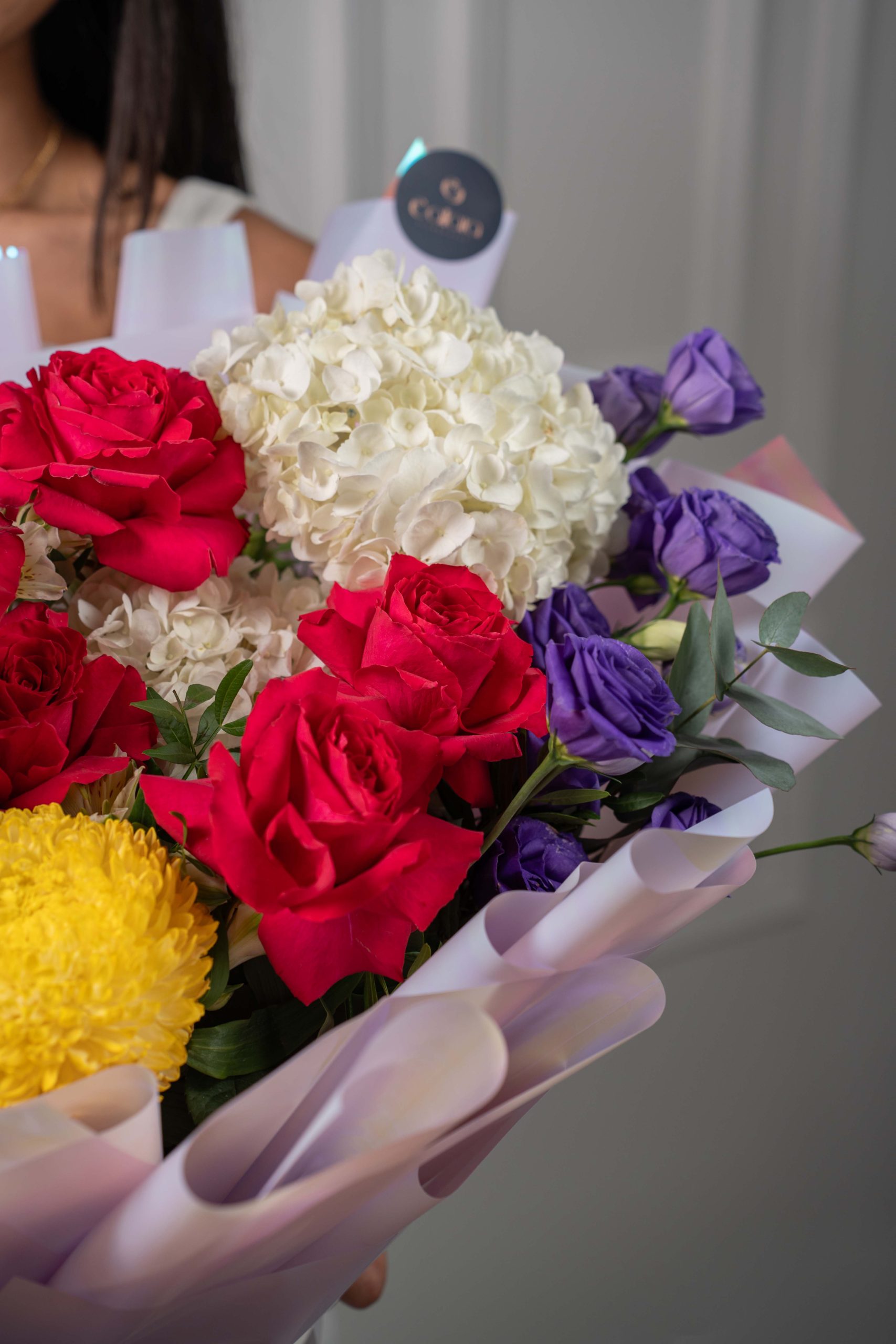 Bright Mix is a vibrant hand bouquet full of life and color, crafted to make every moment unforgettable. This cheerful arrangement features yellow chrysanthemum peonies, fuchsia roses, violet eustoma, and white hydrangea, complemented with alstroemeria and eucalyptus for balance and freshness. A joyful gift that radiates energy, elegance, and charm.