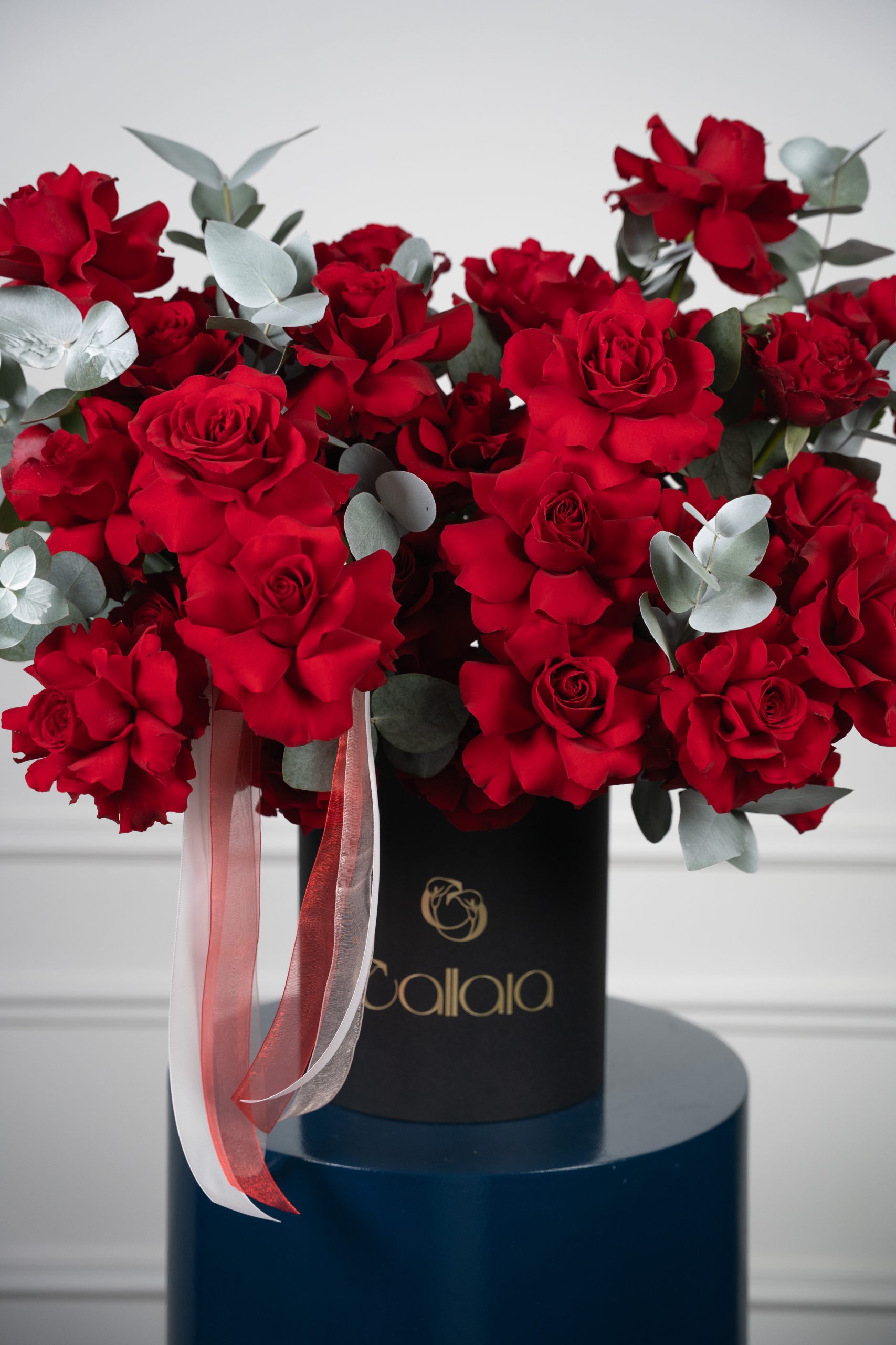 This elegant arrangement features vibrant, full-bloom orange roses, complemented by lush, deep green eucalyptus foliage, meticulously presented in a sleek, matte black cylindrical box adorned with the “Callaia” brand logo. The rich citrus hues of the roses create a striking visual impact, making it an ideal gift for various occasions or a sophisticated decorative centerpiece.