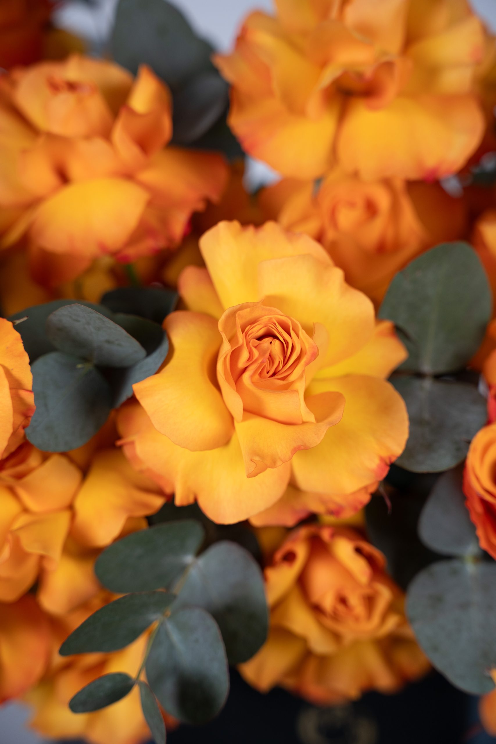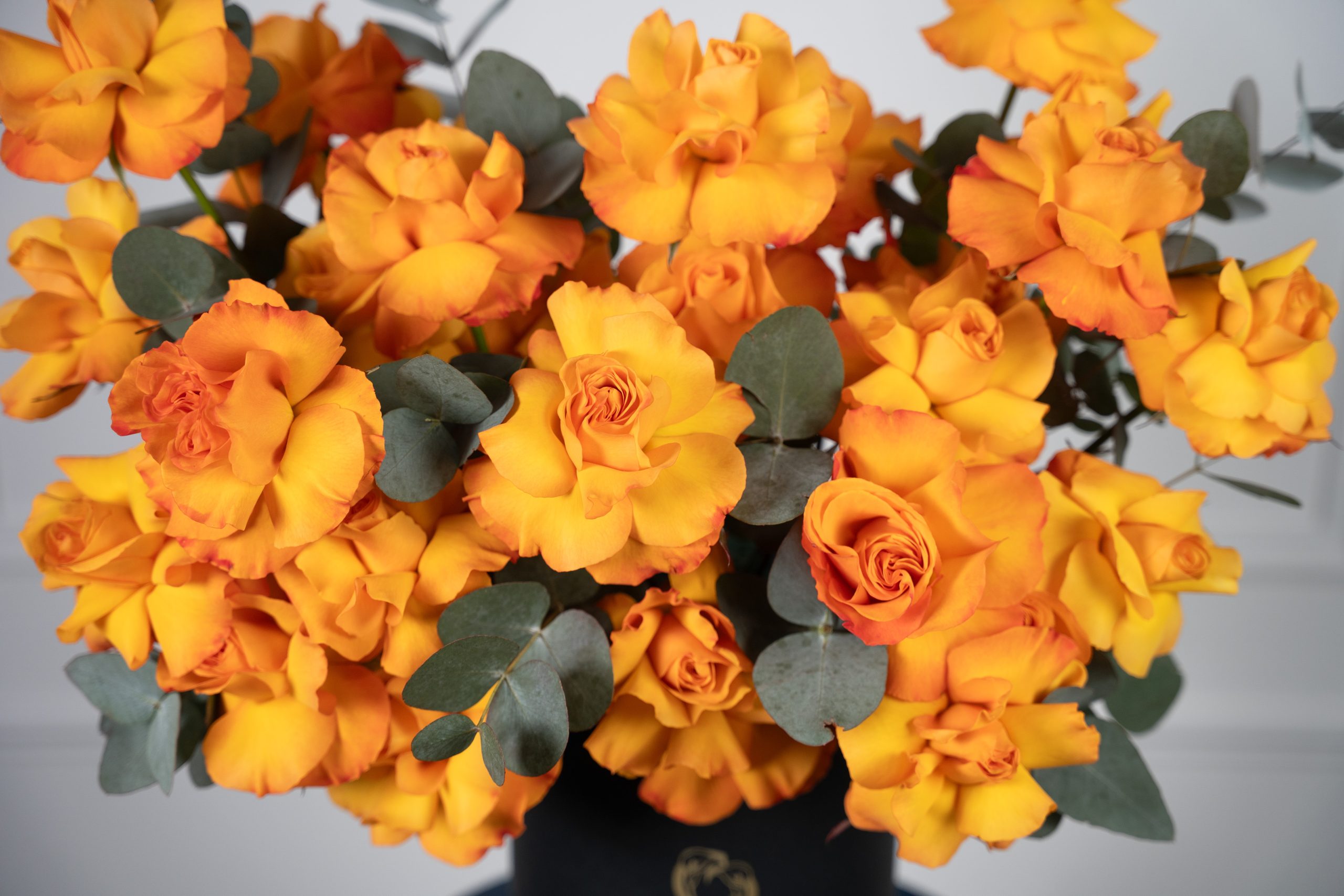 This elegant arrangement features vibrant, full-bloom orange roses, complemented by lush, deep green eucalyptus foliage, meticulously presented in a sleek, matte black cylindrical box adorned with the “Callaia” brand logo. The rich citrus hues of the roses create a striking visual impact, making it an ideal gift for various occasions or a sophisticated decorative centerpiece.