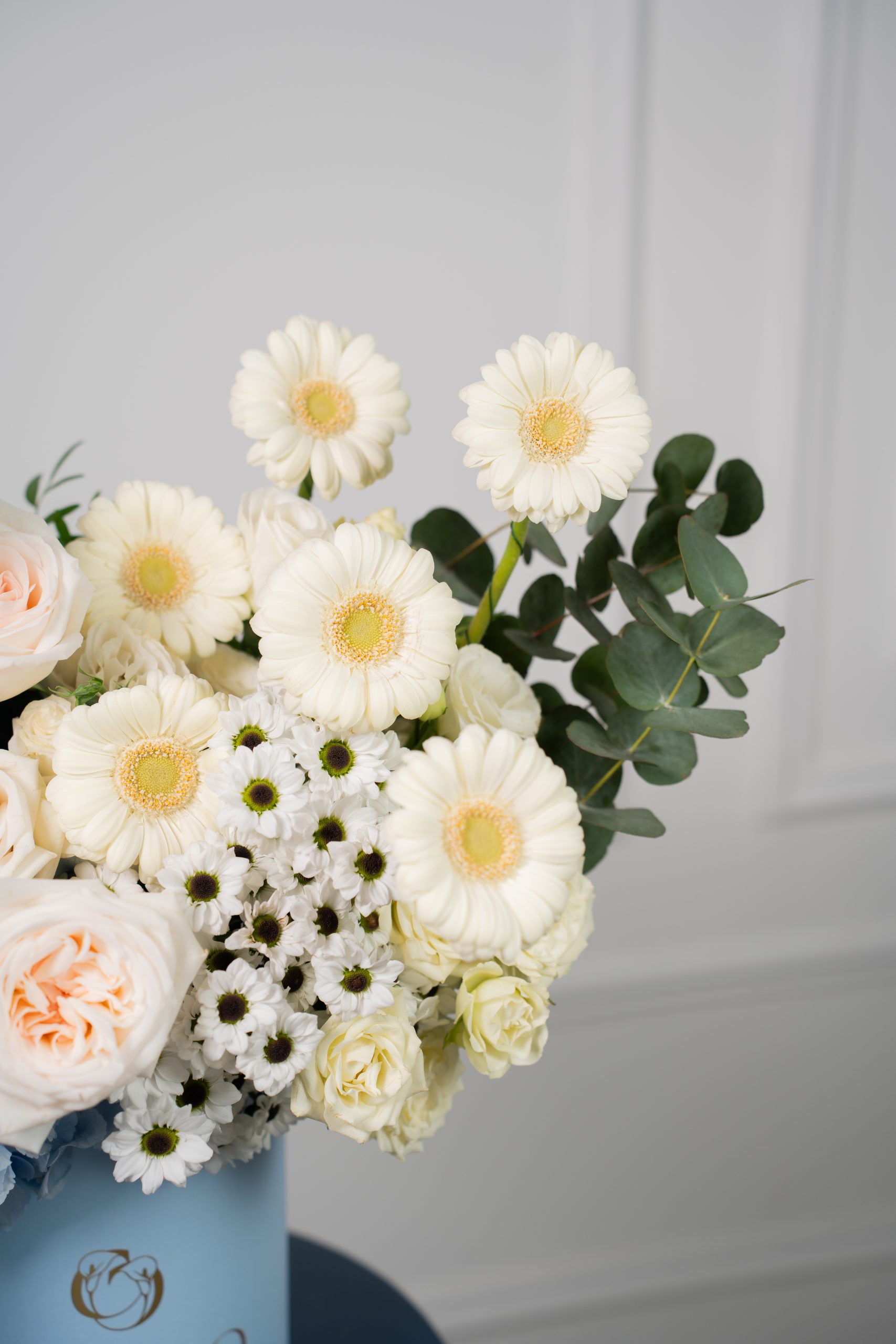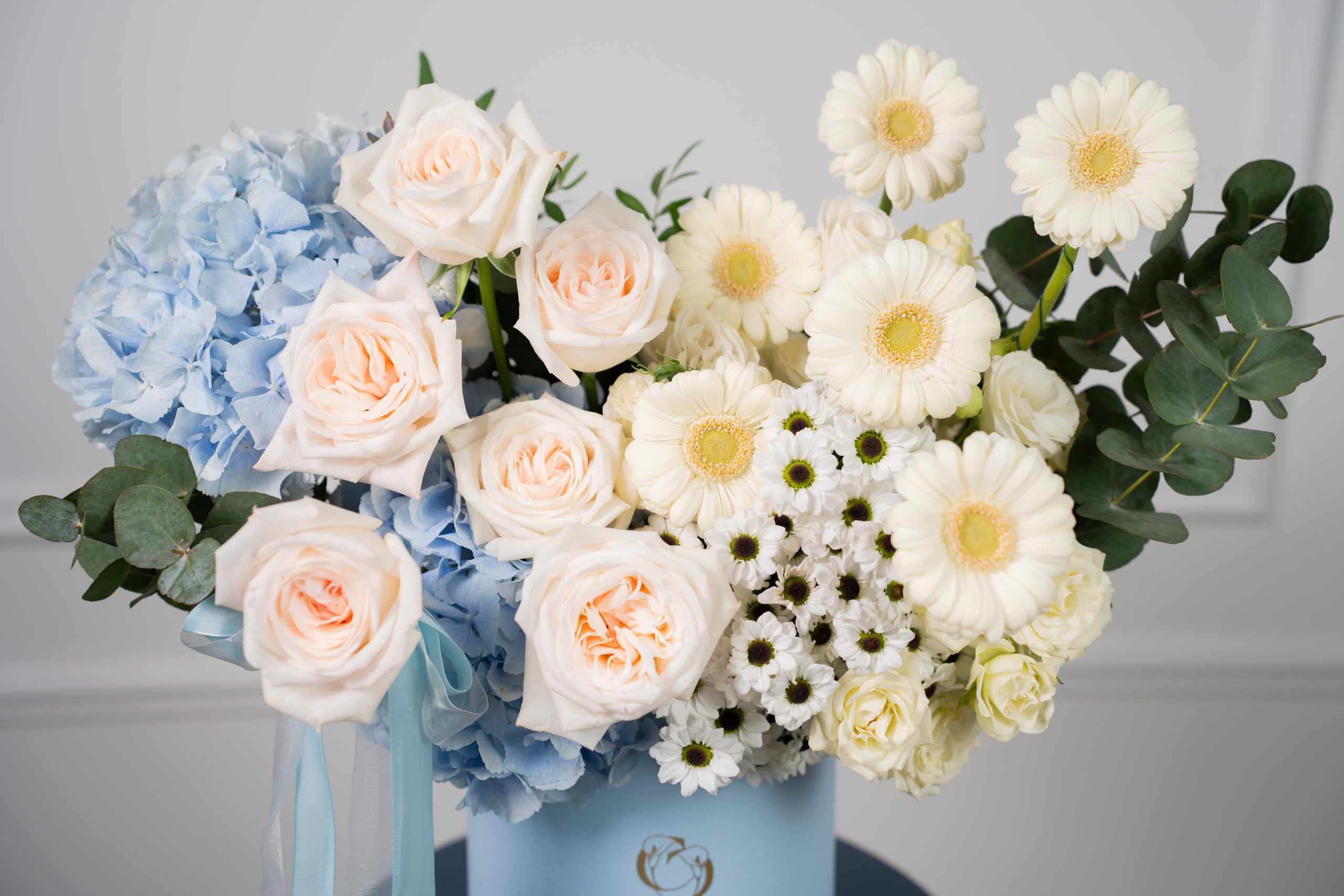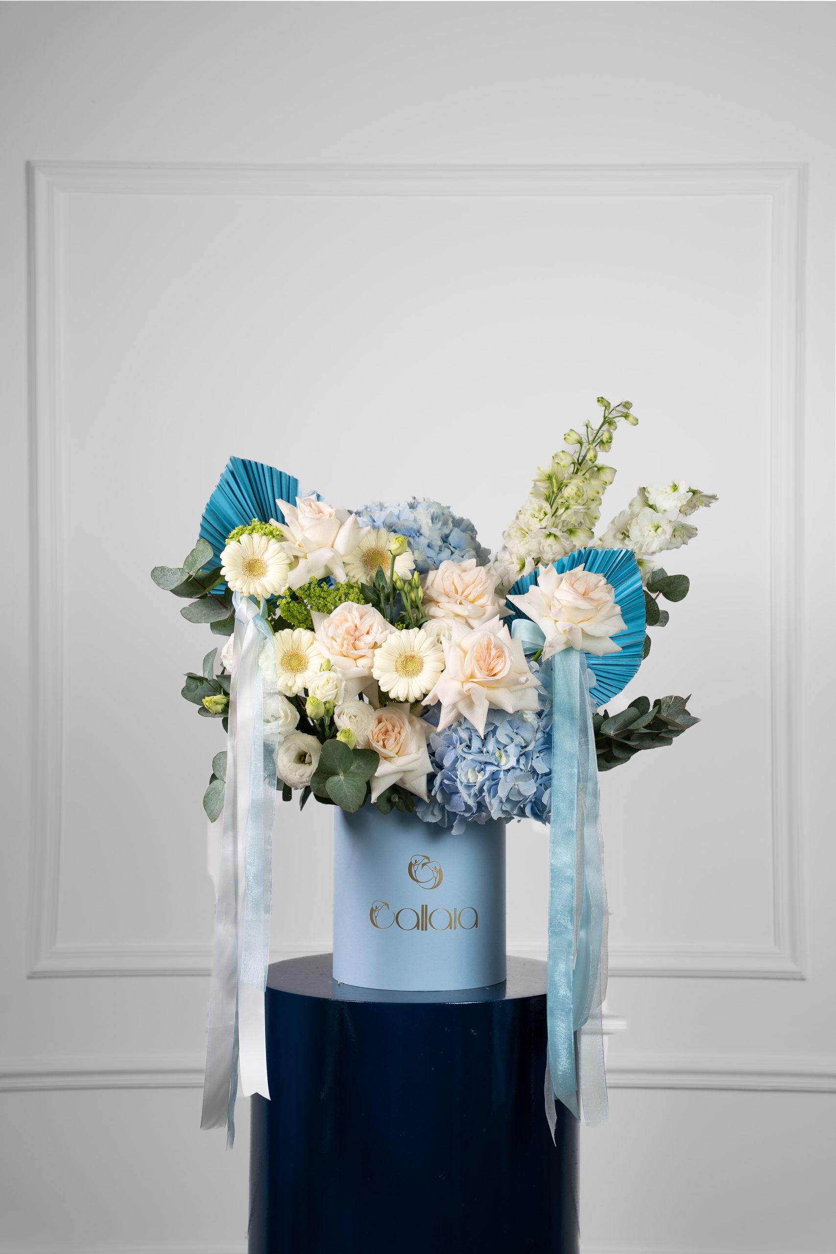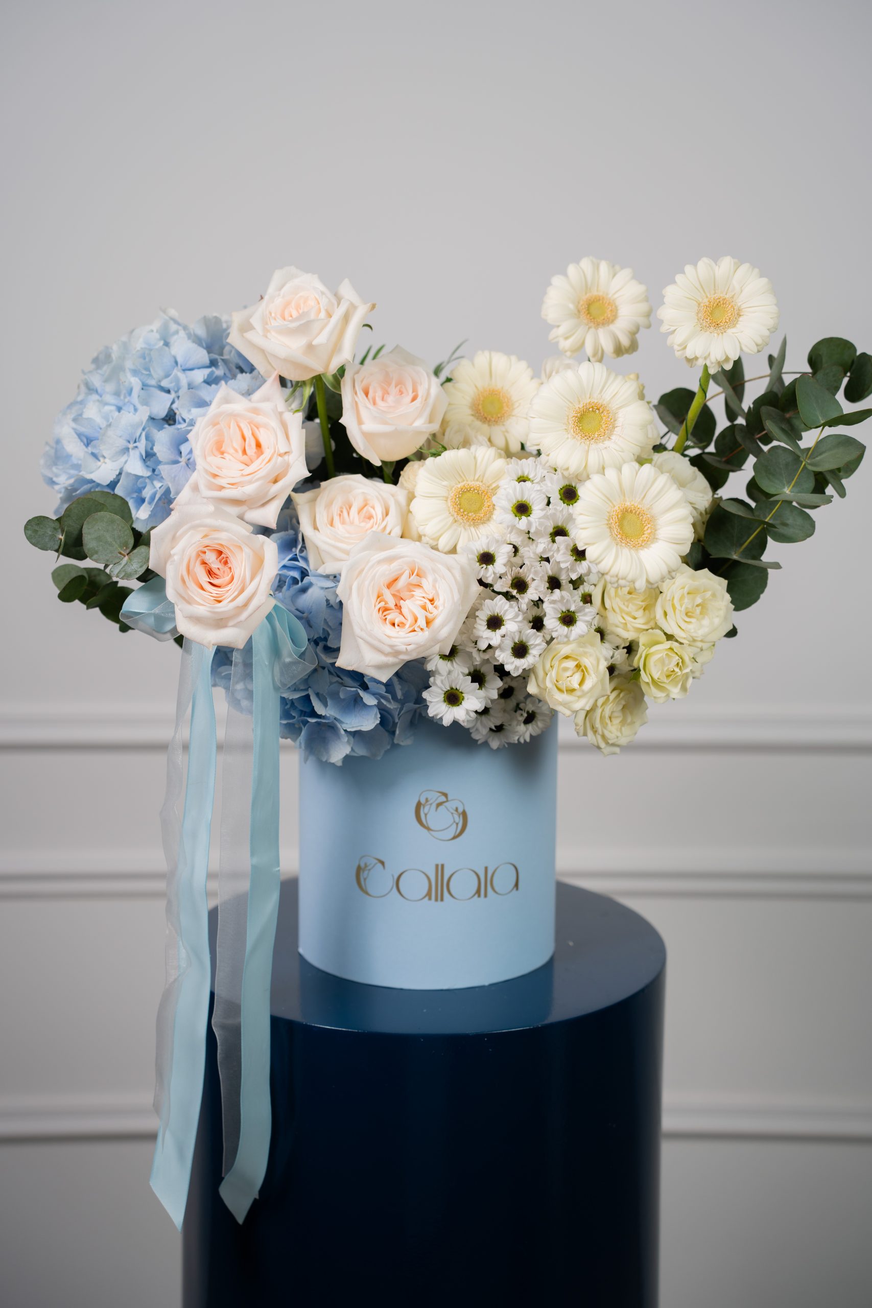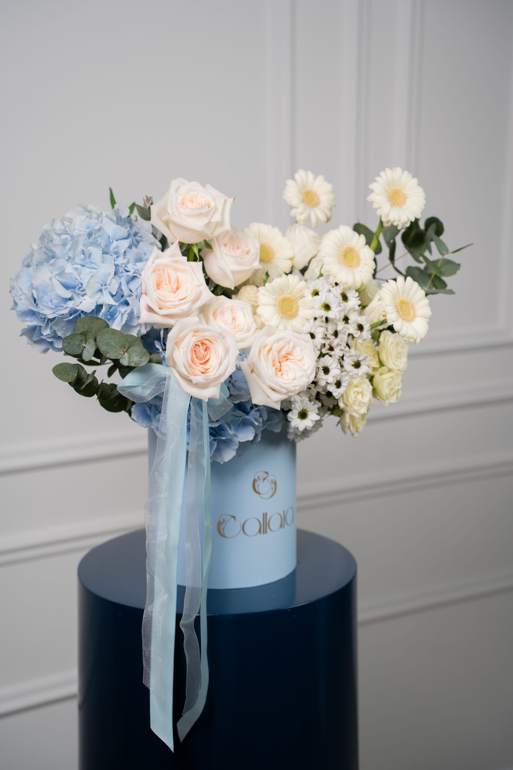 CloudeIle is a soft and airy blend of sky-blue hydrangeas, Ohara white roses, santini white, gerberas, and eucalyptus, styled beautifully in a pastel blue luxury box for a fresh, cloud-like look.