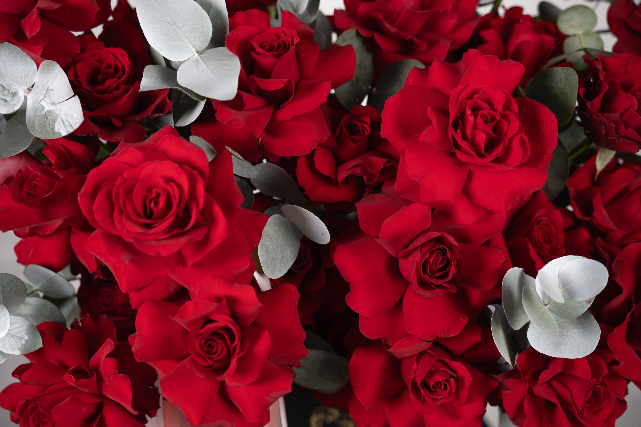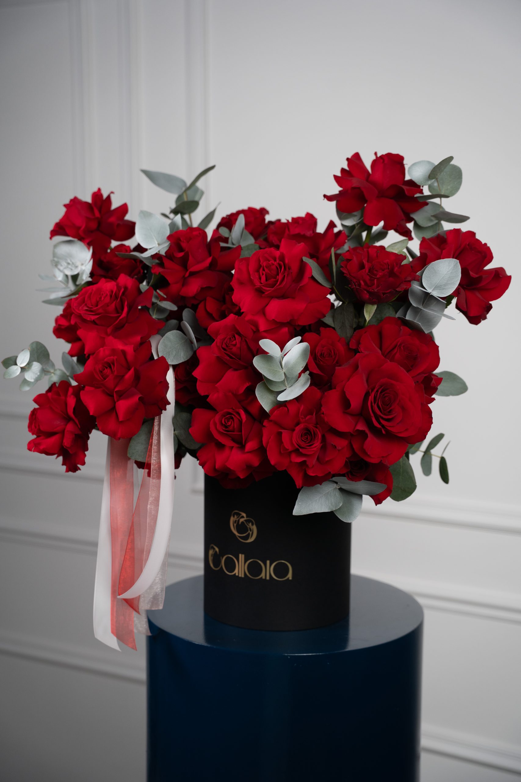Crimson Bloom Box is a bold and luxurious display of red Explorer roses paired with fresh eucalyptus, arranged in Callaia’s signature black box. A striking expression of passion and elegance.