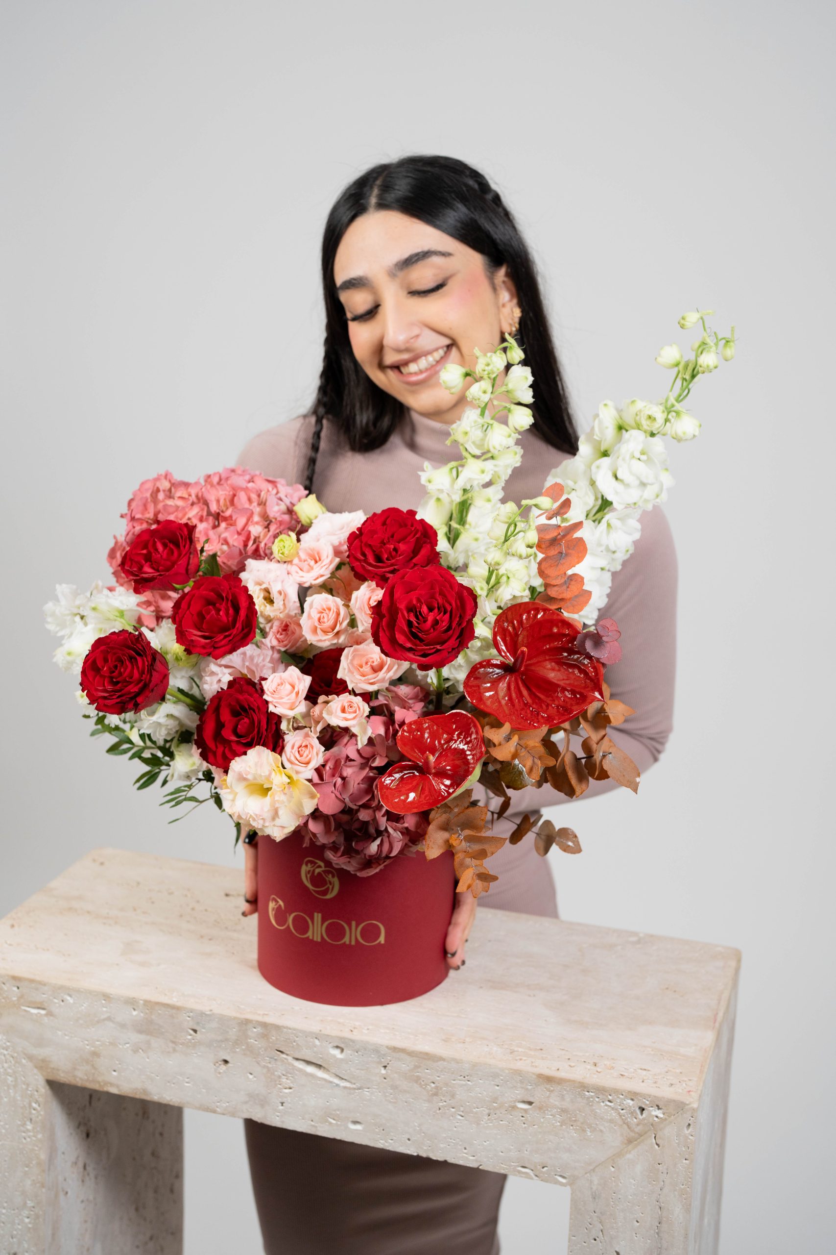 Accented with delicate white florals, lush greenery, and seasonal textures, Crimson Blush is artfully arranged in a signature hat box that enhances its luxurious presence. The rich color palette evokes confidence and emotion, blending bold intensity with gentle softness for a perfectly balanced design.