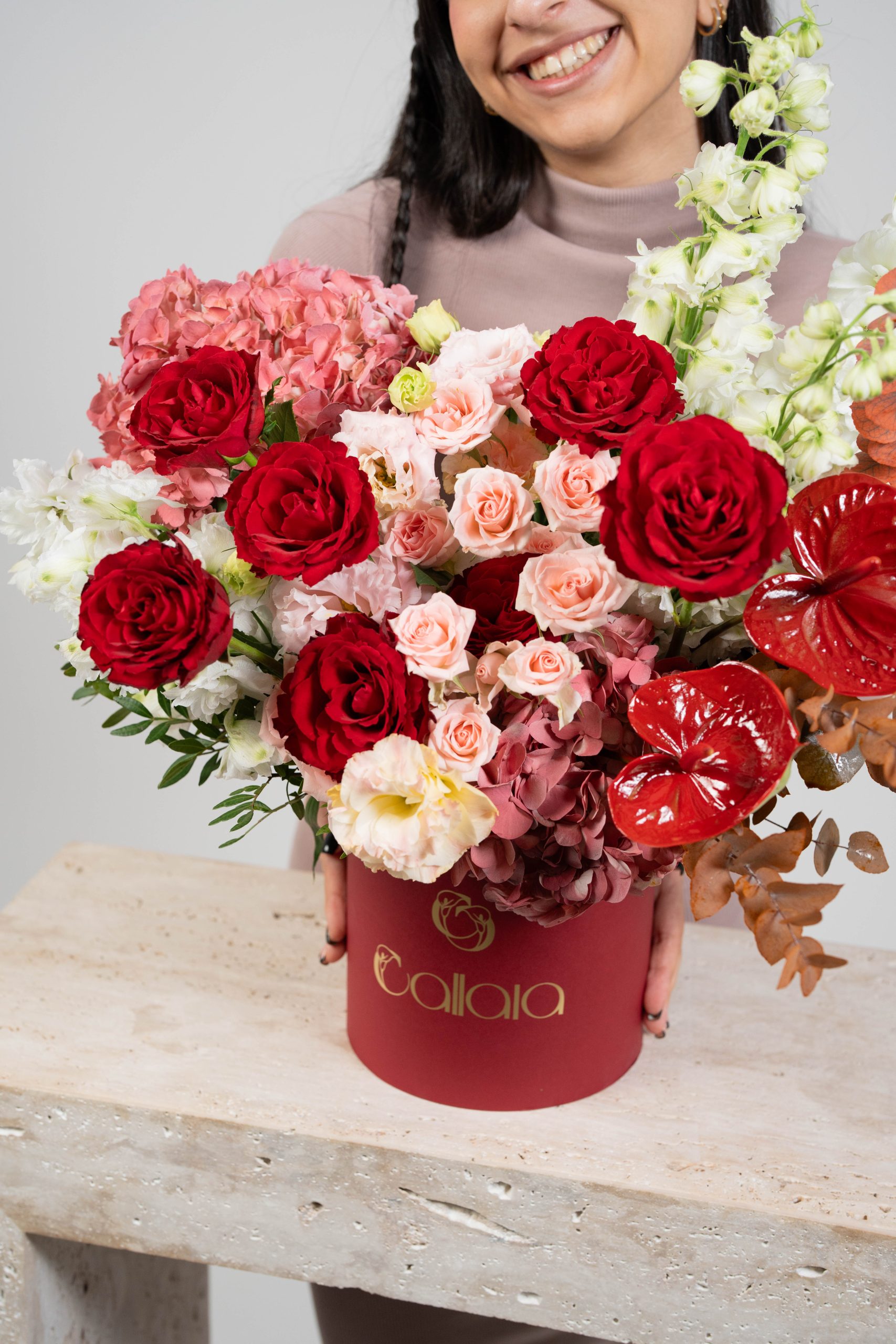 Crimson Blush is a luxurious floral arrangement featuring rich red roses, soft blush pink blooms, and elegant seasonal accents, beautifully styled in a signature hat box for a bold yet romantic statement.