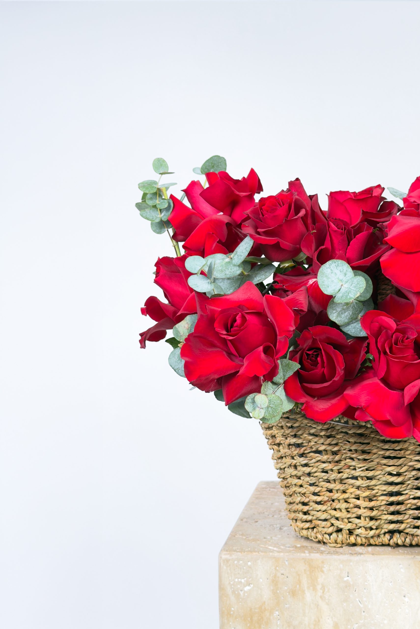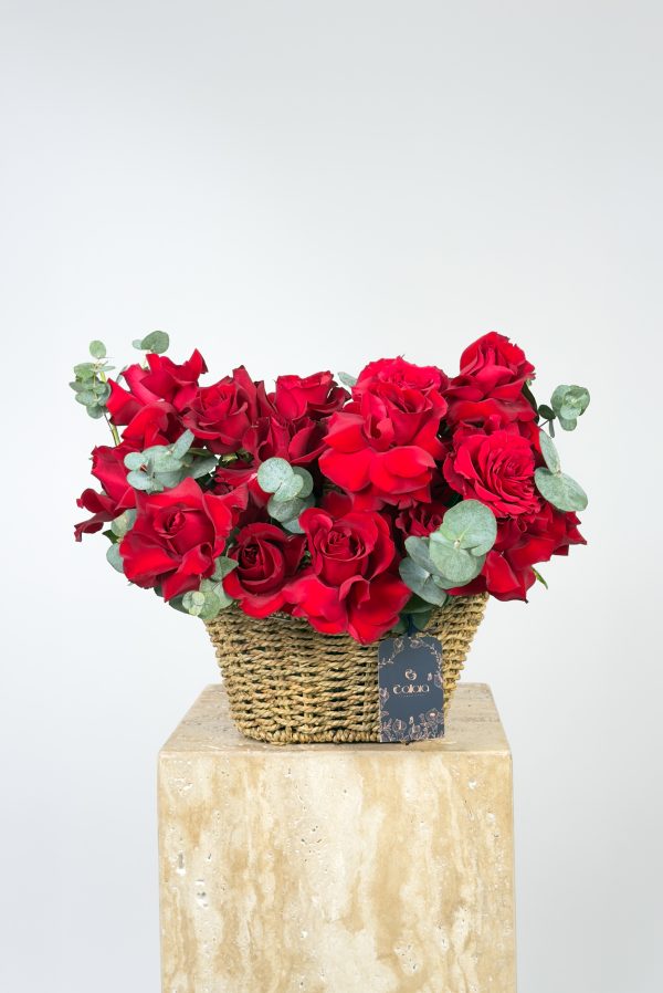 The deep red roses symbolize love, devotion, and heartfelt emotion, while the cool-toned eucalyptus adds texture, balance, and a subtle contemporary touch. Together, they create a harmonious composition that feels both luxurious and effortlessly natural. The woven basket enhances the organic charm of the arrangement, making it perfect for both classic and modern interiors.