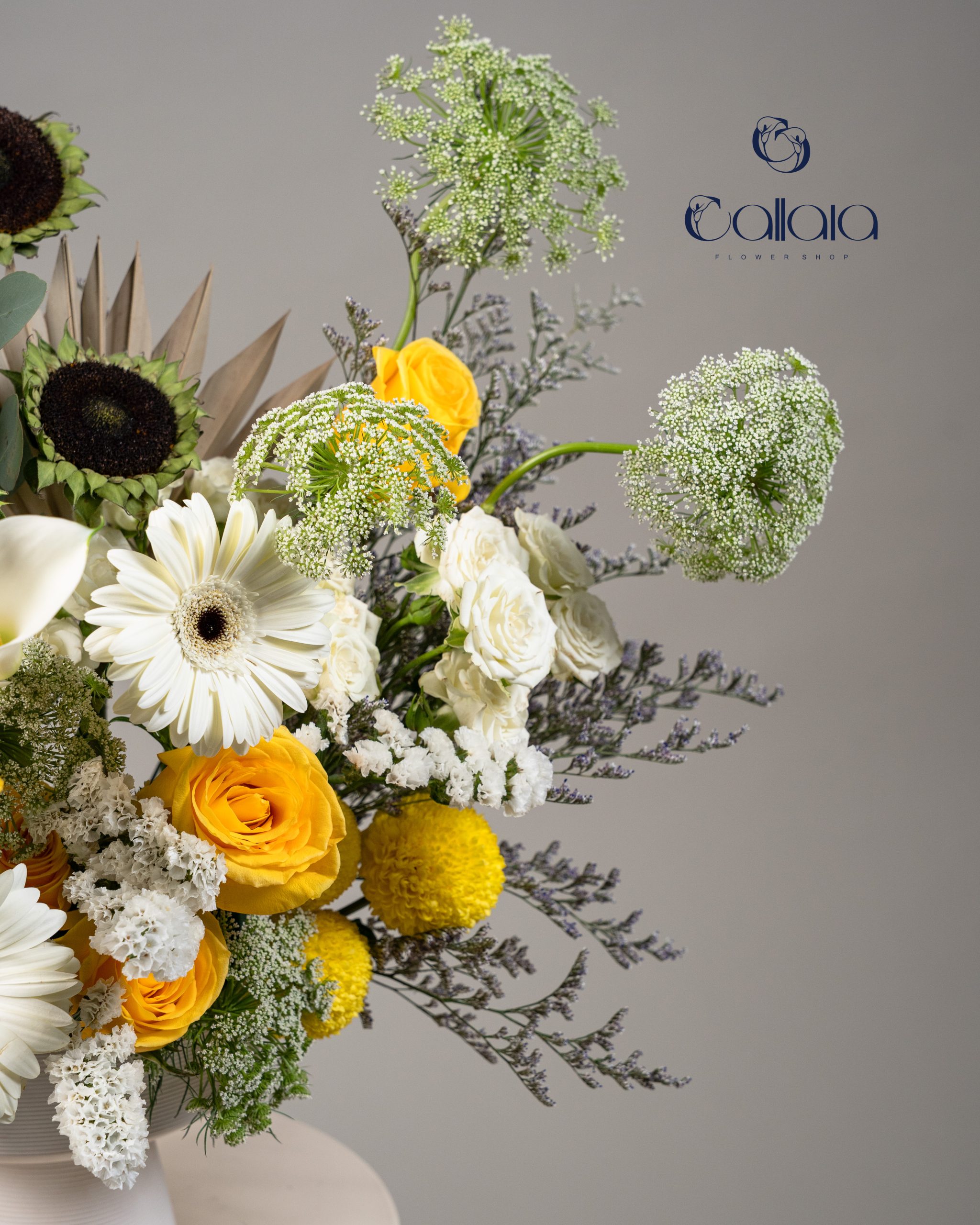 Day Light Noir is a striking floral arrangement that blends fresh white blooms, warm yellow accents, and bold dark-centered sunflowers, creating a modern contrast of light and depth in a refined, sculptural presentation.
