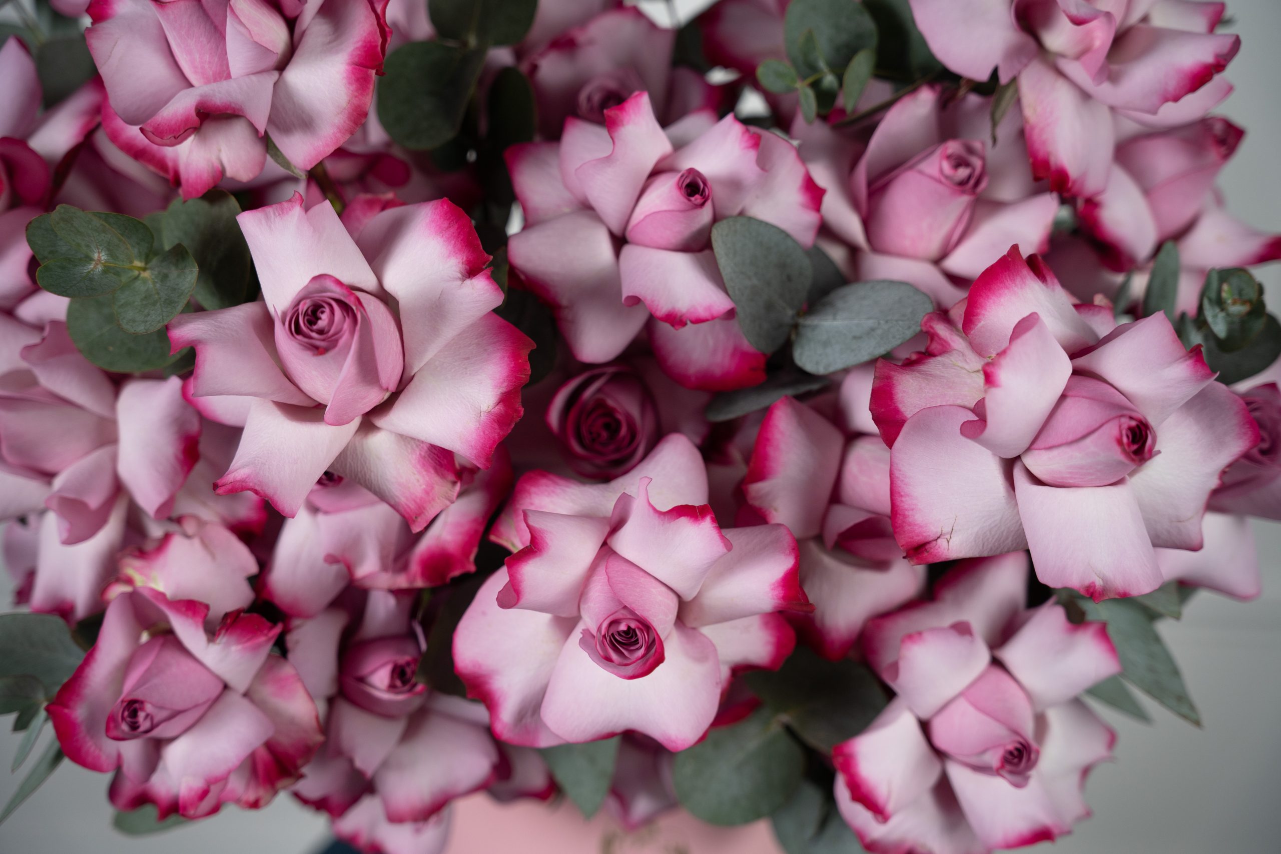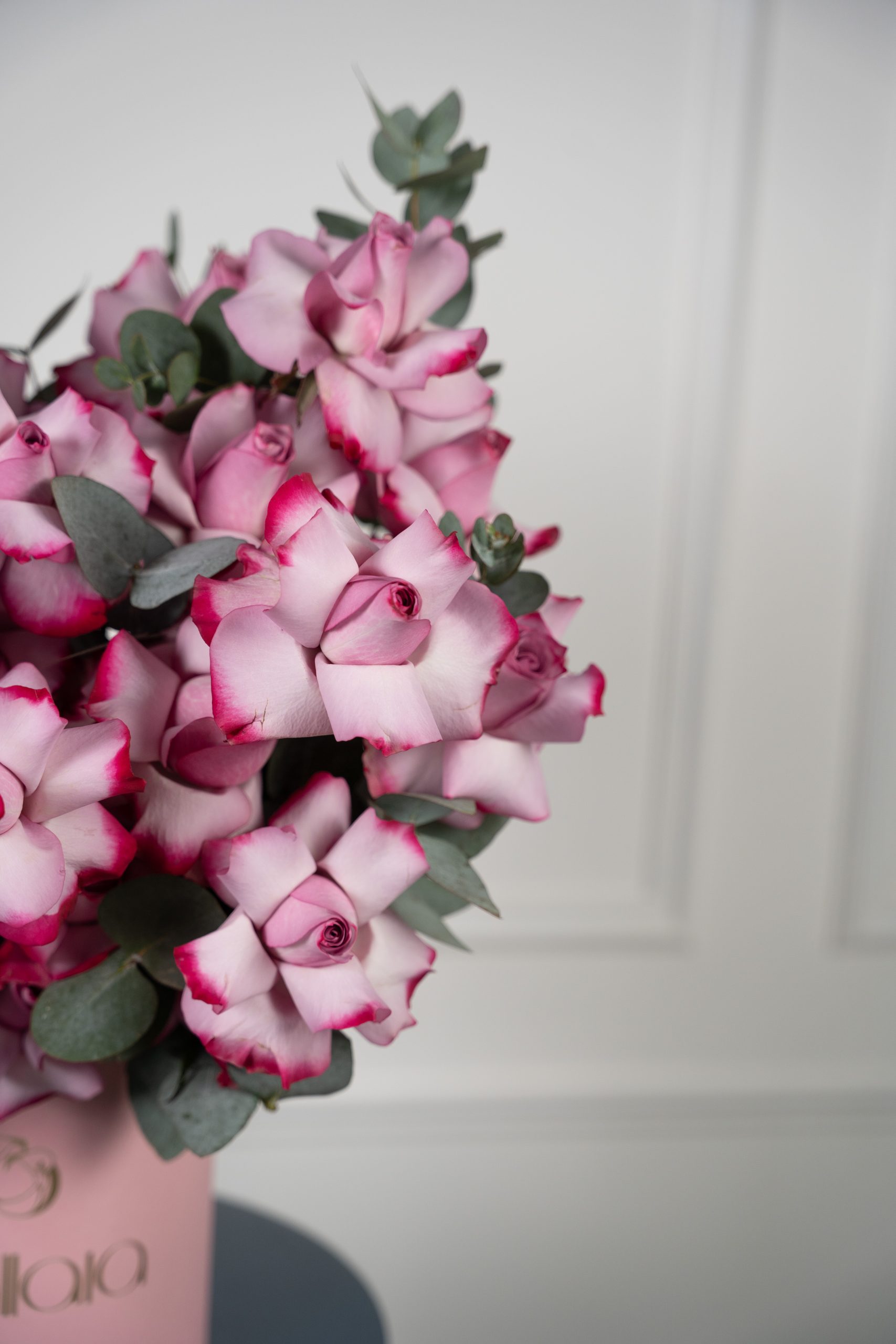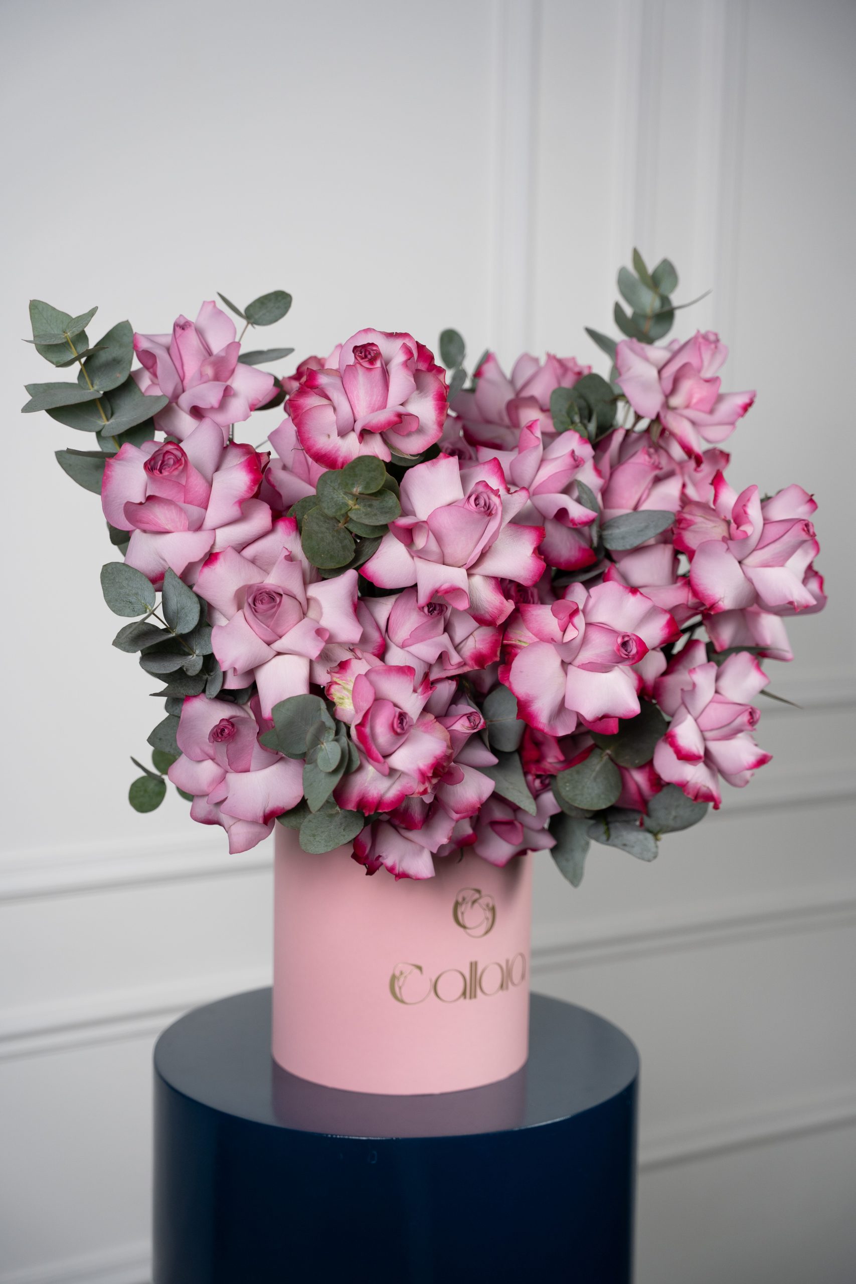 This image professionally depicts a luxurious floral arrangement featuring a bountiful display of two-toned roses, predominantly pink with distinctive darker pink or red edges, complemented by lush green foliage, likely eucalyptus. The roses are elegantly presented in a sophisticated, soft pink cylindrical box branded with “Callaia”, suggesting a high-end floral service or product. The overall presentation conveys elegance, freshness, and a premium aesthetic suitable for gifting or decorative purposes.