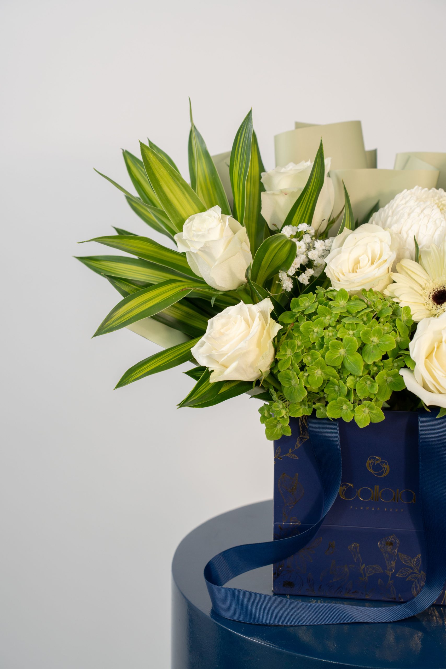 Ethereal Spark is a fresh and luminous floral arrangement featuring creamy white roses, soft white blooms, and vibrant green hydrangea, beautifully styled in a refined mini bag for a clean and uplifting presentation.