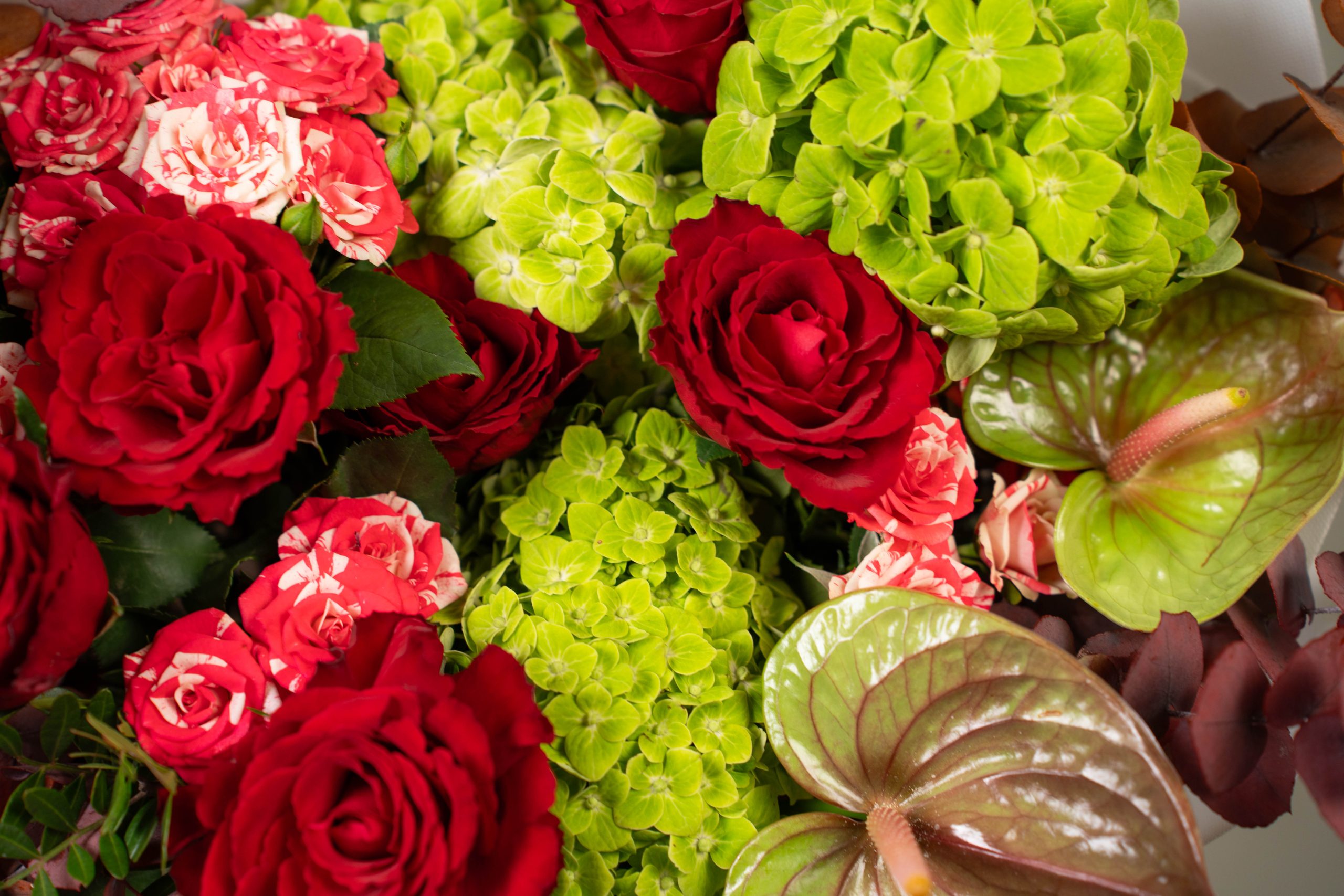Exotic Bloom is a captivating bouquet that celebrates contrast, texture, and modern floral artistry. This unique arrangement brings together deep red roses, symbolizing passion and strength, with lush green hydrangeas that add freshness, volume, and a vibrant pop of color. Distinctive tropical elements and warm-toned foliage introduce an exotic edge, creating a design that feels dynamic and expressive.