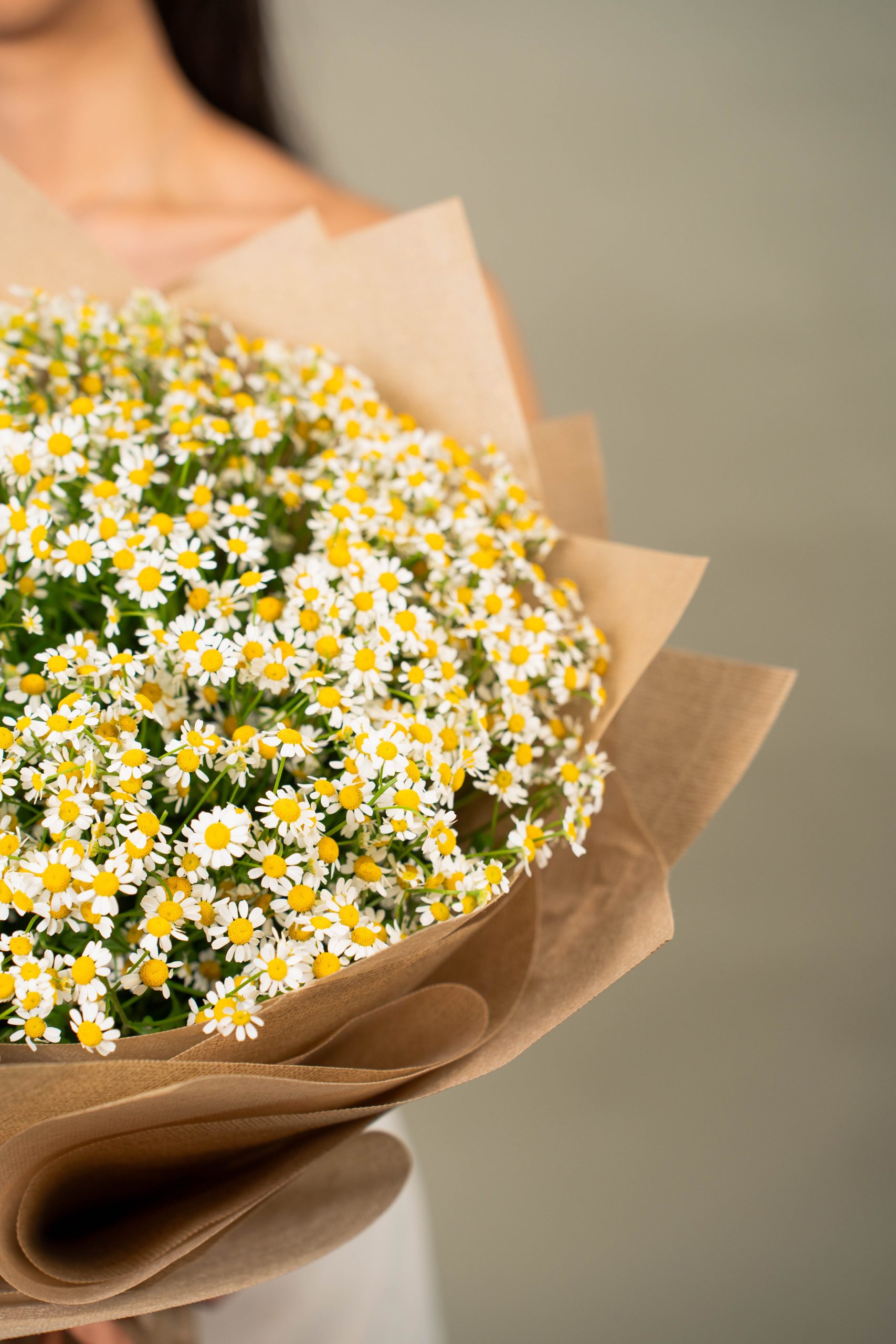 The daisies are gathered closely to form a full, rounded bouquet that reflects the effortless charm of wildflower fields. Wrapped in earthy kraft paper and finished with a soft ribbon, this bouquet has a rustic yet elegant presentation that highlights the flowers’ natural appeal.
