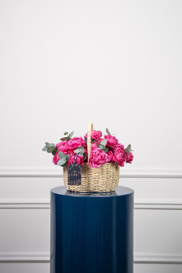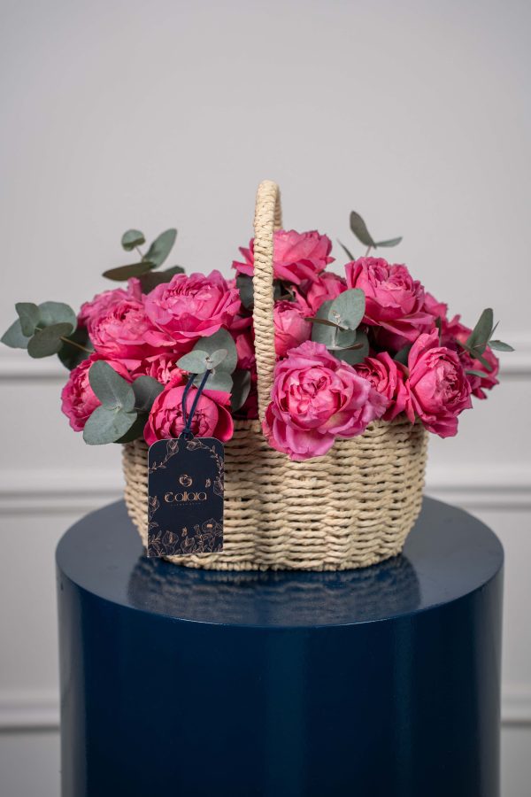 A radiant basket of vivid Jullieta cerise and lush eucalyptus, capturing the essence of beauty and joy in full bloom. Perfectly handcrafted to bring warmth and charm to any occasion.