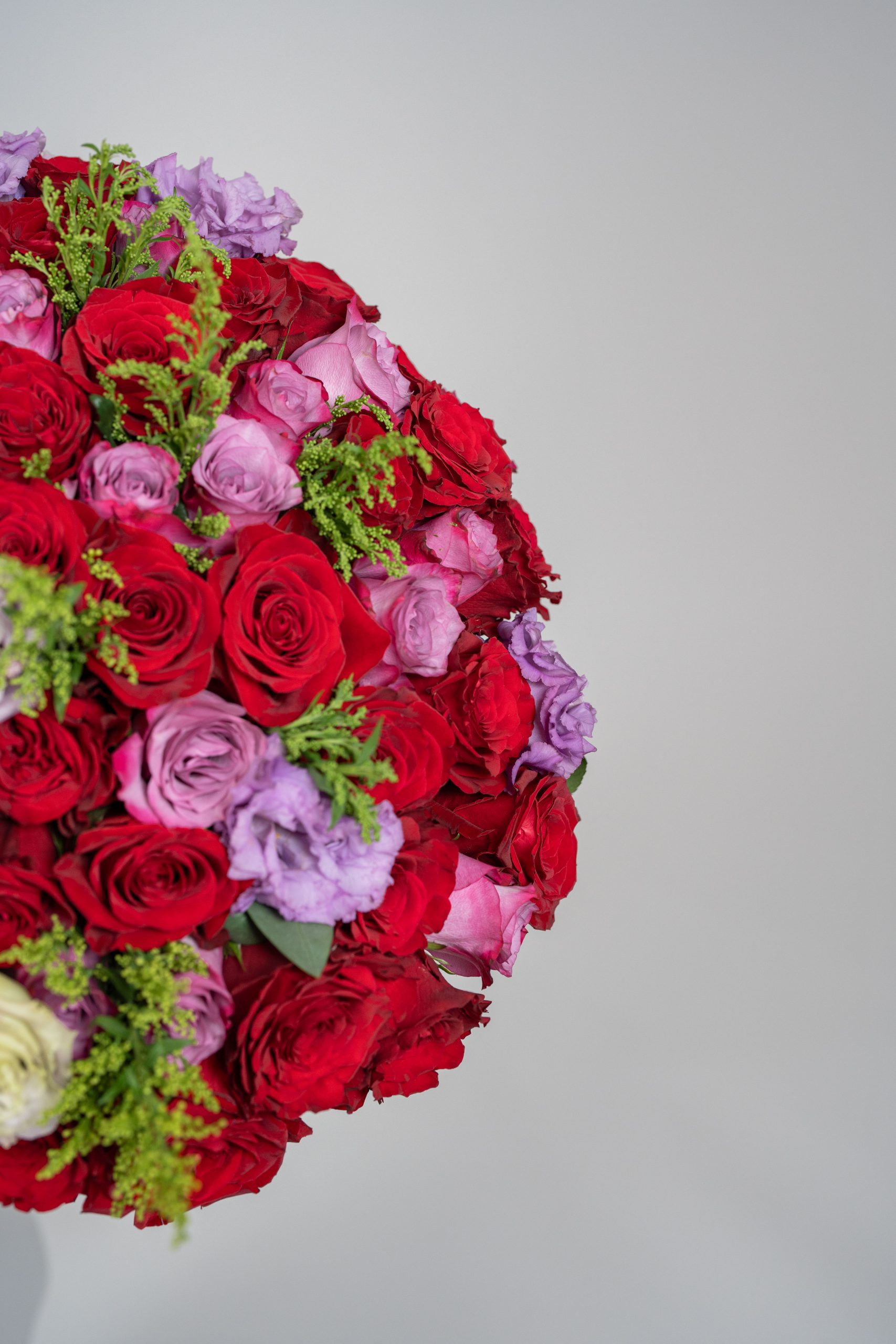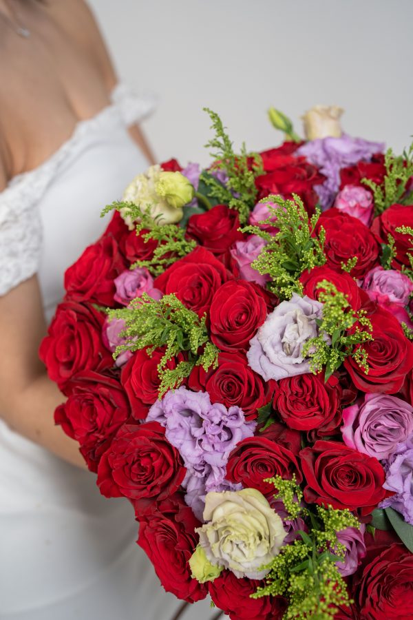The striking red roses symbolize deep love, desire, and devotion, while the cool lavender tones soften the arrangement with grace and sophistication. Touches of fresh greenery add texture and movement, creating a harmonious fusion of bold emotion and gentle elegance. The rounded, abundant silhouette gives the bouquet a timeless yet contemporary presence.
