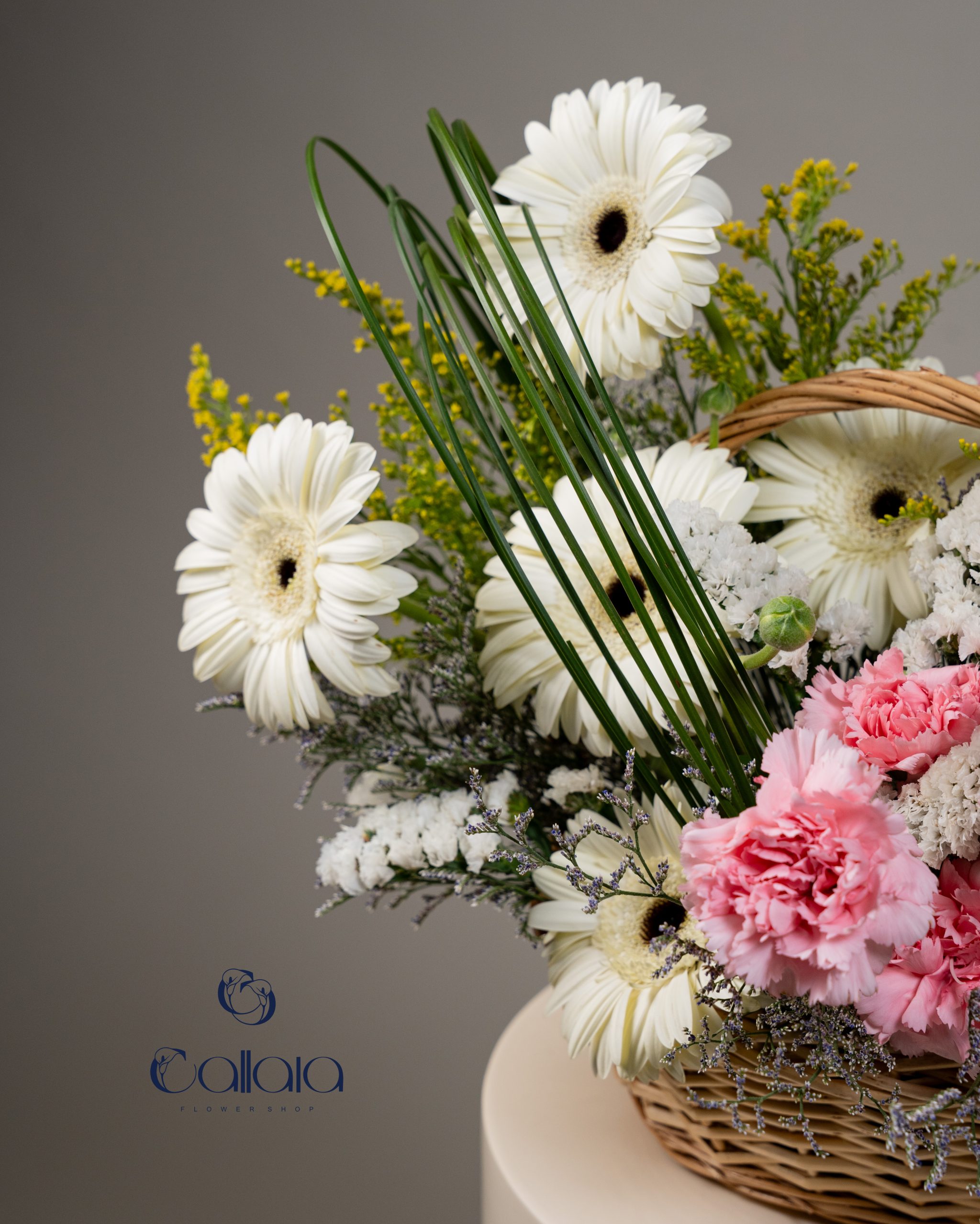 Architectural steel grass adds a modern, sculptural element, while complementary greenery softens the overall look. Thoughtfully arranged in a classic woven basket, Gerbera Grid combines a relaxed, garden-inspired feel with refined floral artistry.
