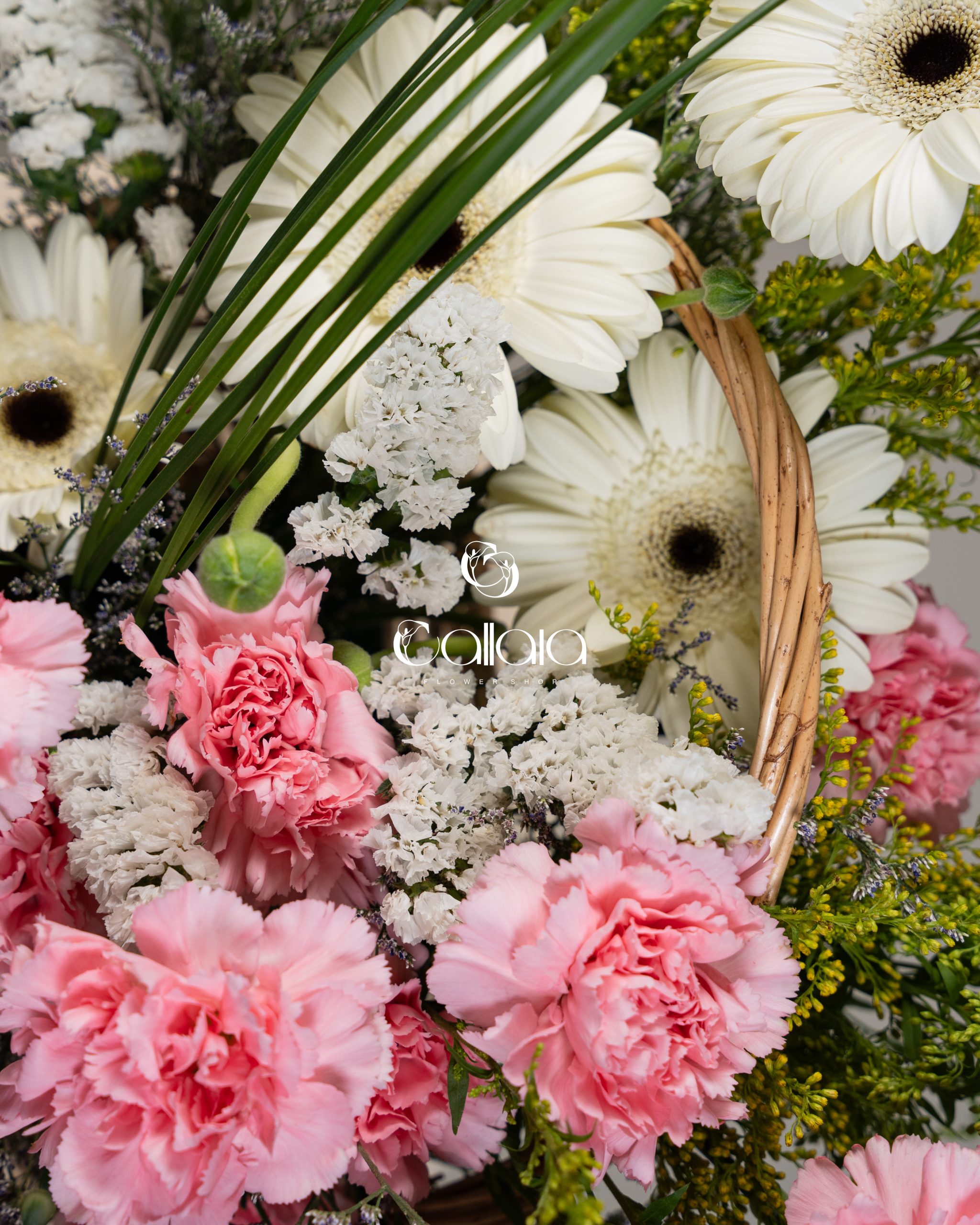 Gerbera Grid is a cheerful and elegant basket arrangement featuring fresh white gerbera, soft pink carnations, and textured seasonal florals, artfully designed for a bright and uplifting floral statement.