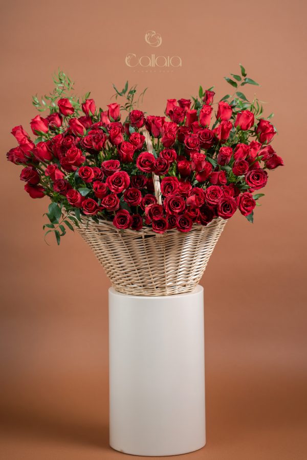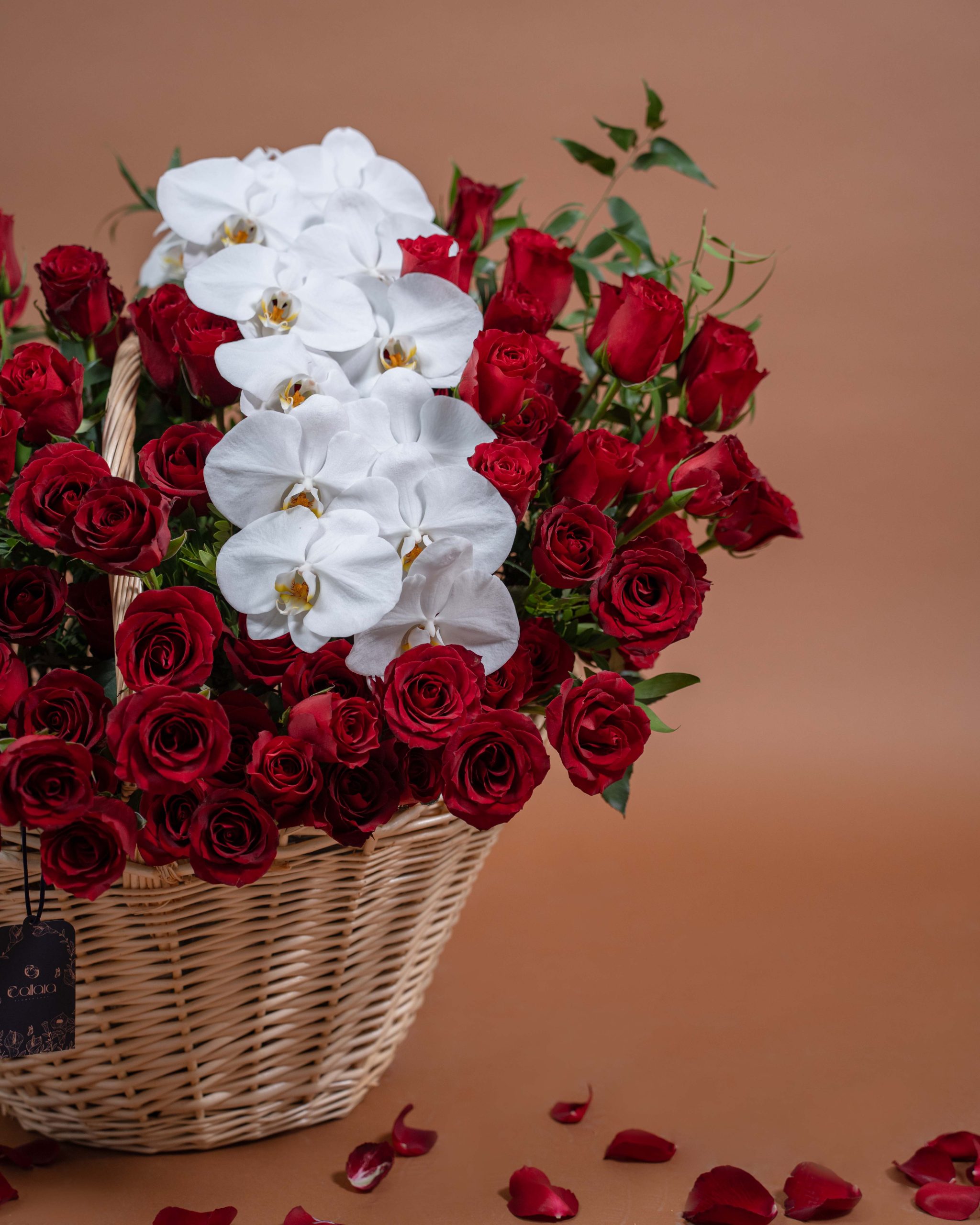 The rich crimson tones of the roses are enhanced by lush greenery, creating depth and fullness, while the flowing orchids introduce a sense of luxury and dramatic flair. Designed in a generous basket-style presentation, this arrangement commands attention and leaves a lasting impression.