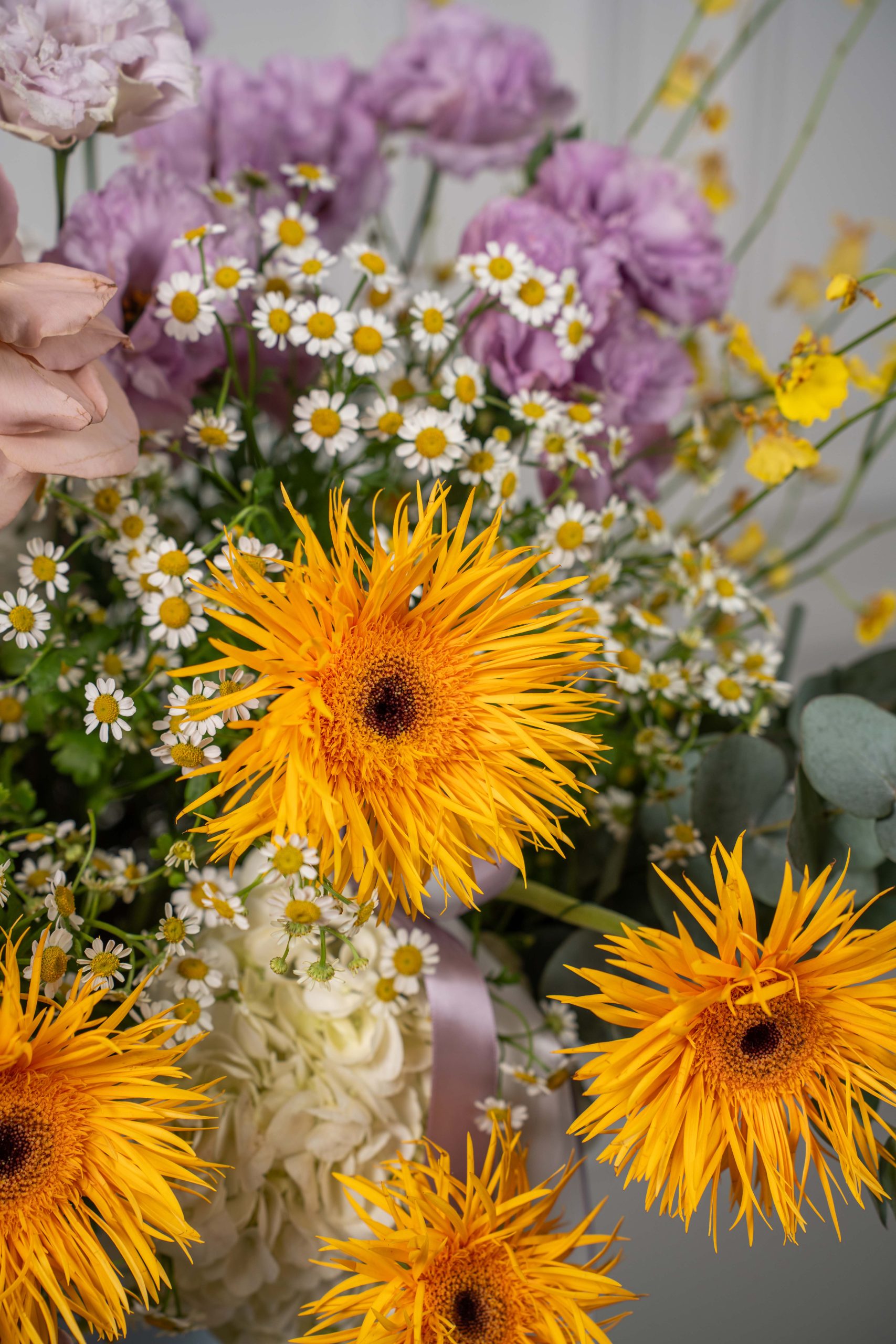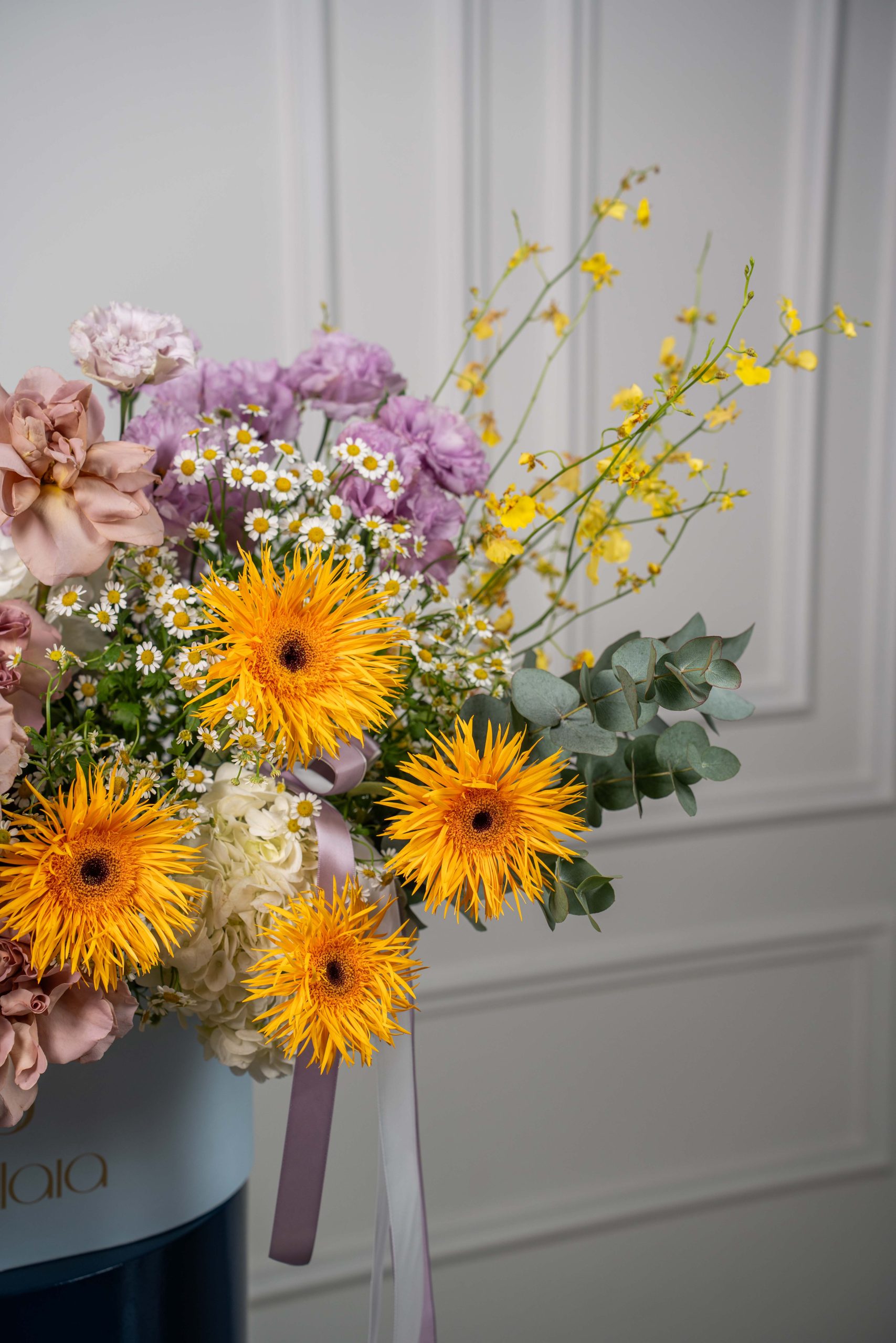 Honey Dust is a radiant arrangement that blends warm golden tones with soft pastels, creating a bouquet full of charm and sophistication. Featuring Cafe Latte roses, purple eustoma, white hydrangea, and cheerful yellow oncidium orchids, balanced with tanacetum and eucalyptus, this design is both elegant and uplifting.