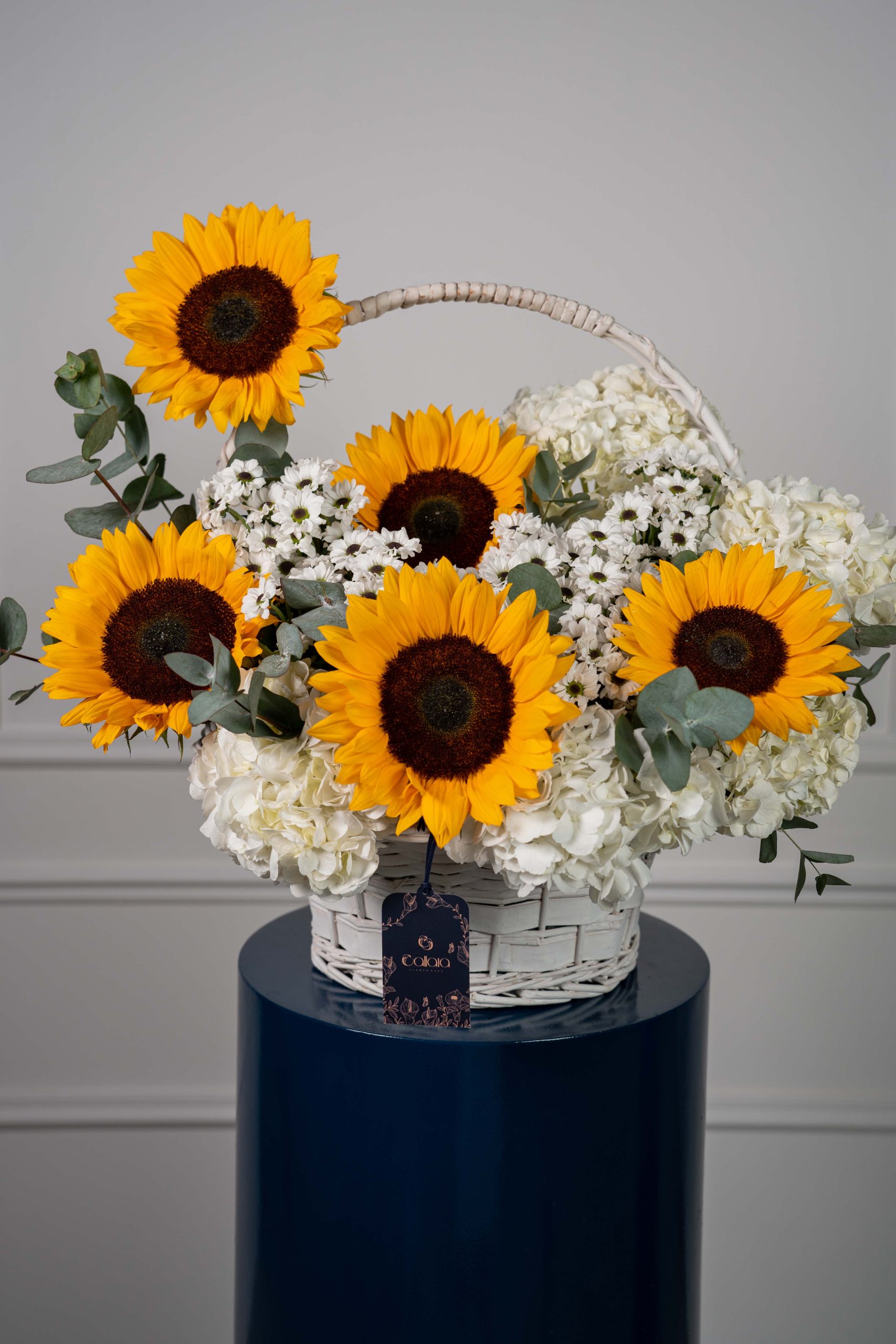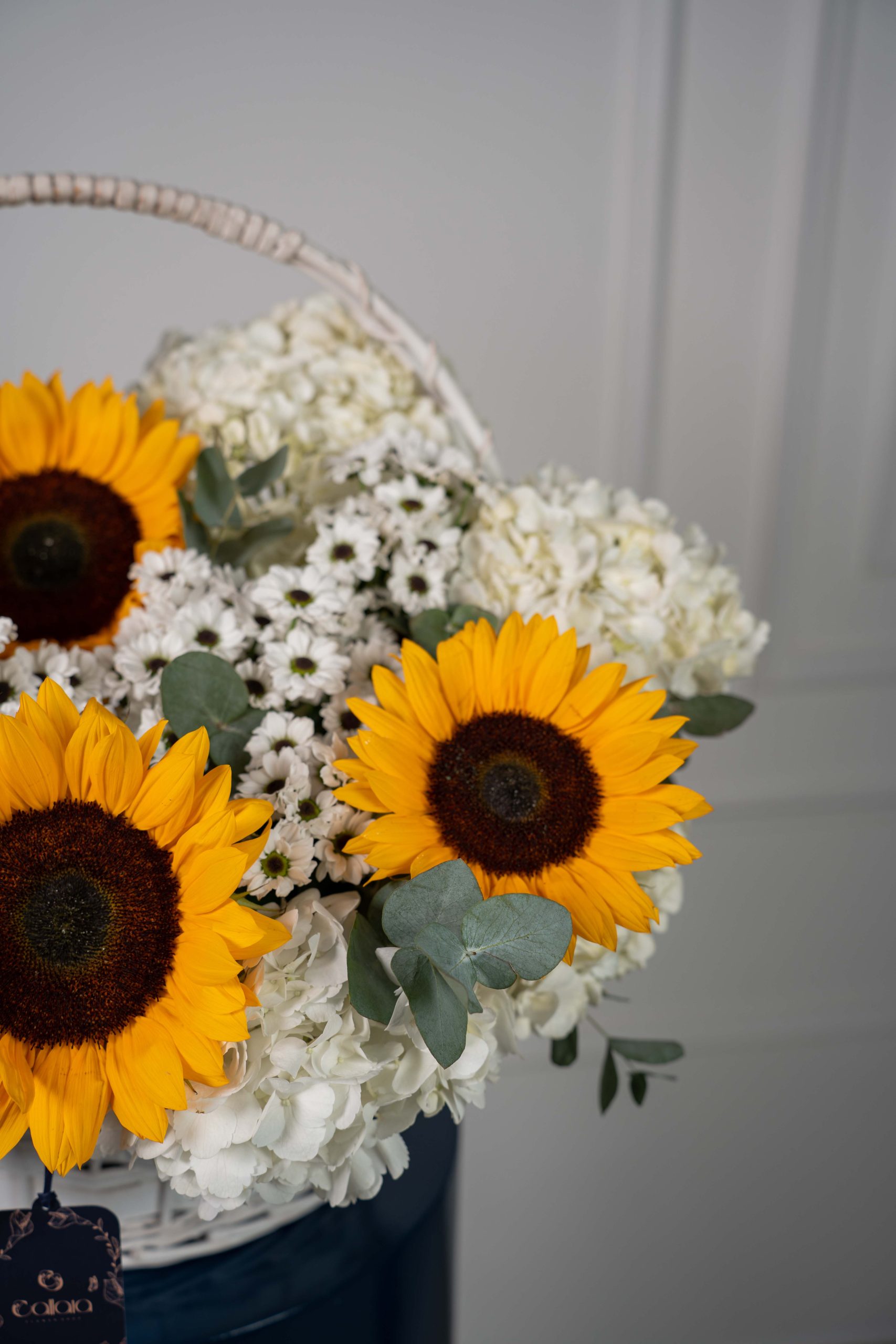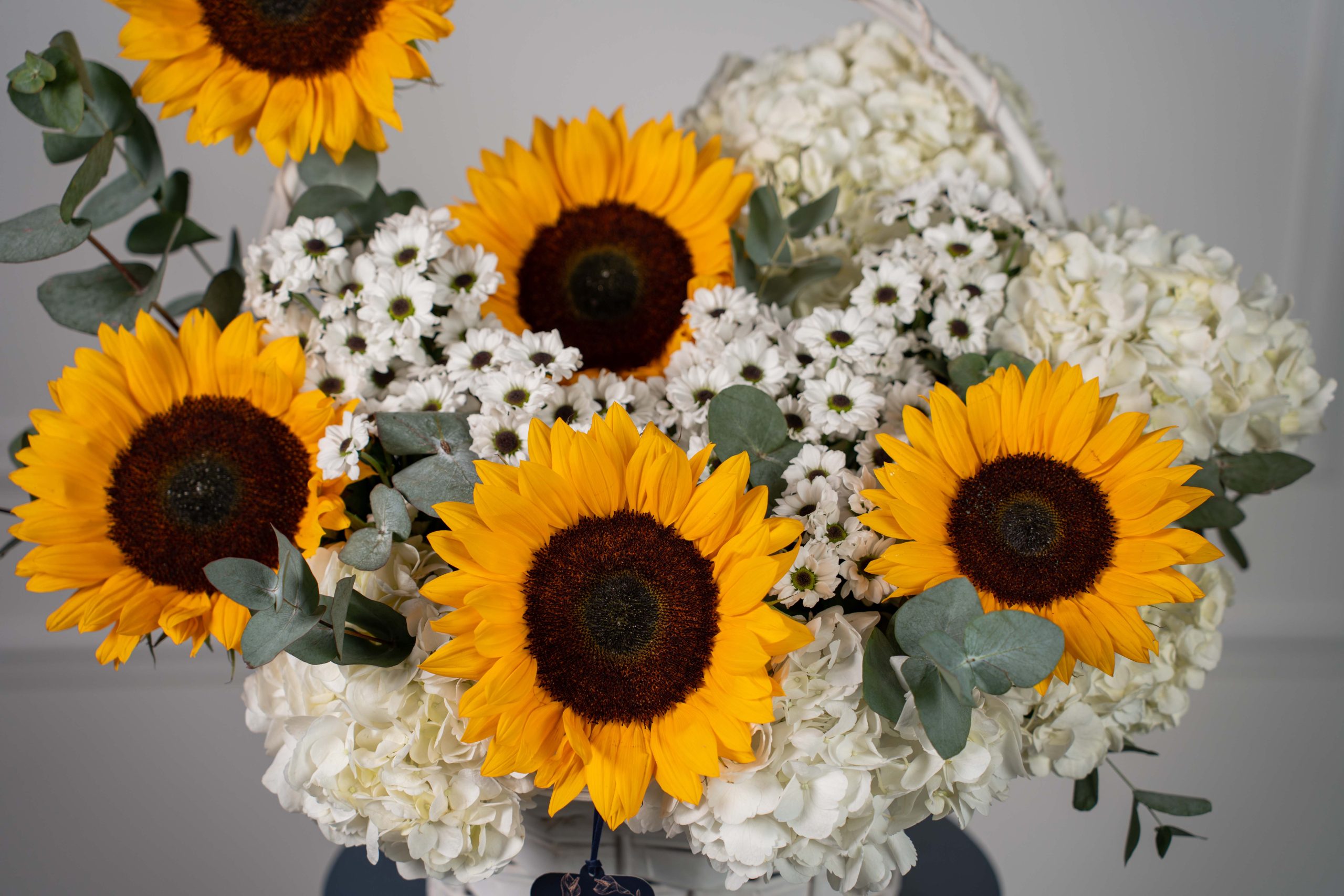 Luminara is a radiant basket arrangement featuring vibrant sunflowers, soft white hydrangea, and delicate white florals, accented with eucalyptus for a fresh and uplifting look.