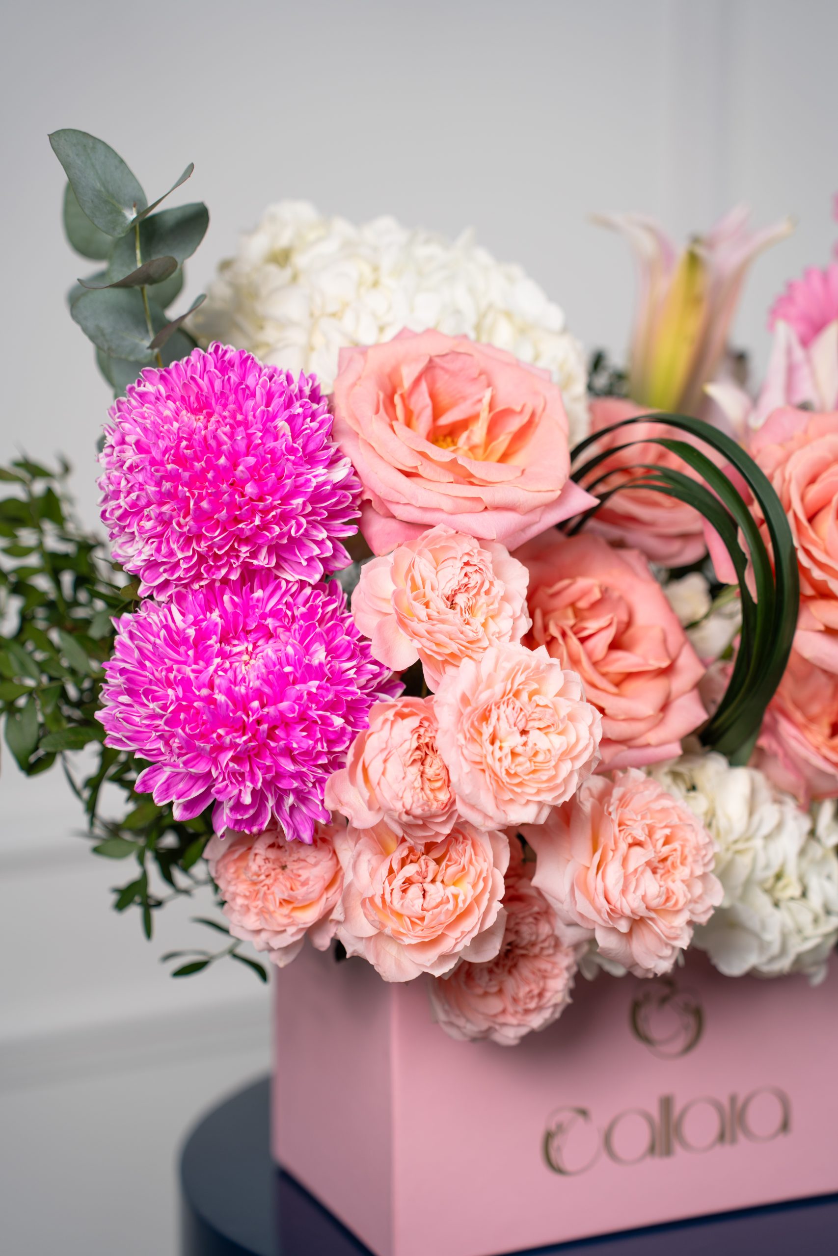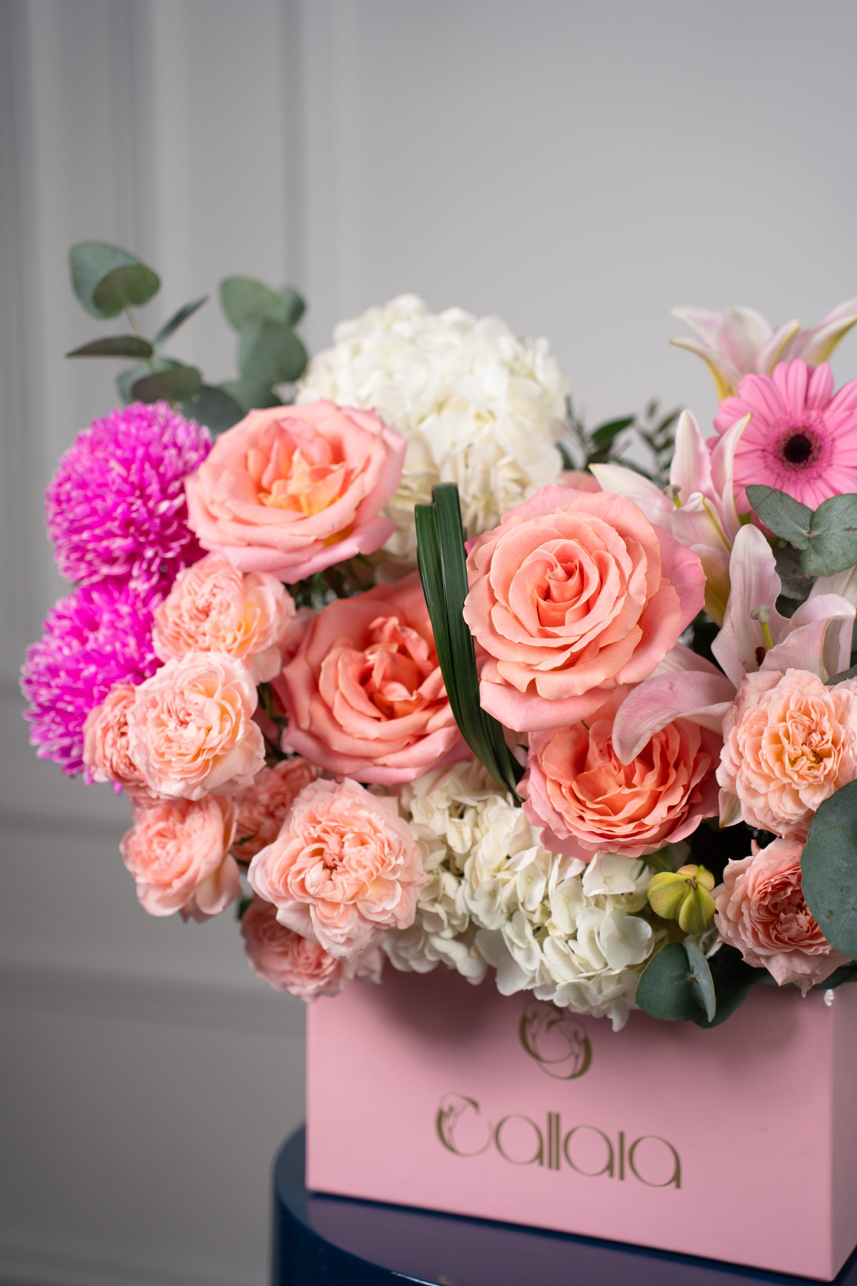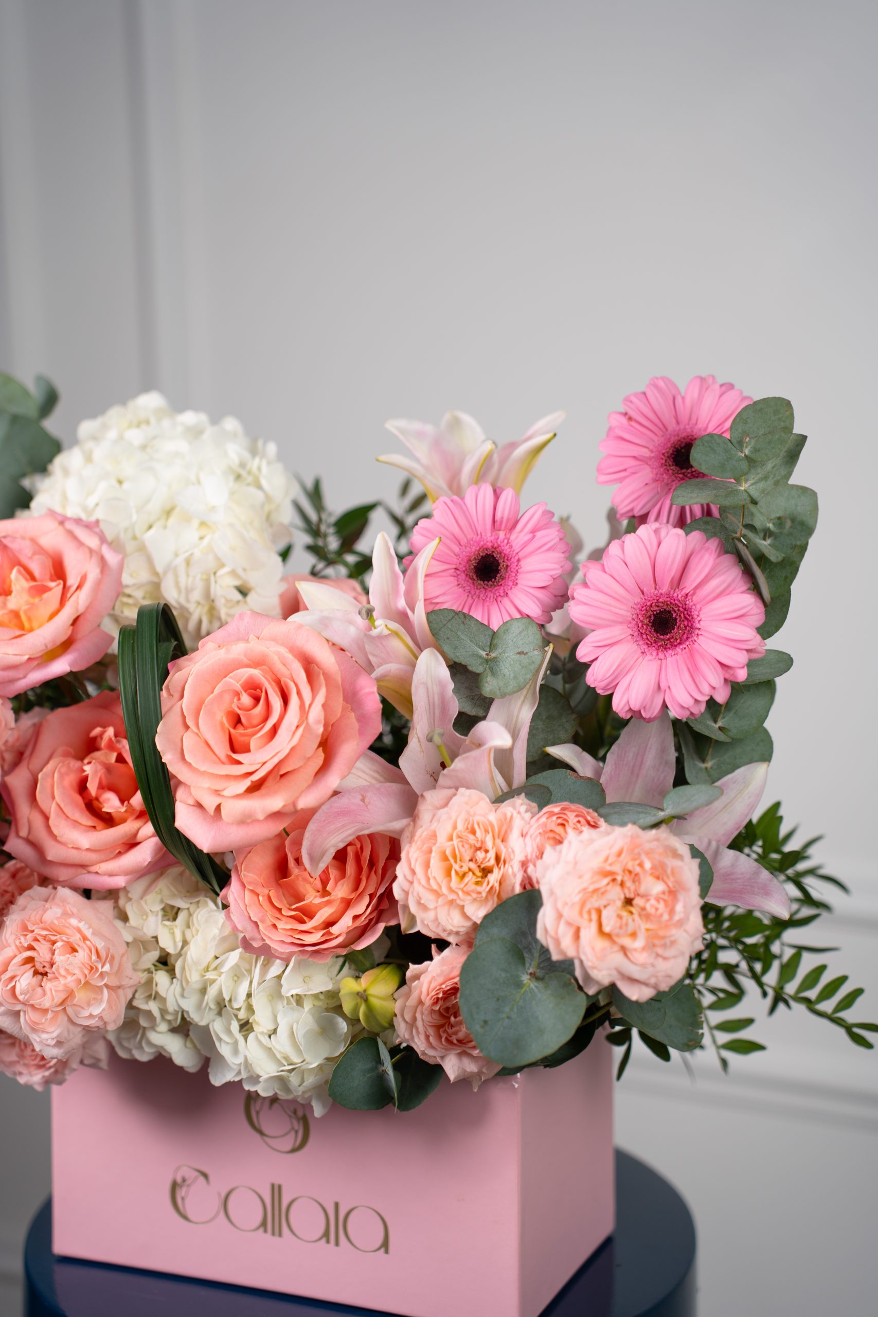 Lumira is a charming blend of white hydrangeas, Hermosa roses, pink germini, soft pink lilies, dark-pink chrysanthemum peonies, and peach Julieta spray roses — crafted beautifully in Callaia’s signature box.
