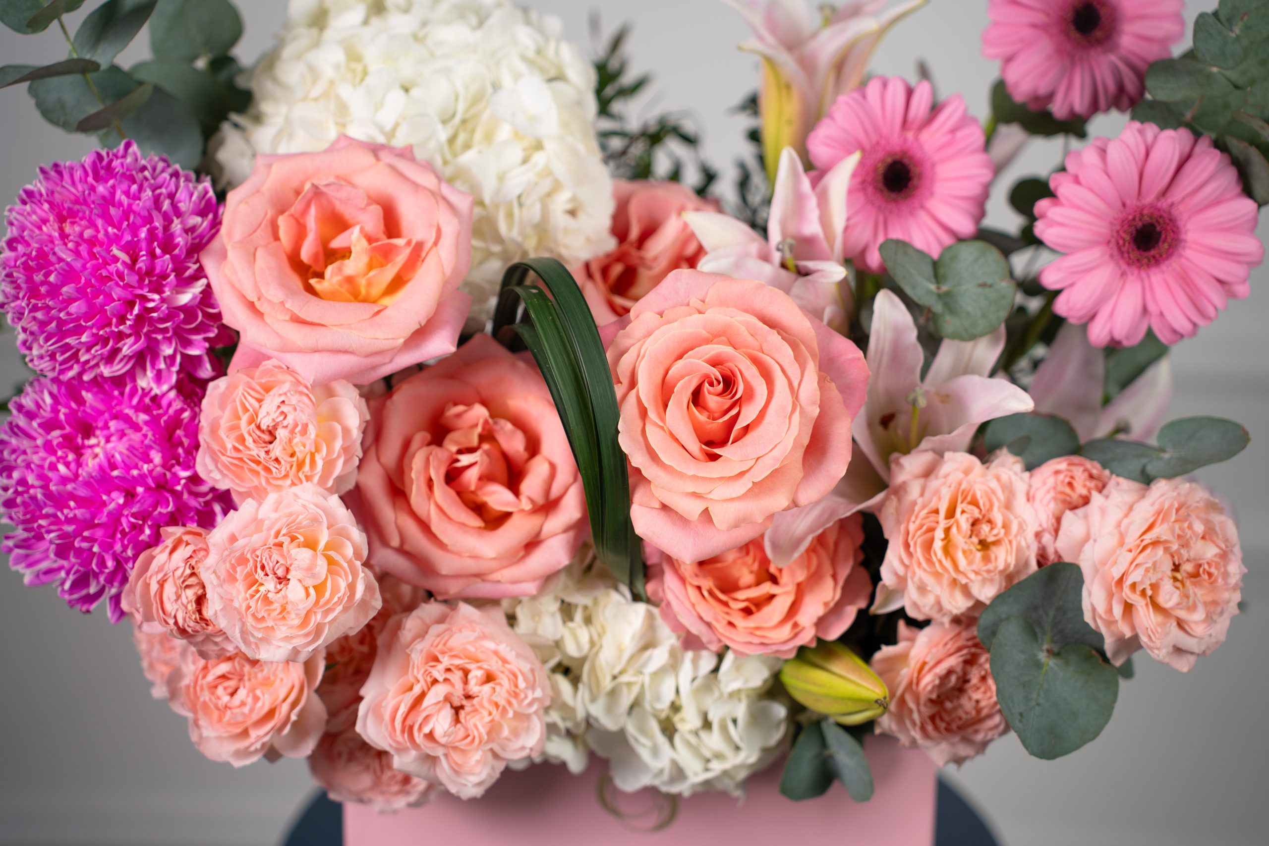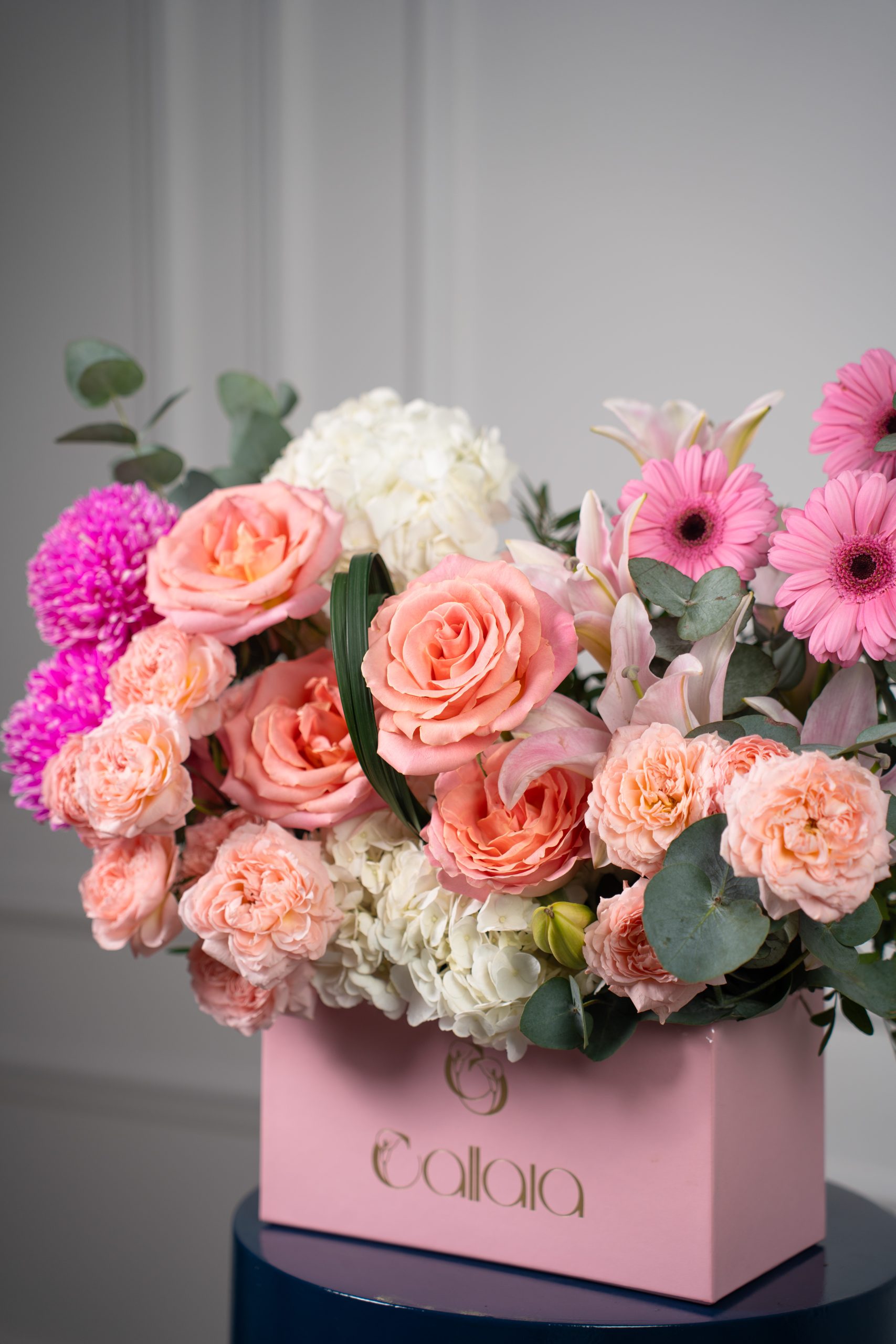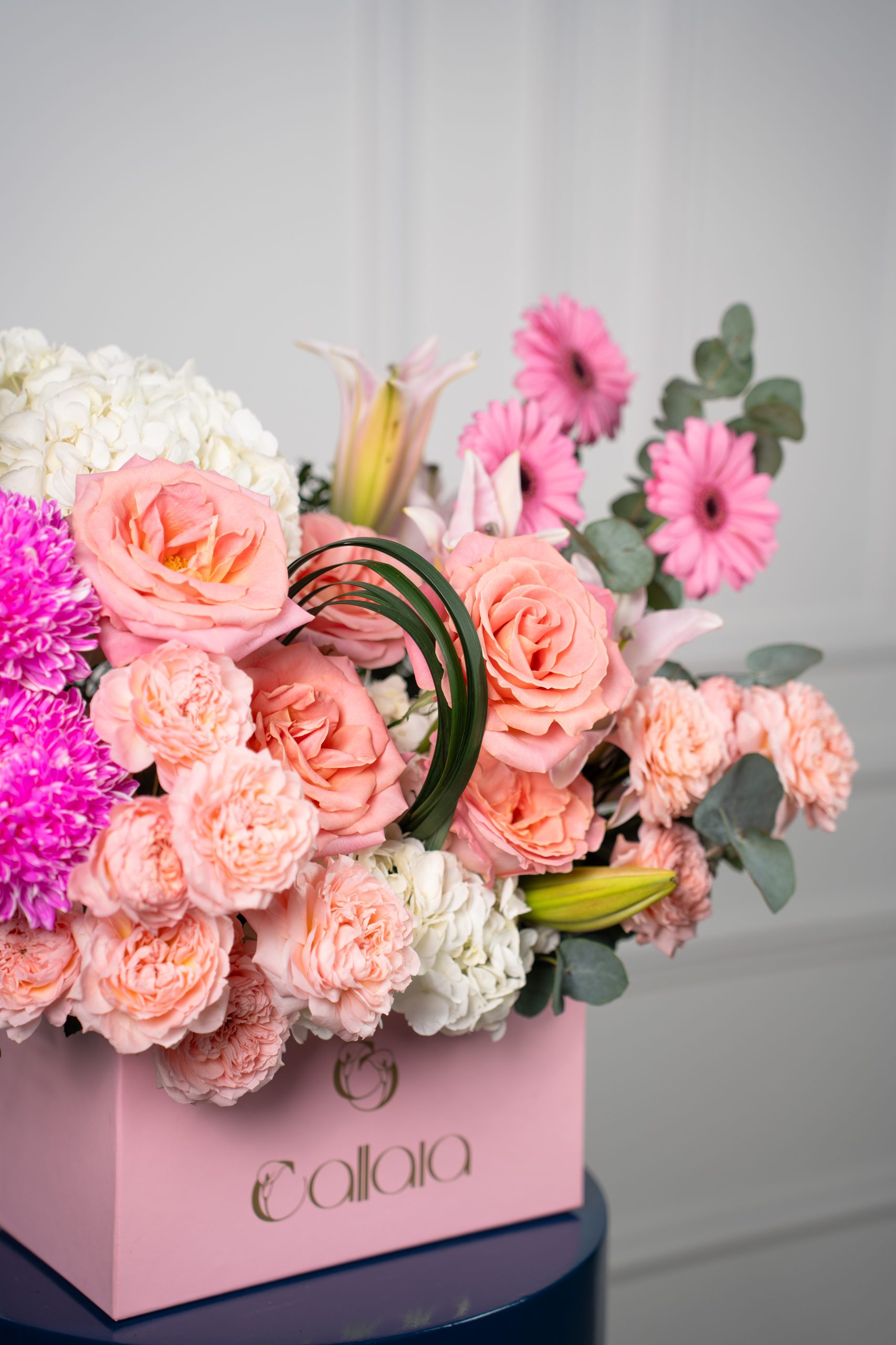 Lumira is a charming blend of white hydrangeas, Hermosa roses, pink germini, soft pink lilies, dark-pink chrysanthemum peonies, and peach Julieta spray roses — crafted beautifully in Callaia’s signature box.
