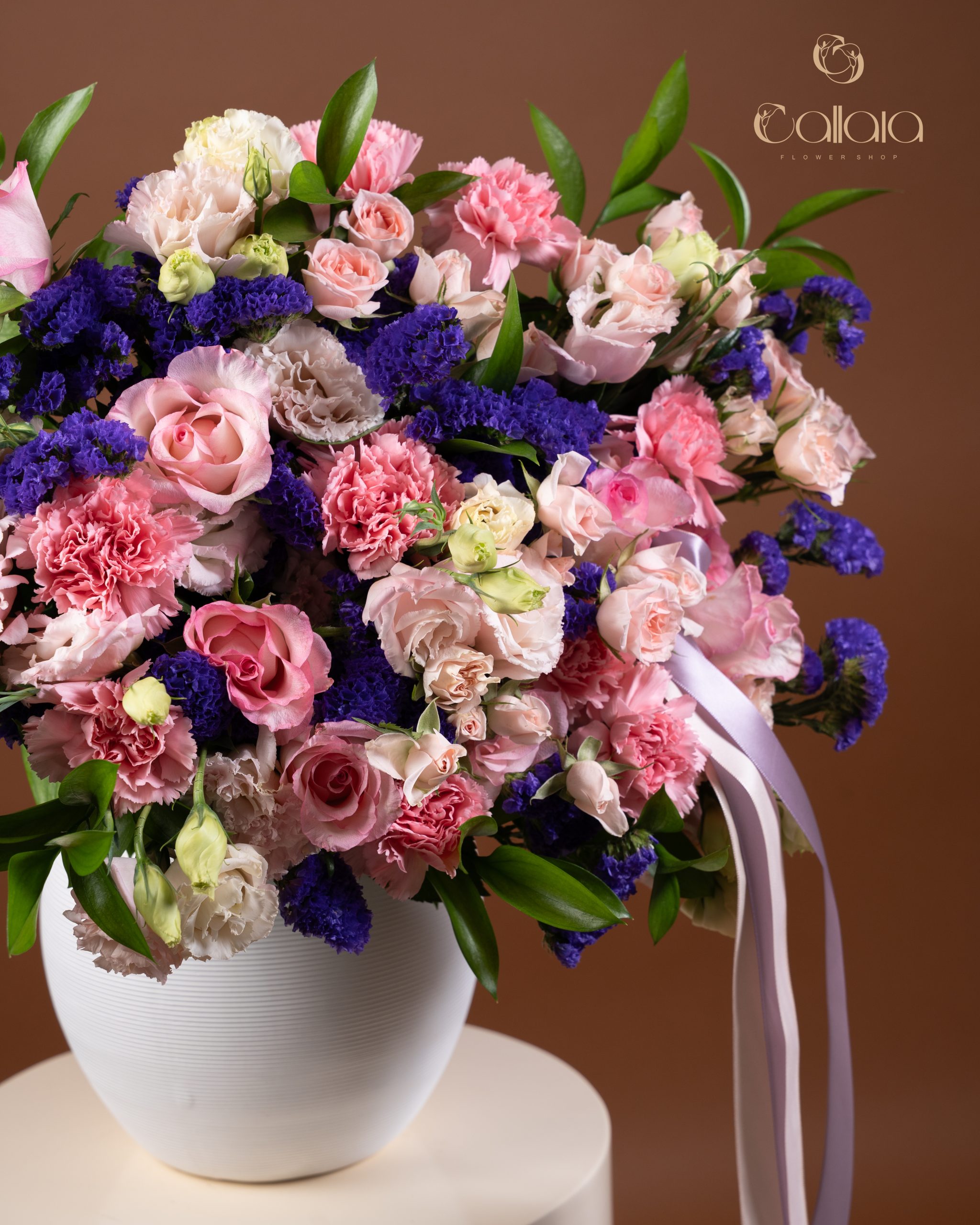 Mystic Garden is a romantic and expressive arrangement of soft pink roses, delicate carnations, and rich purple accents, styled in a modern ceramic vase for a dreamy, artistic look.