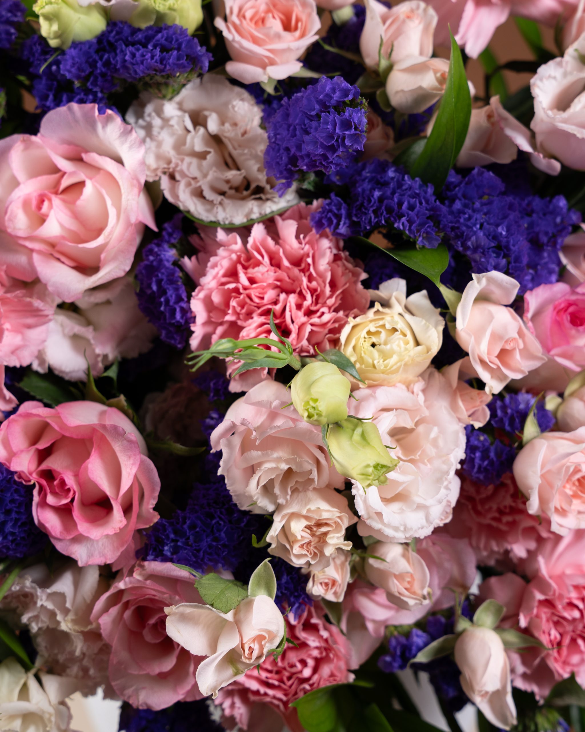 Mystic Garden is an enchanting composition inspired by softness, depth, and natural harmony. Featuring blush and pastel pink roses as the focal blooms, this arrangement is beautifully complemented by gentle pink carnations and touches of purple florals that add contrast and character. Fresh greenery brings balance and movement, creating a layered design that feels lush yet refined.