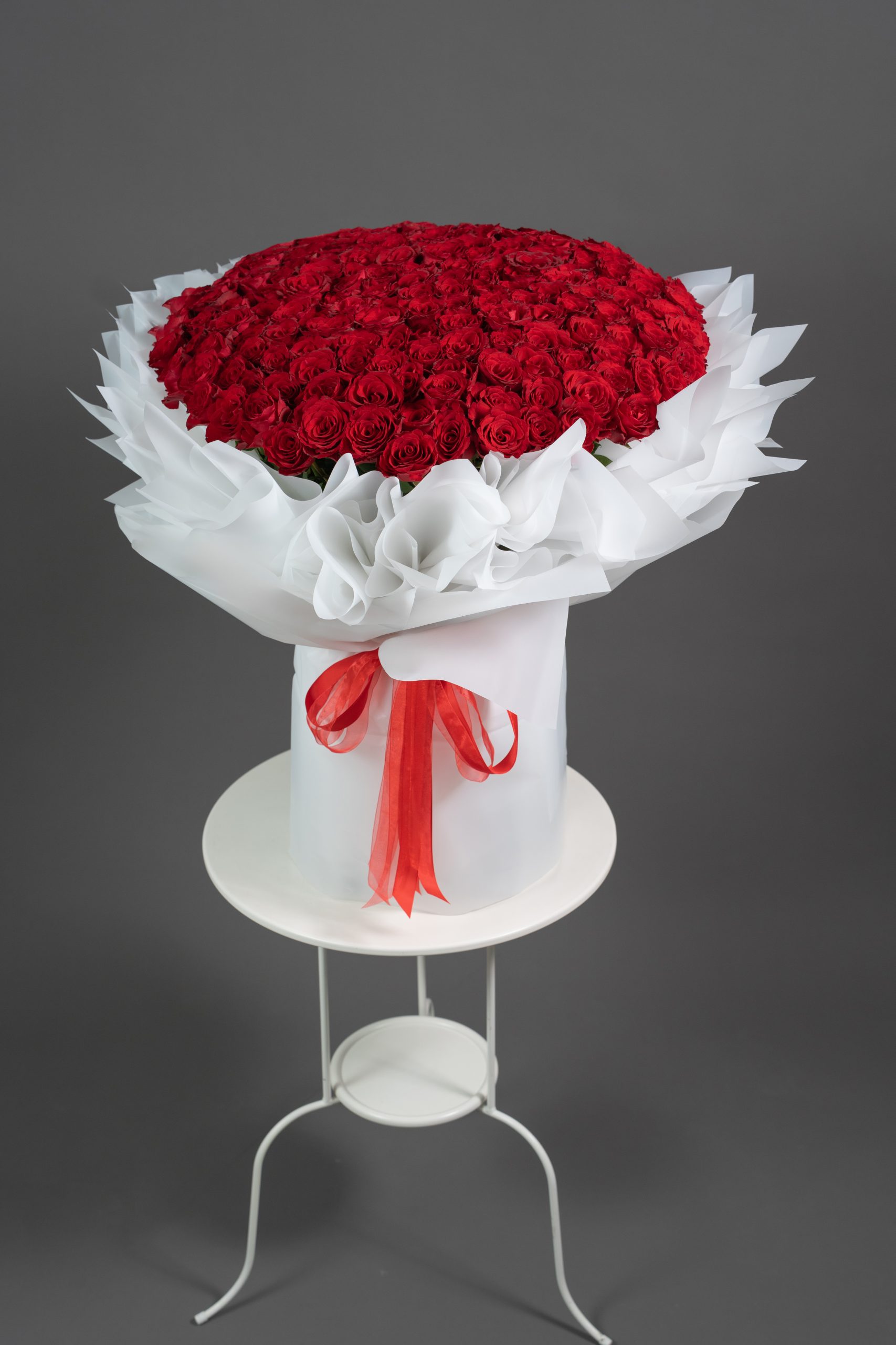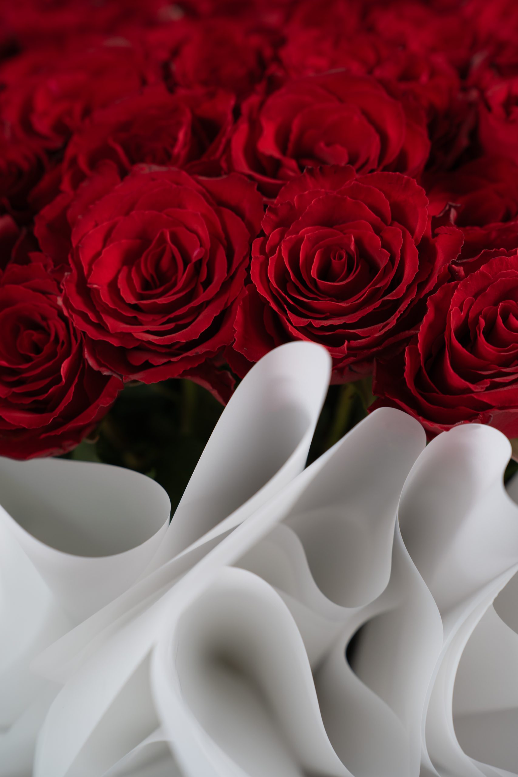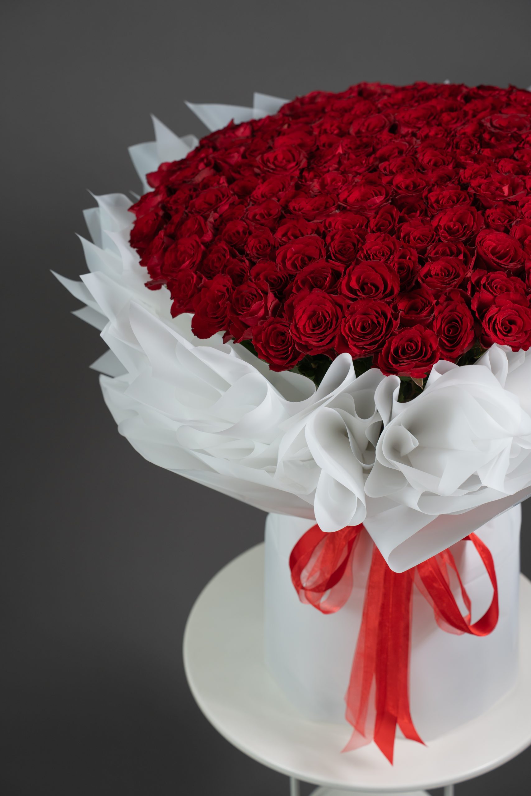 Each rose is carefully placed to create a lush, full presentation that radiates passion, intensity, and timeless elegance. Soft white wrapping enhances the richness of the red blooms, allowing their beauty to stand boldly at the forefront.