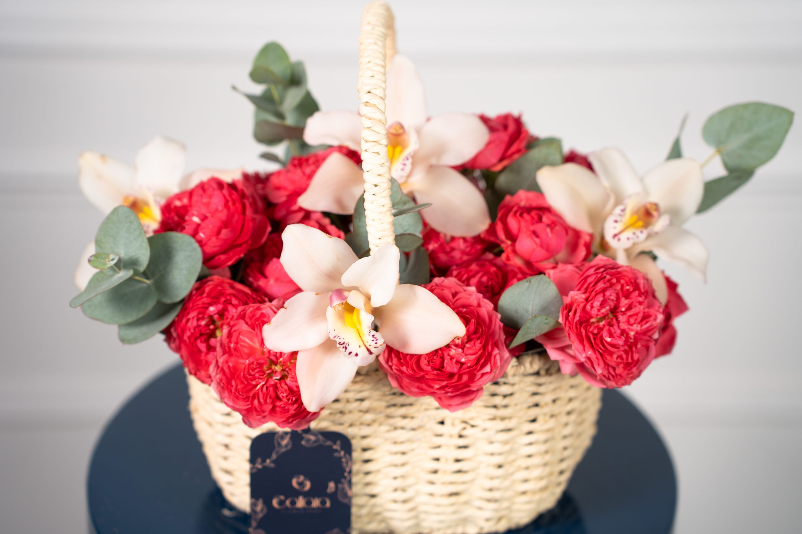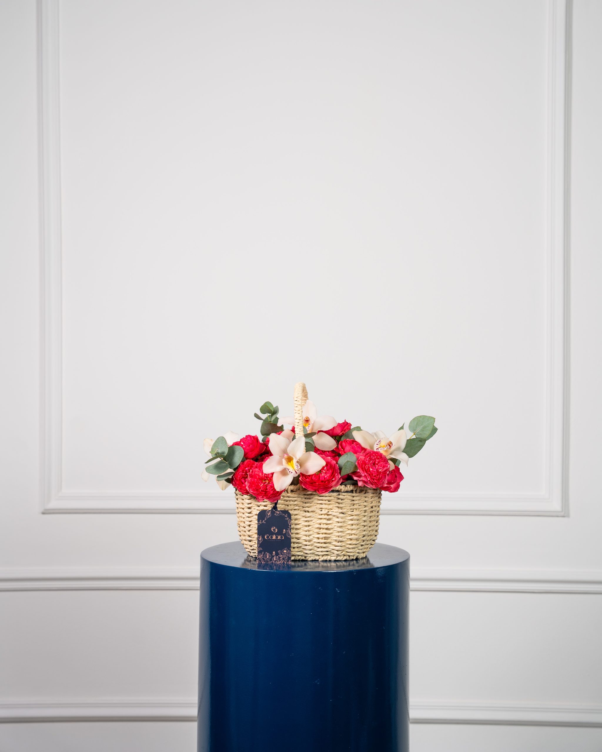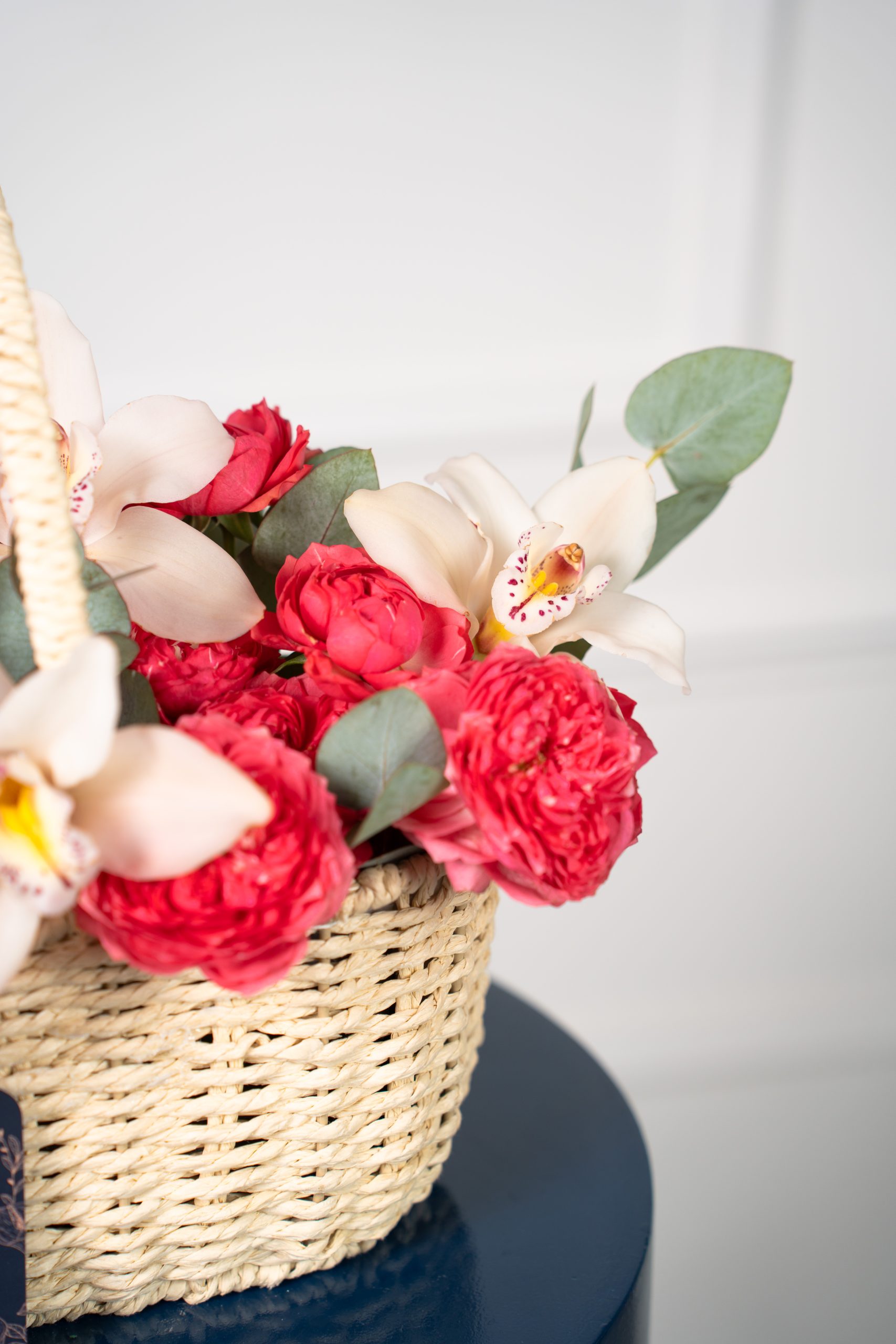 Delicate and striking, ORCHAVEN blends the rich charm of raspberry spray roses with the exotic elegance of creamy cymbidium orchids, softened by fresh eucalyptus. A basket that speaks of beauty, sophistication, and warmth.