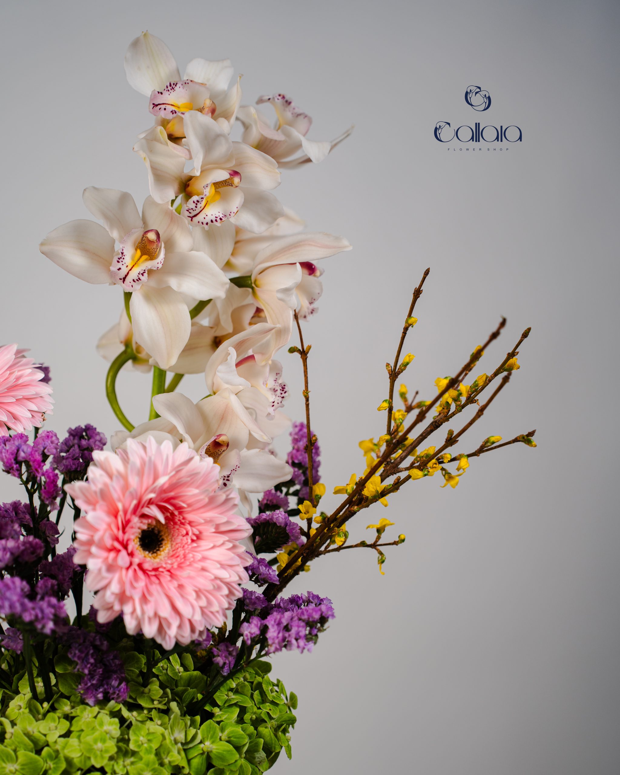Orchid Muse is a refined and artistic floral arrangement featuring elegant white orchids, soft pink gerbera, fresh hydrangea, and textured seasonal accents, beautifully composed for a modern and graceful statement.