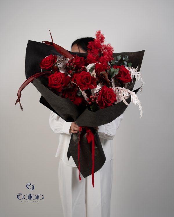 Wrapped in luxurious black paper and finished with flowing red ribbon accents, Passion Bloom creates a powerful contrast that elevates its visual impact. Every element is carefully arranged to convey confidence, sophistication, and emotional intensity.