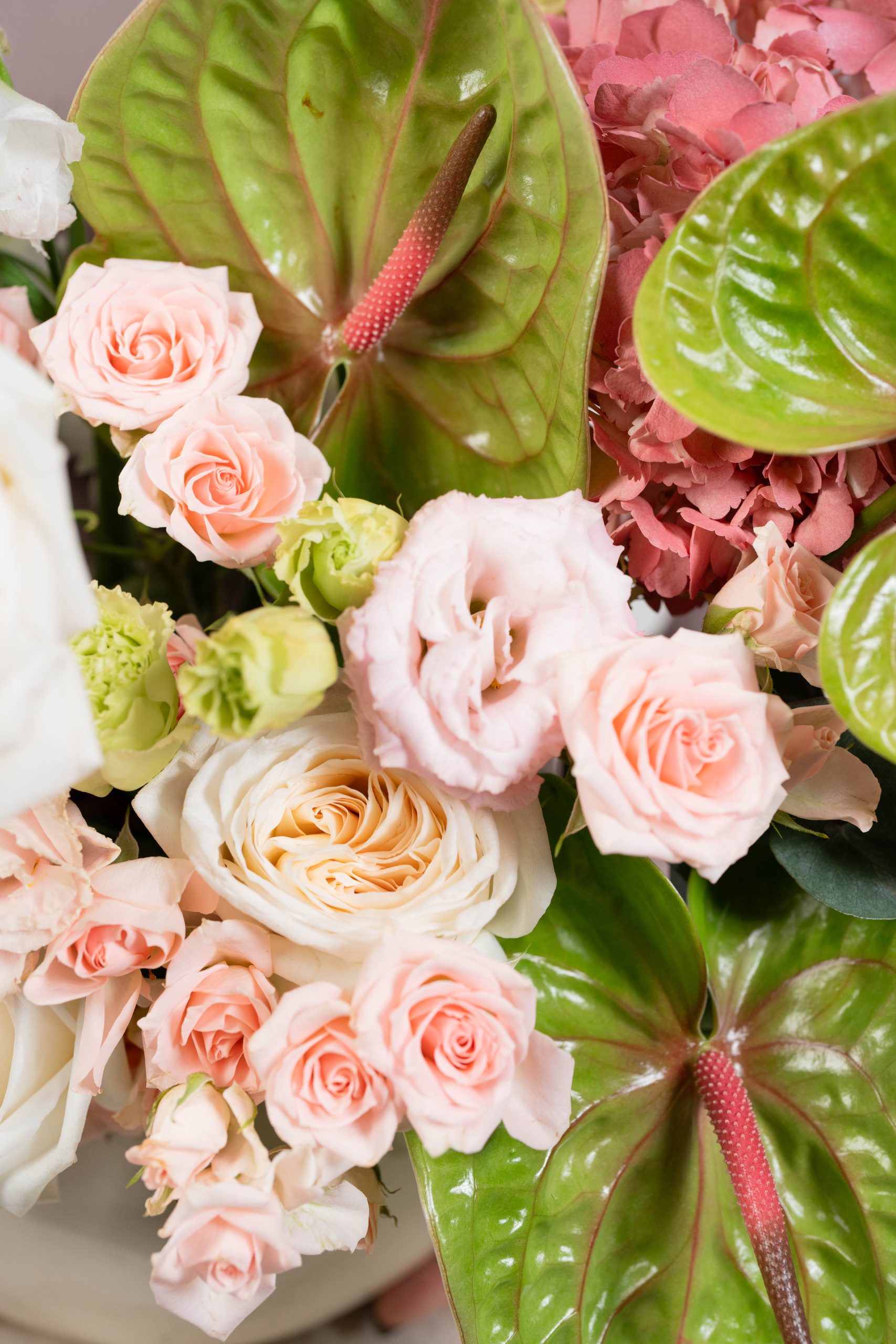 Passion Breeze is a graceful floral composition that blends romance, movement, and modern elegance. This arrangement features a delicate mix of blush pink and creamy ivory flowers, carefully selected for their softness and natural beauty. Sculptural anthuriums add a distinctive focal point, introducing texture and a contemporary edge that elevates the overall design.