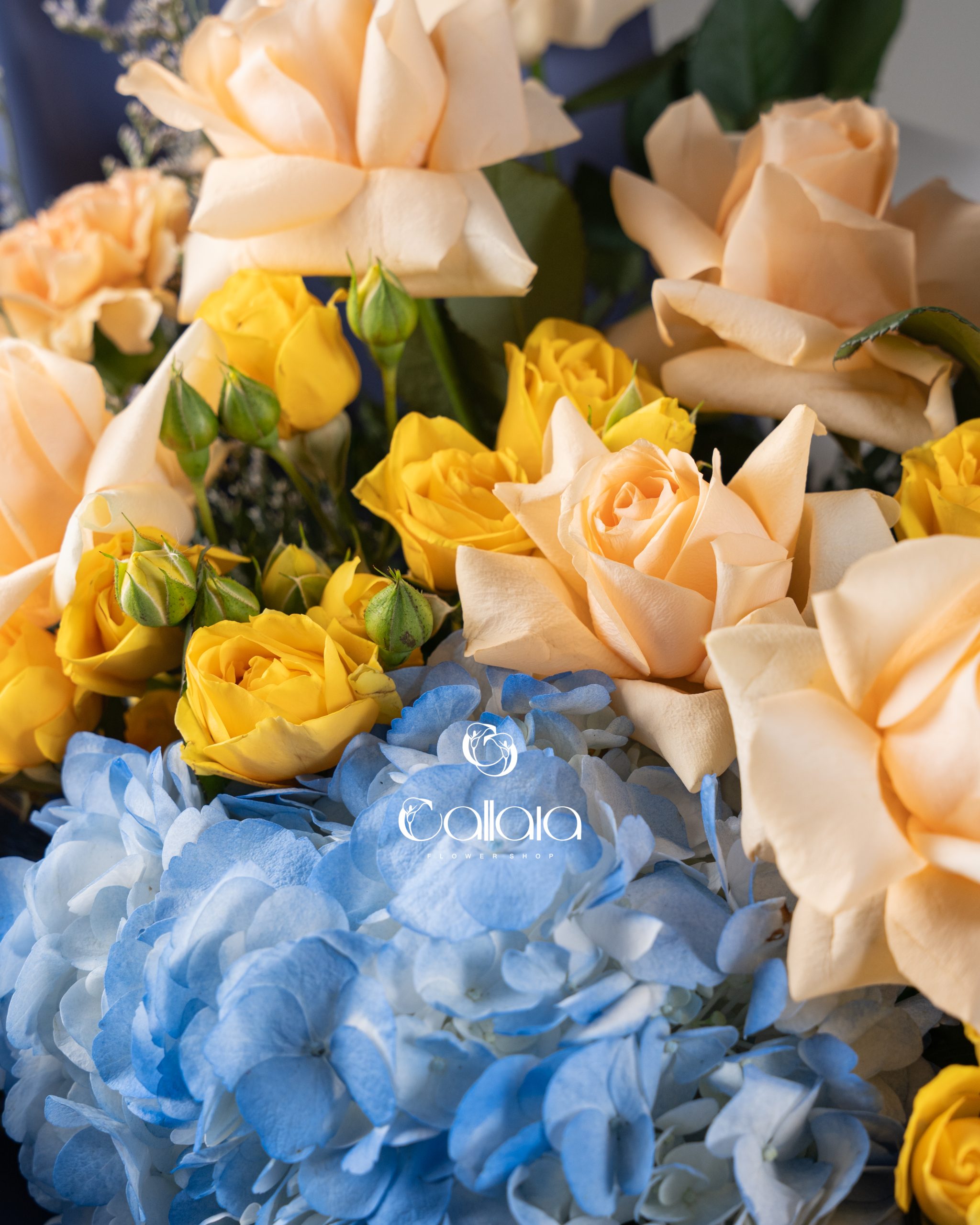 Peach Sky is a graceful and uplifting bouquet featuring soft peach roses, cheerful yellow accents, and delicate blue hydrangea, wrapped in elegant blue tones for a fresh and harmonious presentation.
