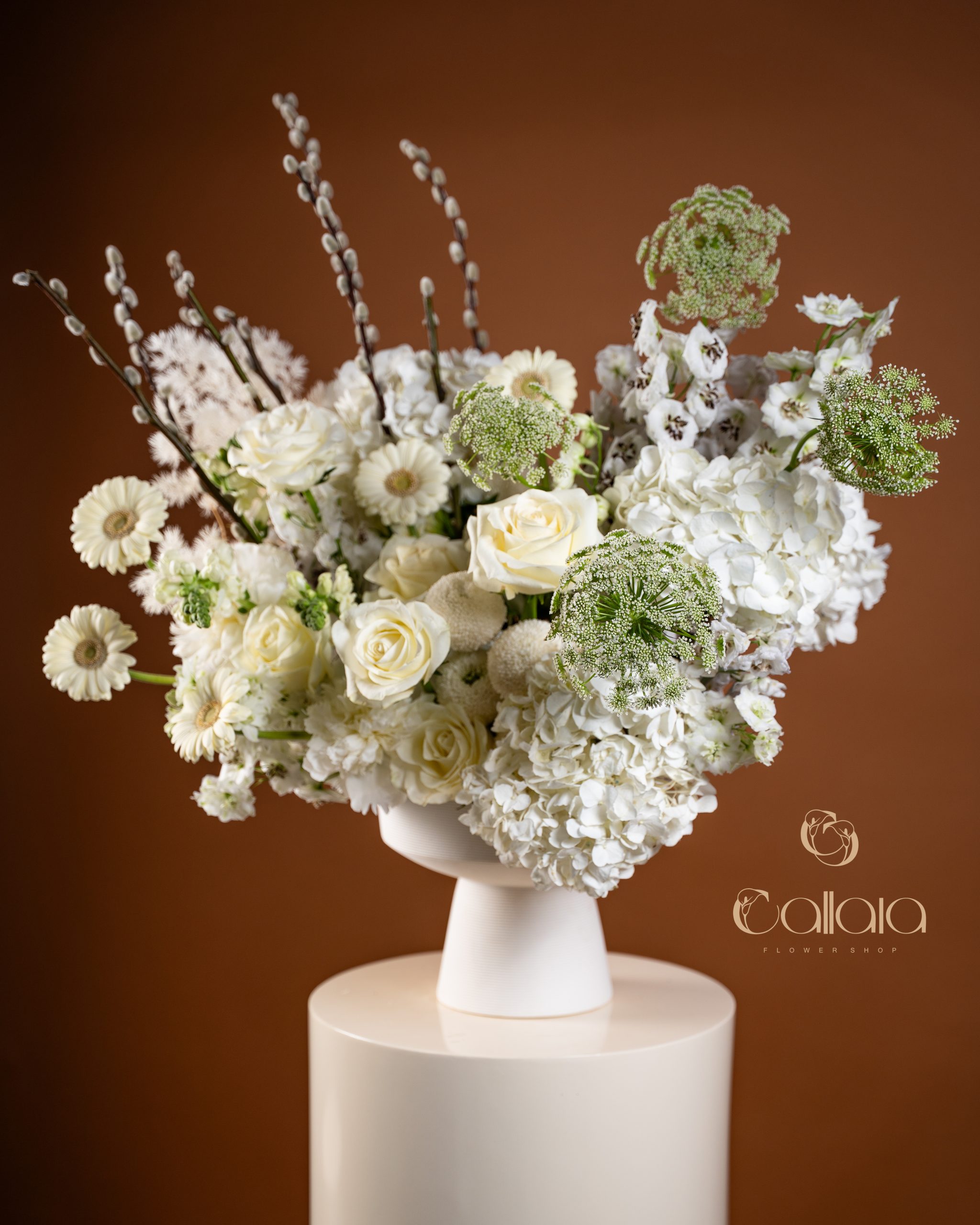 Designed in a minimalist ceramic vase, Pearl Bloom blends contemporary design with classic floral beauty. Its soft white tones and sculptural form make it an elegant choice for refined interiors, thoughtful gifting, and special occasions that call for quiet sophistication.