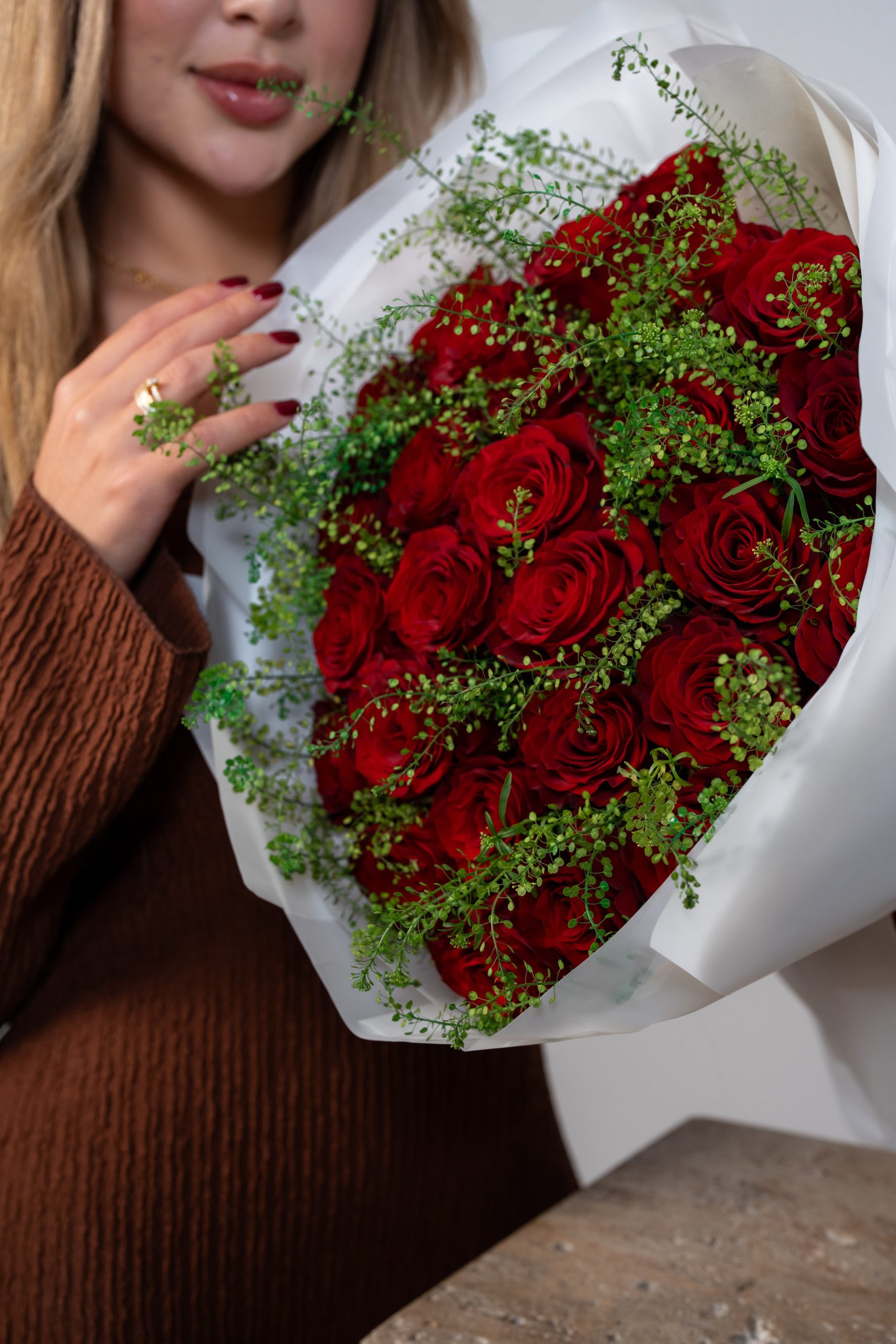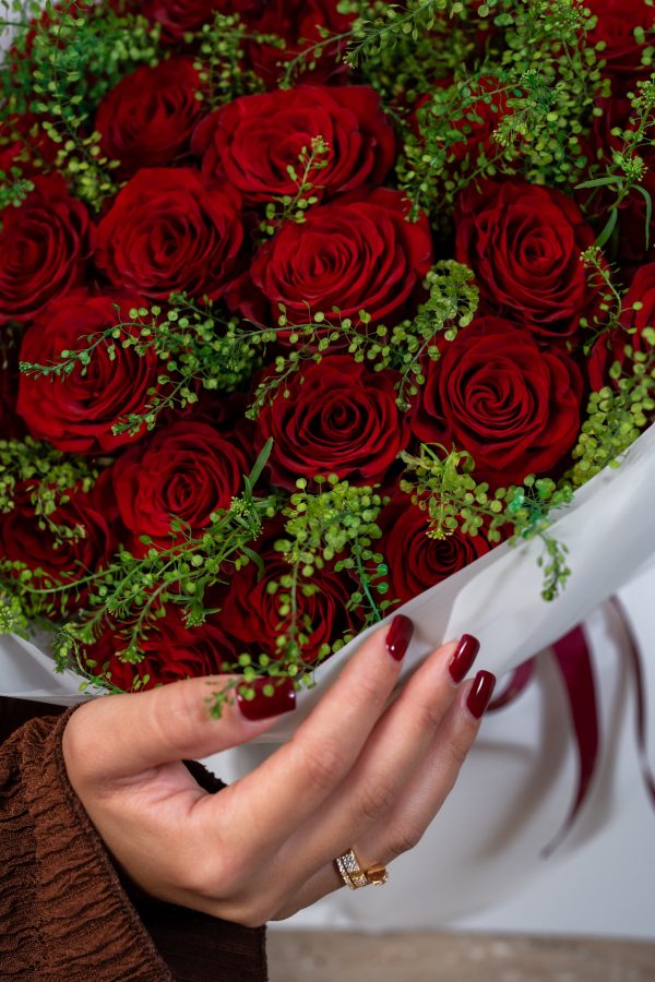 Red roses have long symbolized true love, passion, and devotion, making this bouquet a powerful and meaningful gesture. The simplicity of the design allows the beauty of each rose to shine, creating a look that is both luxurious and timeless. Soft greenery weaves gently throughout, enhancing depth while keeping the focus on the striking red blooms.