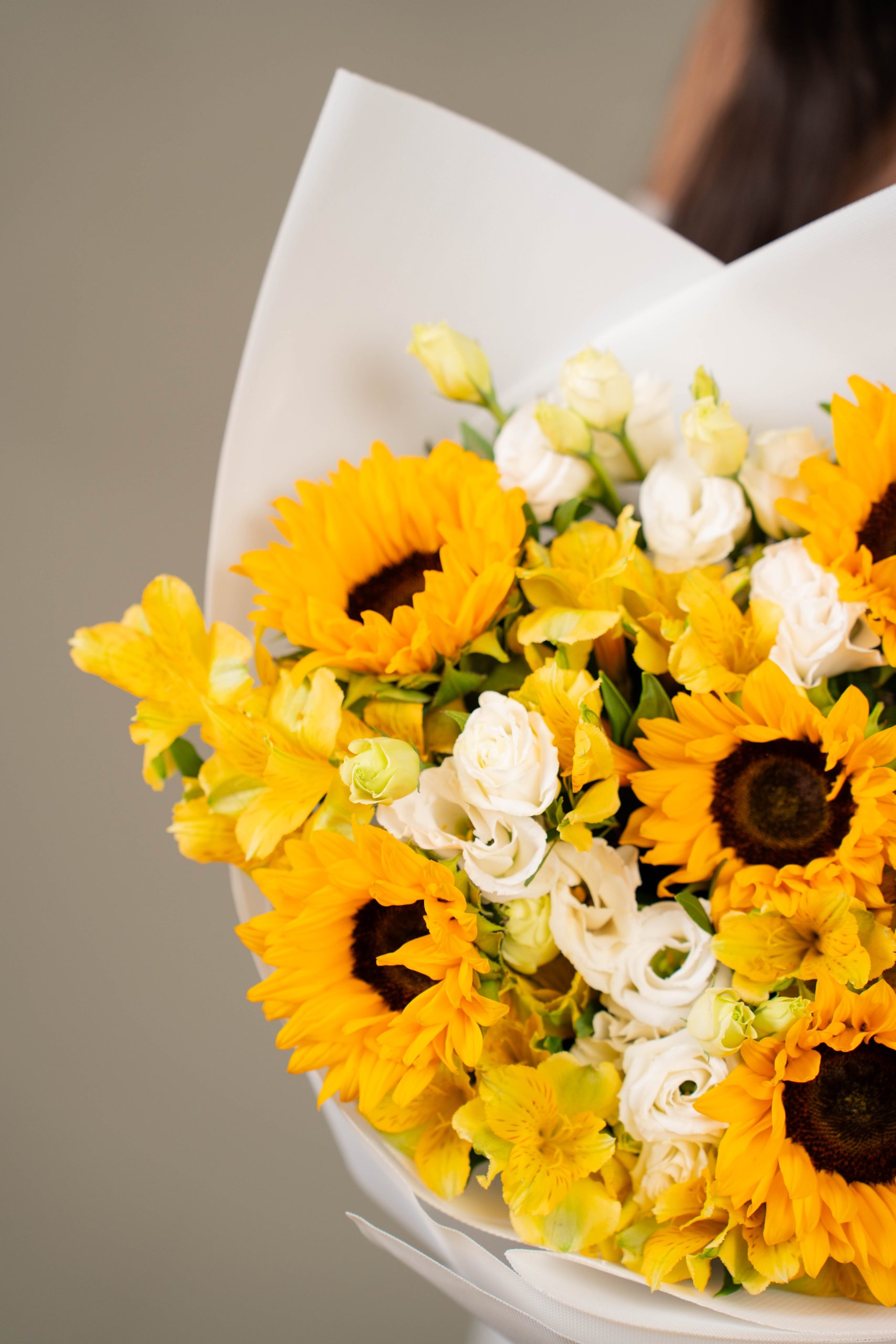 Radiant Joy is a bright and uplifting bouquet featuring golden sunflowers paired with soft white blooms, beautifully wrapped in crisp white paper for a fresh and cheerful floral gift.