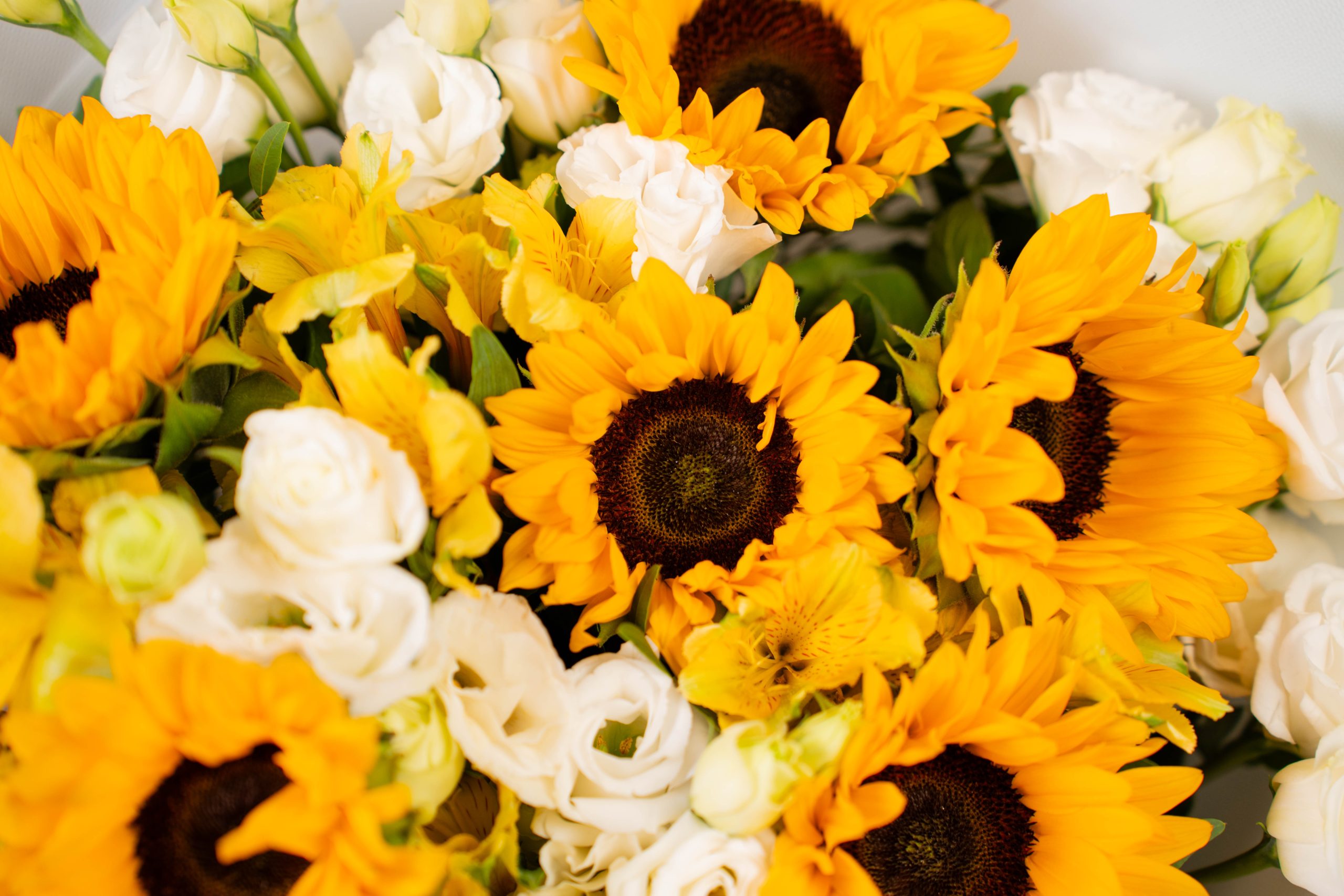 Radiant Joy is a vibrant celebration of happiness, warmth, and positive energy. This bouquet brings together bold yellow sunflowers, known for their sunny character and striking presence, with delicate white blooms that add balance, softness, and elegance. The combination creates a fresh and joyful arrangement that instantly brightens any space.