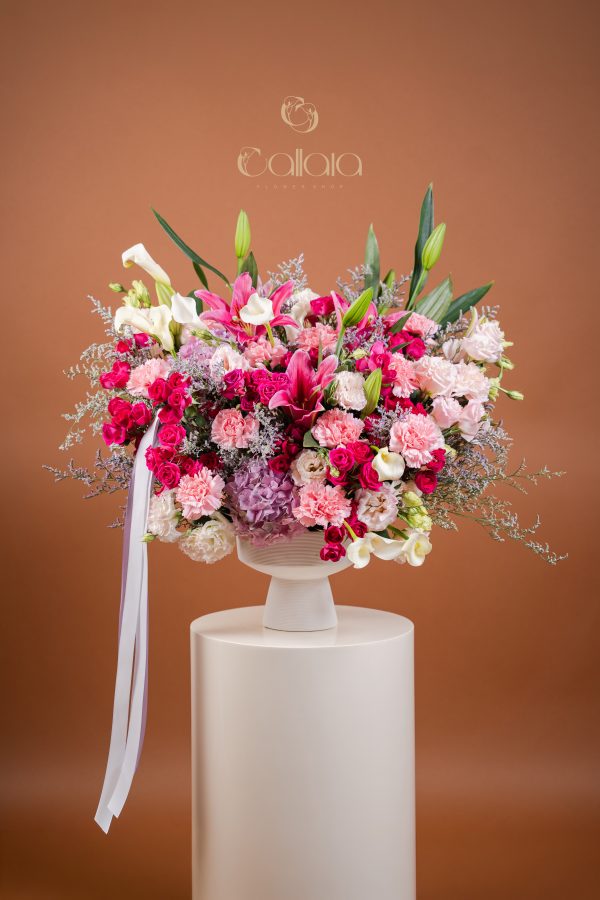 Radiant Romance is a lush and expressive arrangement of pink lilies, soft roses, and delicate pastel florals, designed in a modern ceramic vase for a bold yet romantic statement.