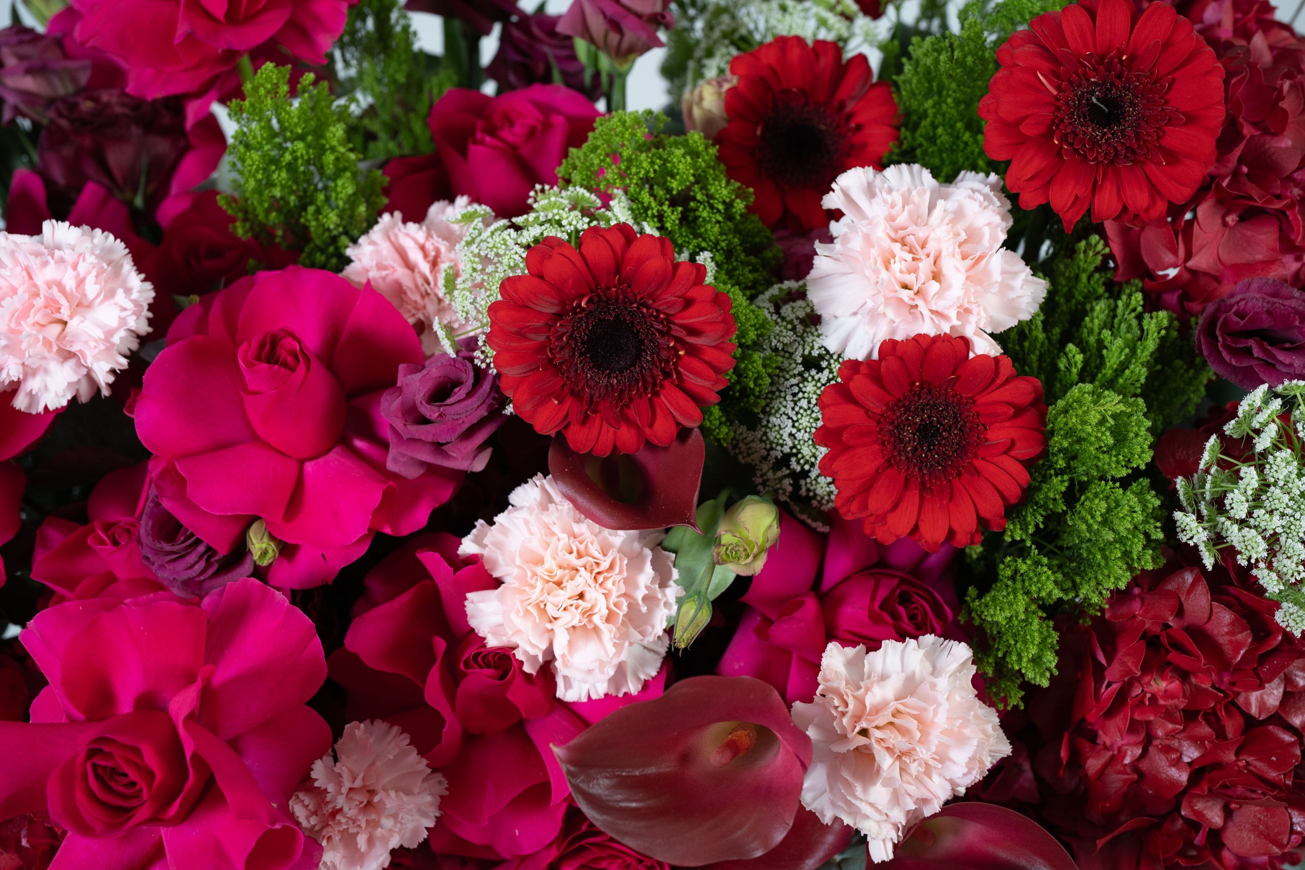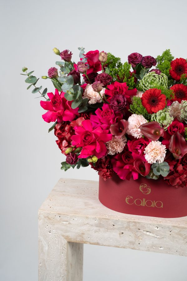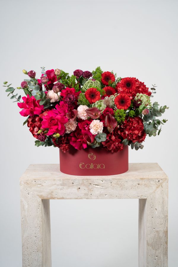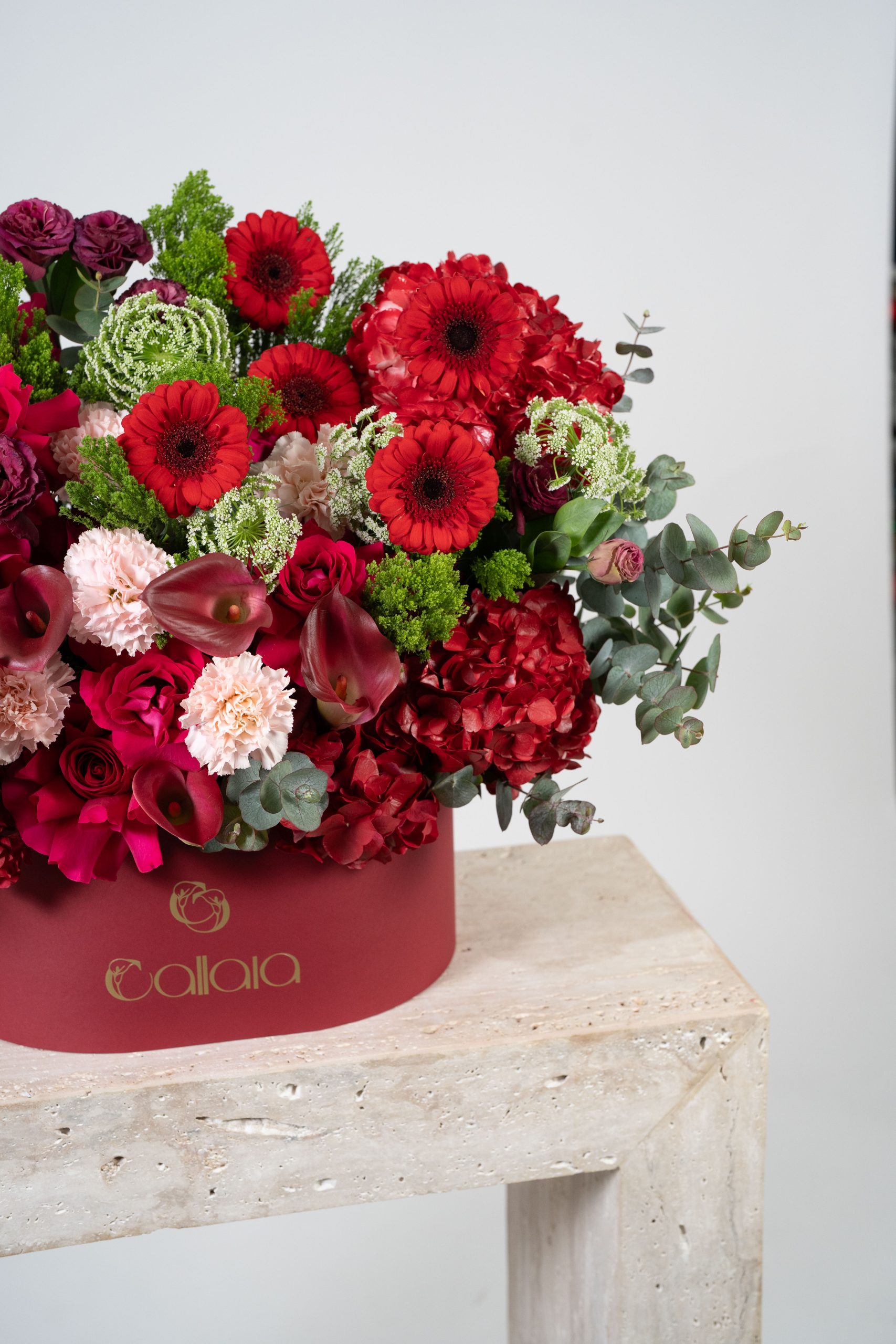 Redora is a masterpiece of bold elegance, combining rich red roses, burgundy hydrangeas, pink carnations, gerberas, and green viburnum in perfect harmony. Arranged in Callaia’s signature crimson box, this luxurious creation evokes passion, strength, and timeless romance. Ideal for anniversaries, grand gestures, or elegant celebrations, Redora captivates with its depth of color and refined composition.