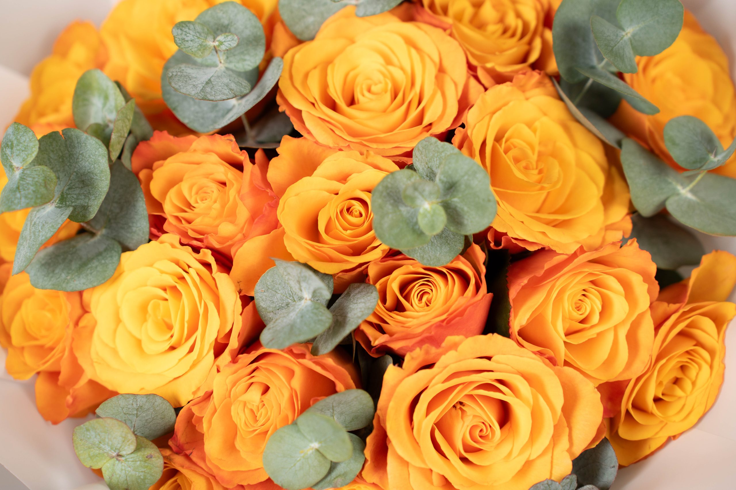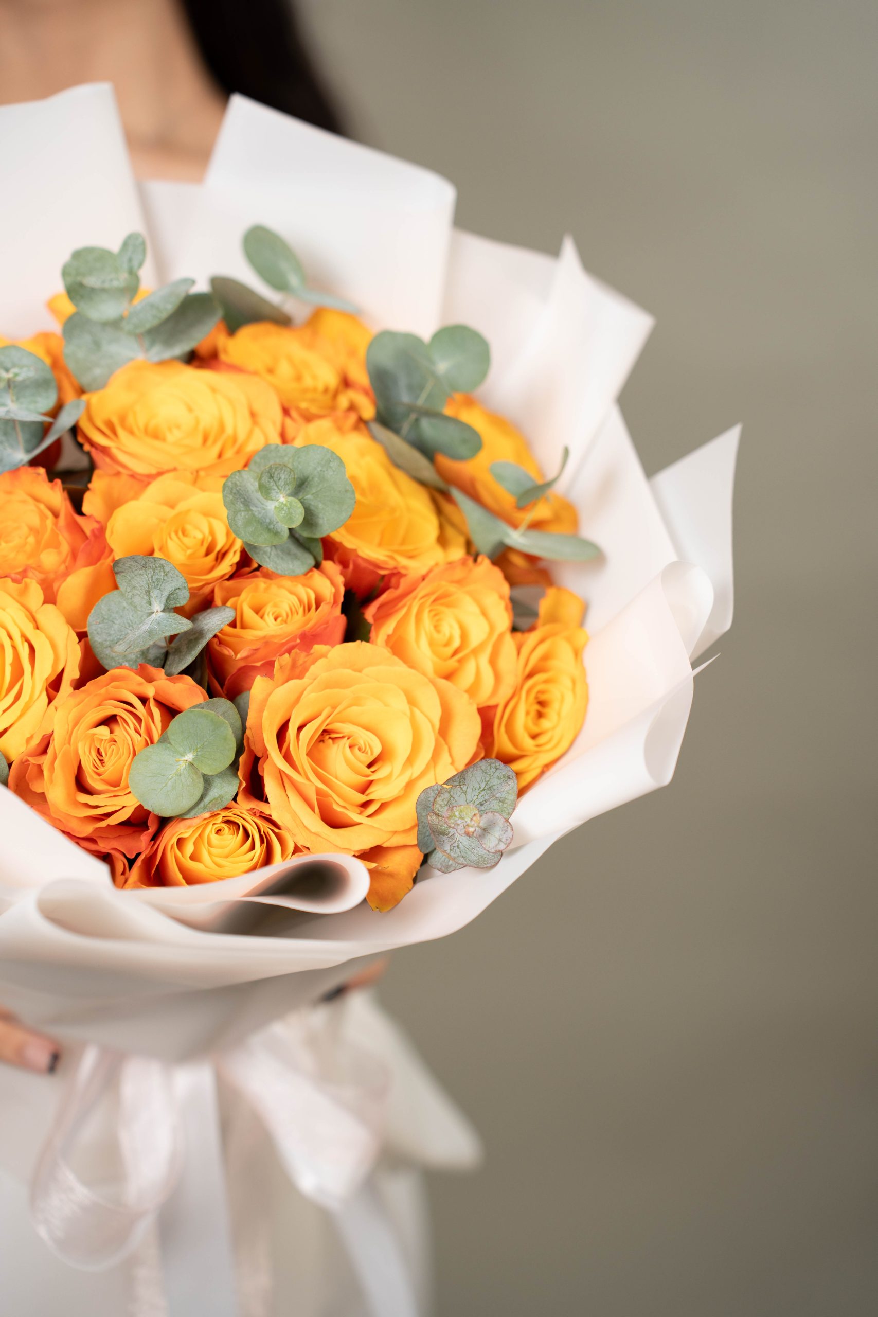 Eucalyptus leaves are placed throughout the bouquet, adding a natural green touch that complements the orange roses and gives the arrangement a fresh and balanced feel. Wrapped in white paper and finished with a soft ribbon, Rose Confidential Orange Blooms has a clean and simple presentation that highlights the beauty of the flowers.